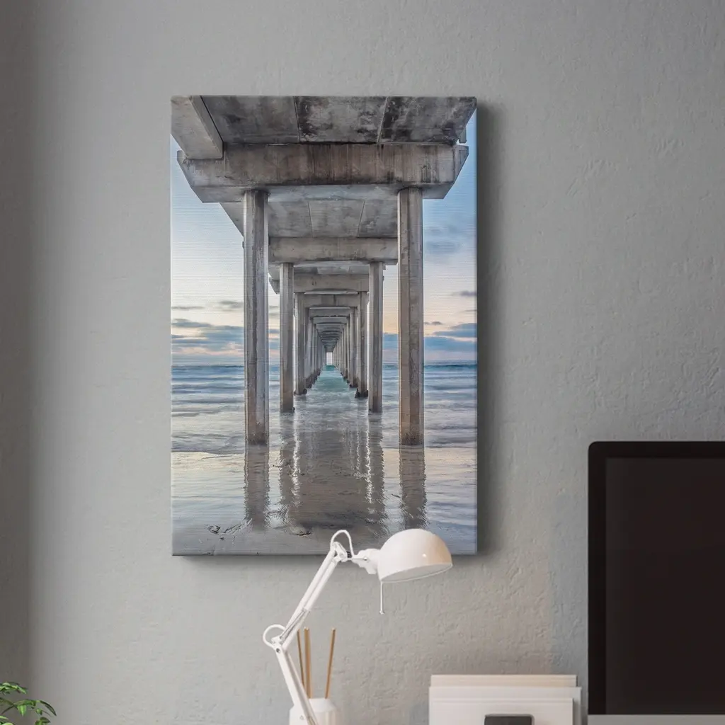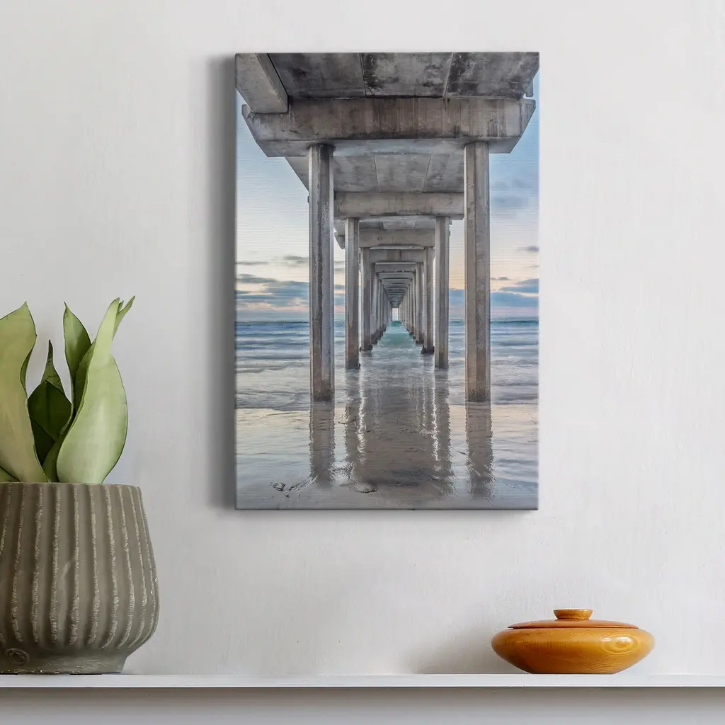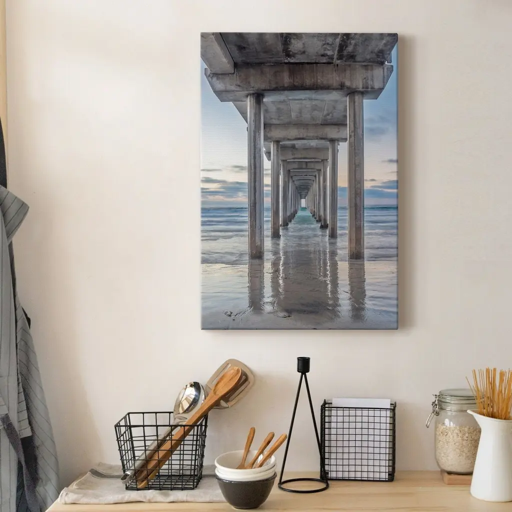 Scripps Pier Premium Gallery Wrapped Canvas - Ready to Hang A premium hand stretched gallery wrapped canvas print created to last. Featuring a beveled a solid wood stretcher bar, each piece comes ready to hand 5 SIZES AVAILABLE 8''X12'' - Overall Size 16'X20'' - Overall Size 24''x32'' - Overall Size 30''x40'' - Overall Size 36''x48'' - Overall Size Each piece is made to order. Built to Last Each piece comes ready to hang Solid wood stretcher Fade and Water resistant Made domestically