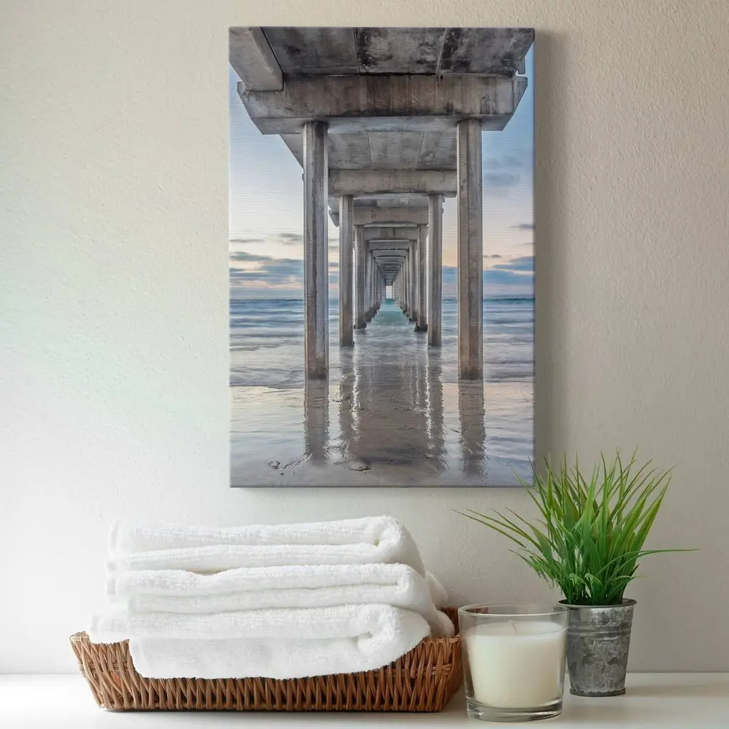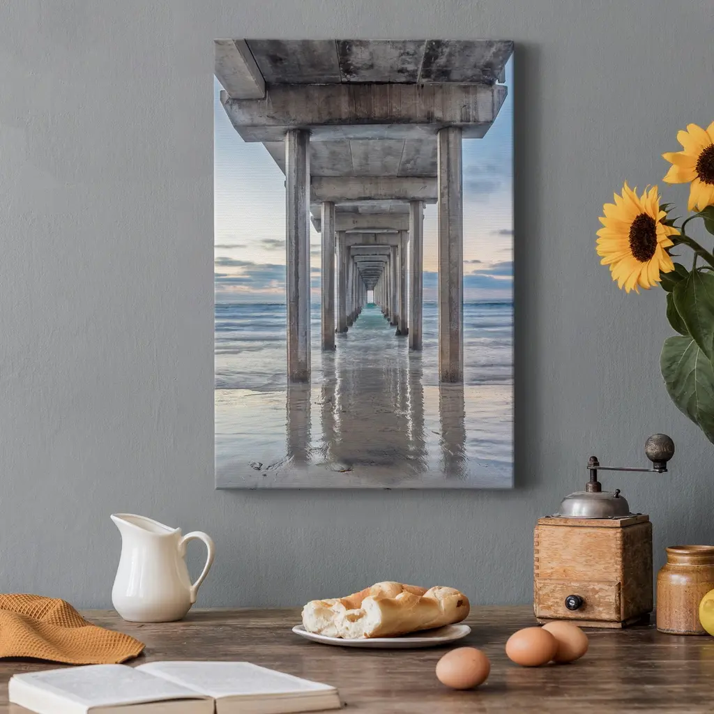 Scripps Pier Premium Gallery Wrapped Canvas - Ready to Hang A premium hand stretched gallery wrapped canvas print created to last. Featuring a beveled a solid wood stretcher bar, each piece comes ready to hand 5 SIZES AVAILABLE 8''X12'' - Overall Size 16'X20'' - Overall Size 24''x32'' - Overall Size 30''x40'' - Overall Size 36''x48'' - Overall Size Each piece is made to order. Built to Last Each piece comes ready to hang Solid wood stretcher Fade and Water resistant Made domestically