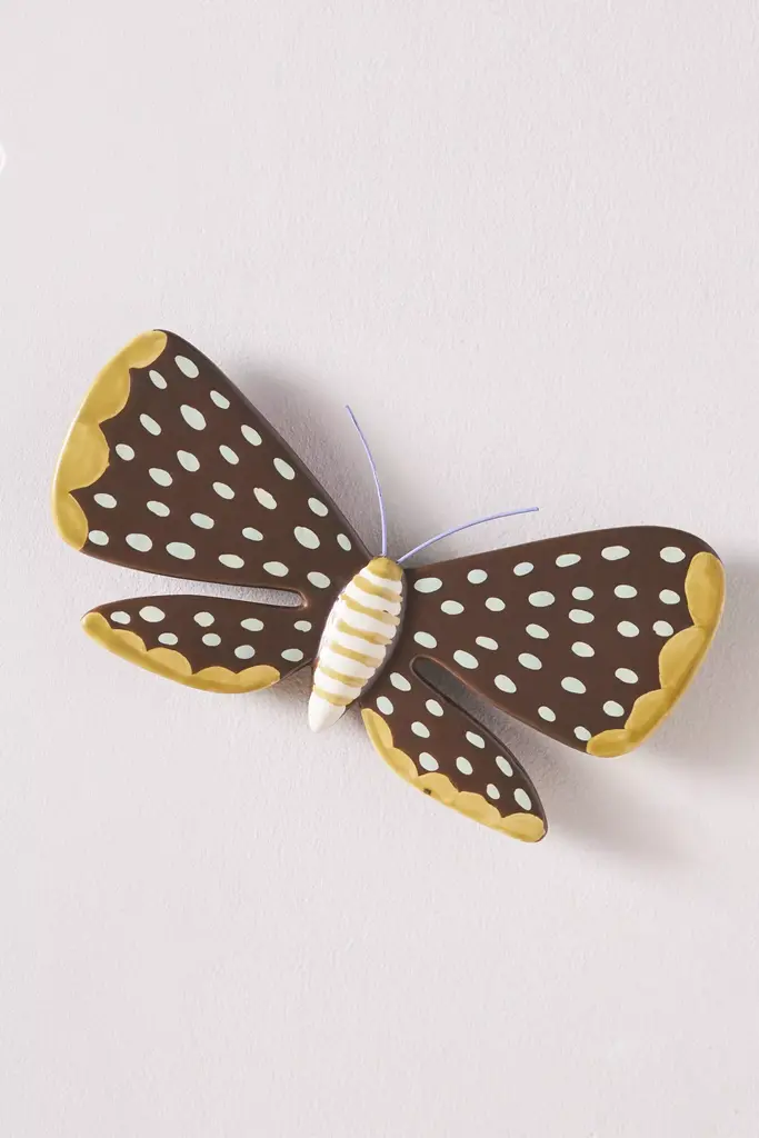 This stunning Luna Moth ceramic piece features a painted metal antenna and intricate handpainted detailing on the wings & body. This art piece coordinates beautifully with the other spotted and striped moths for a playful yet elevated design on a gallery wall.