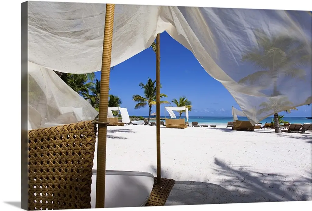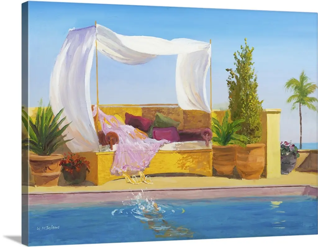 Contemporary painting of a relaxing veranda on a white sand beach with beautiful blue water in the distance.