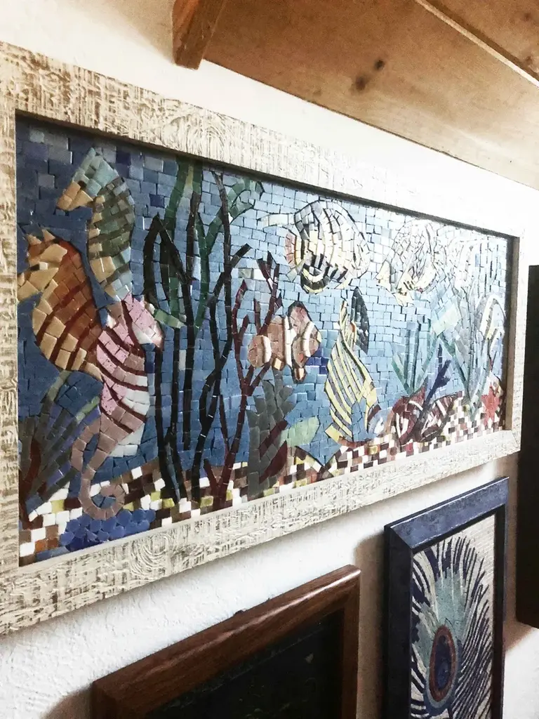 Introducing the stunning "Sea Creatures In Aquarium Glass Mosaic," a captivating piece that brings the wonders of the ocean right into your home. This exquisite glass mosaic showcases an array of vibrant sea creatures, all set against a backdrop of beautiful blue hues that evoke the serene depths of the sea. Imagine transforming your space with this artistic representation of marine life, perfect for creating a tranquil atmosphere in pools, bathrooms, or any nautical-themed area. The intricate design features an assortment of fascinating sea creatures, each meticulously crafted to capture the essence of underwater beauty. From playful fish to elegant sea turtles, this mosaic celebrates the diverse life found in ocean habitats.Not only does this glass mosaic serve as a striking decoration, but it also symbolizes the serenity and mystery of the underwater world. Its soothing color palette allows it to blend seamlessly with various decor styles, making it an ideal choice for those looking to enhance their home or outdoor oasis. Whether you are designing a themed room, a freshening up your poolside space, or simply seeking a unique artwork, the "Sea Creatures In Aquarium Glass Mosaic" will add a touch of elegance and charm.Crafted with durable glass materials, this mosaic is built to last and withstand the elements, making it suitable for both indoor and outdoor placements. Bring the beauty of the ocean into your life – make the "Sea Creatures In Aquarium Glass Mosaic" a centerpiece in your space today! Enjoy the peaceful ambiance it creates while sparking conversations about the wonders of marine life. Experience the allure of the sea, beautifully captured in a work of art that celebrates the richness of nature.