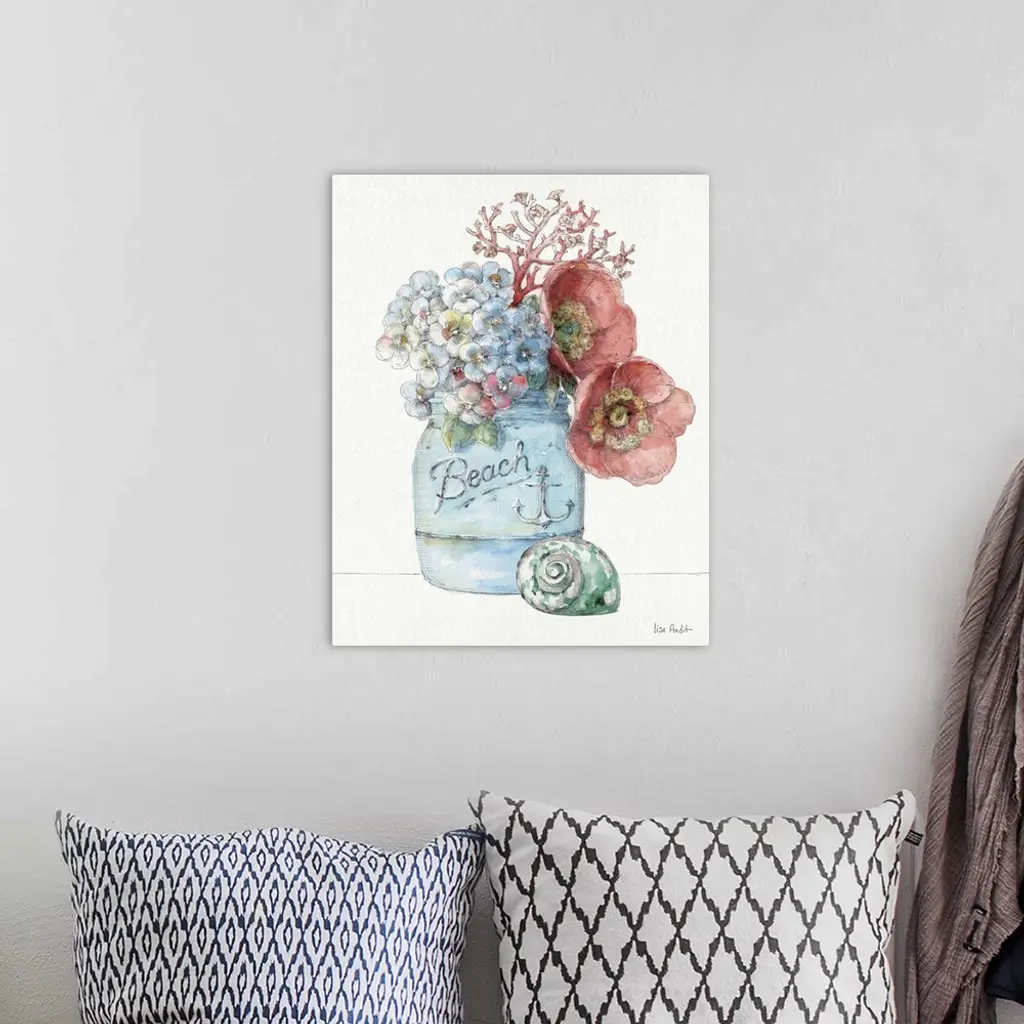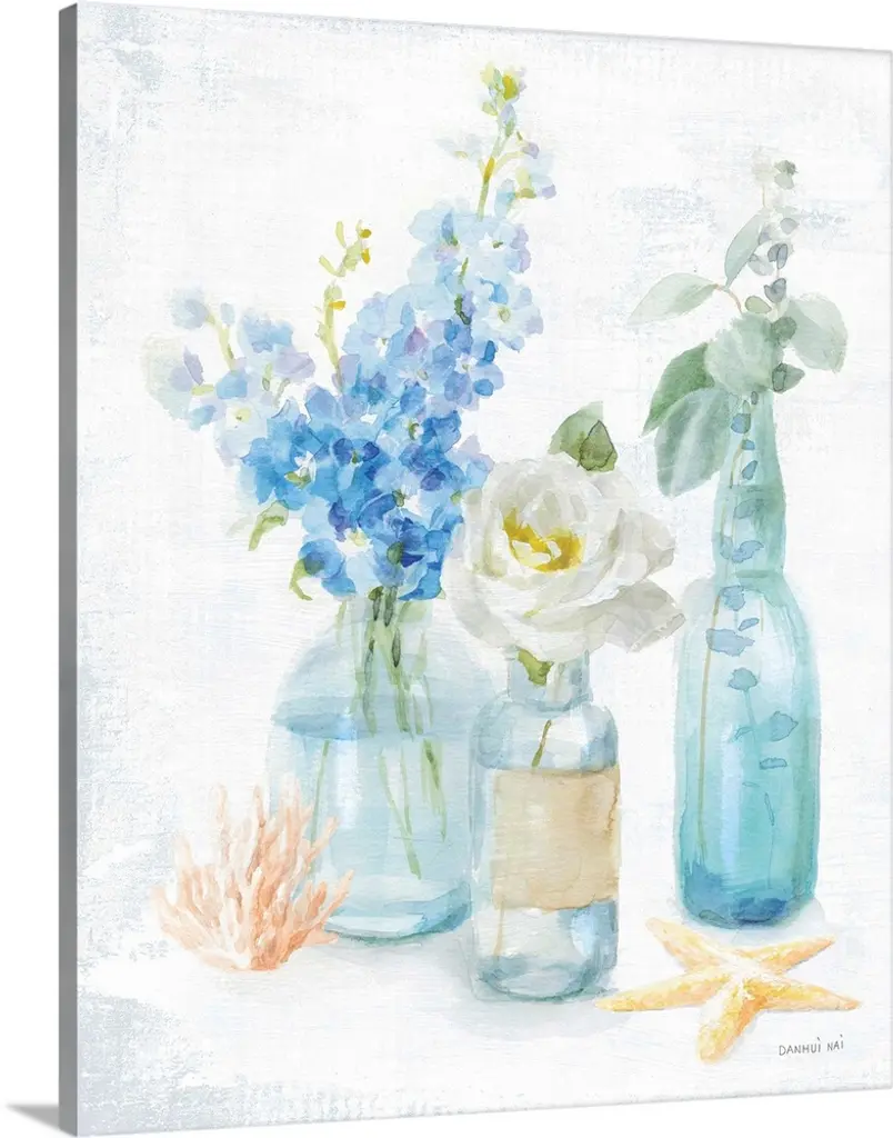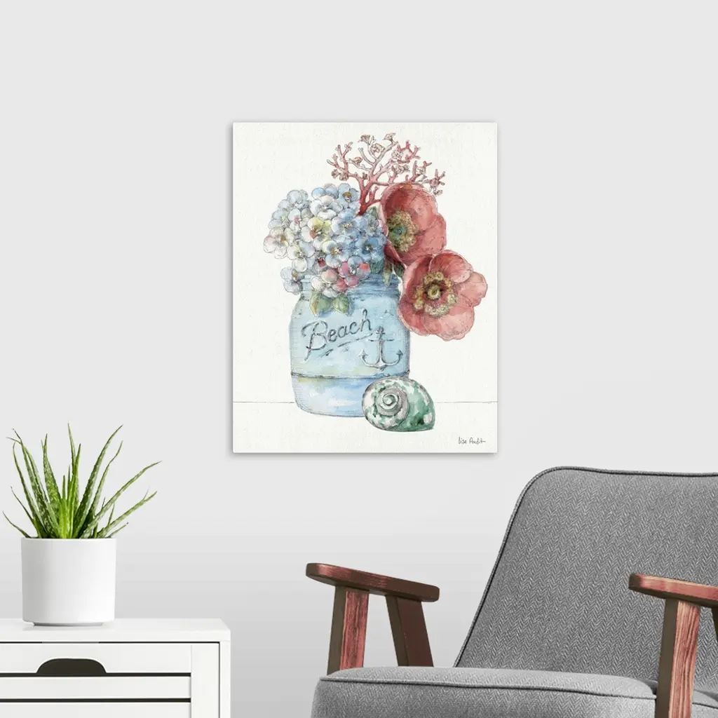 Watercolor artwork of flowers in a mason jar with a seashell sitting next to it.