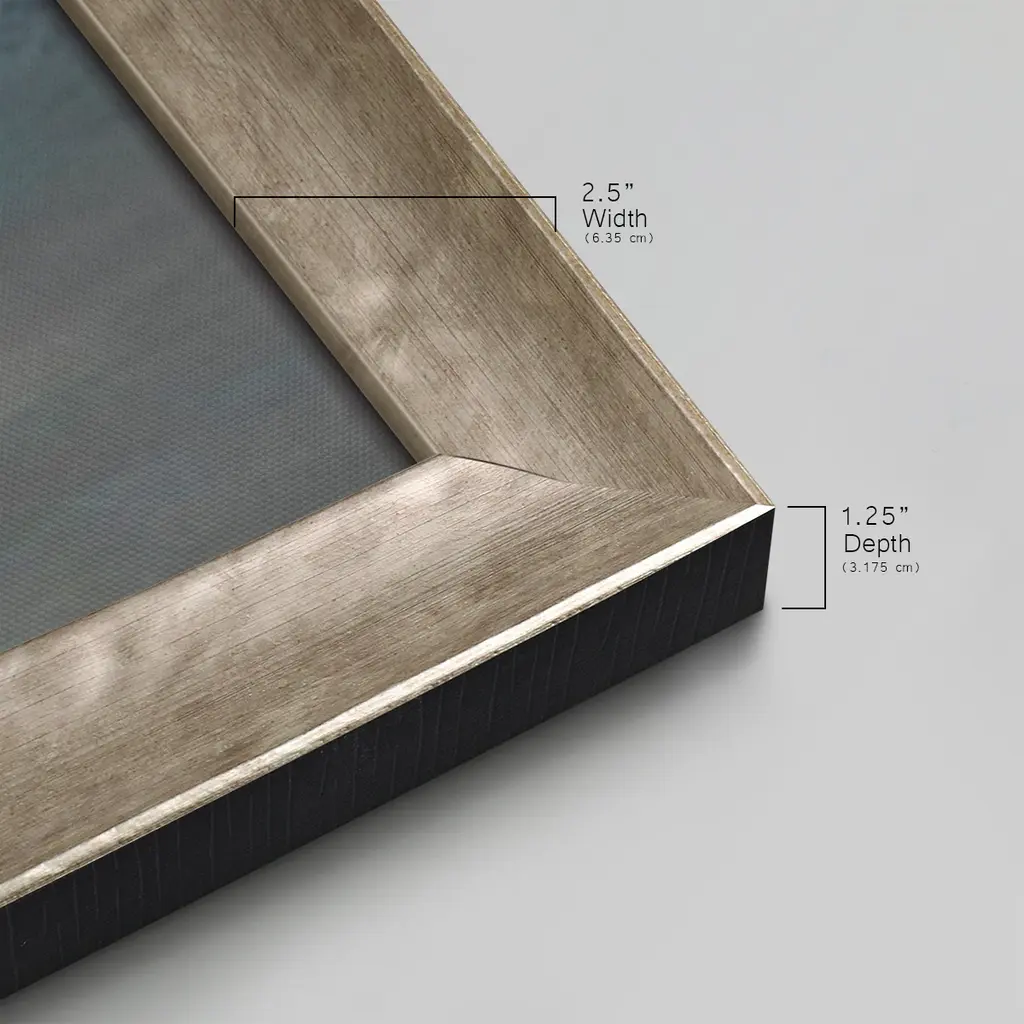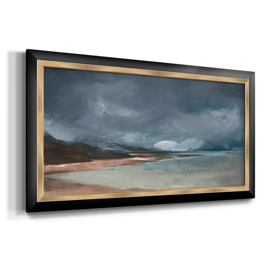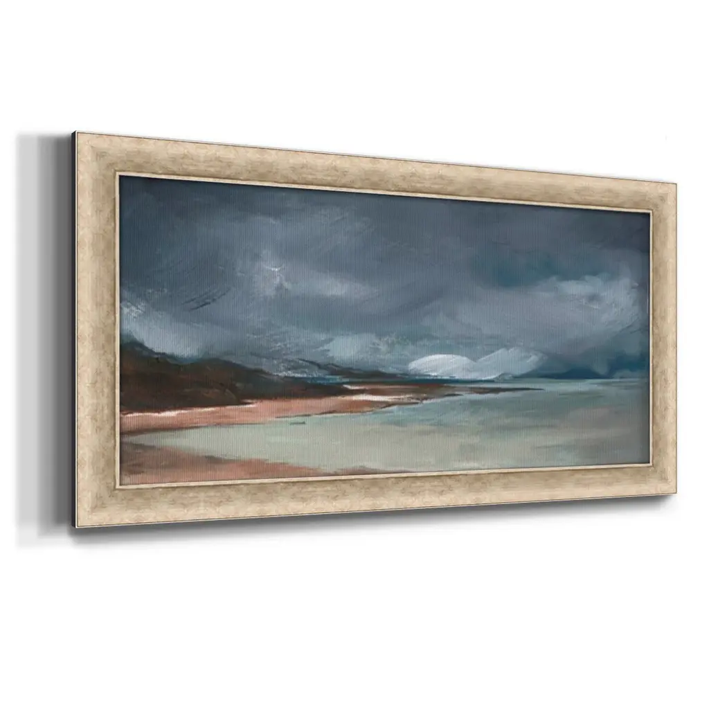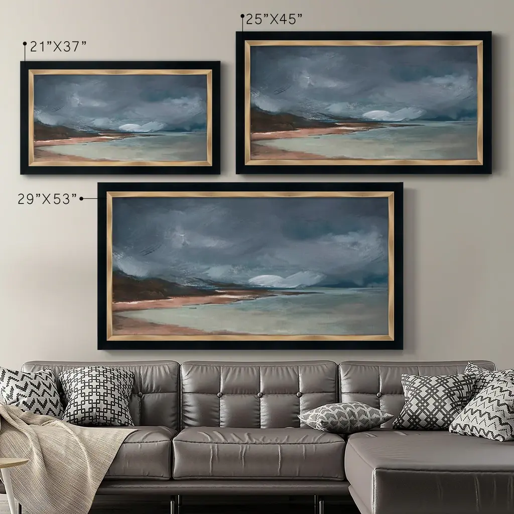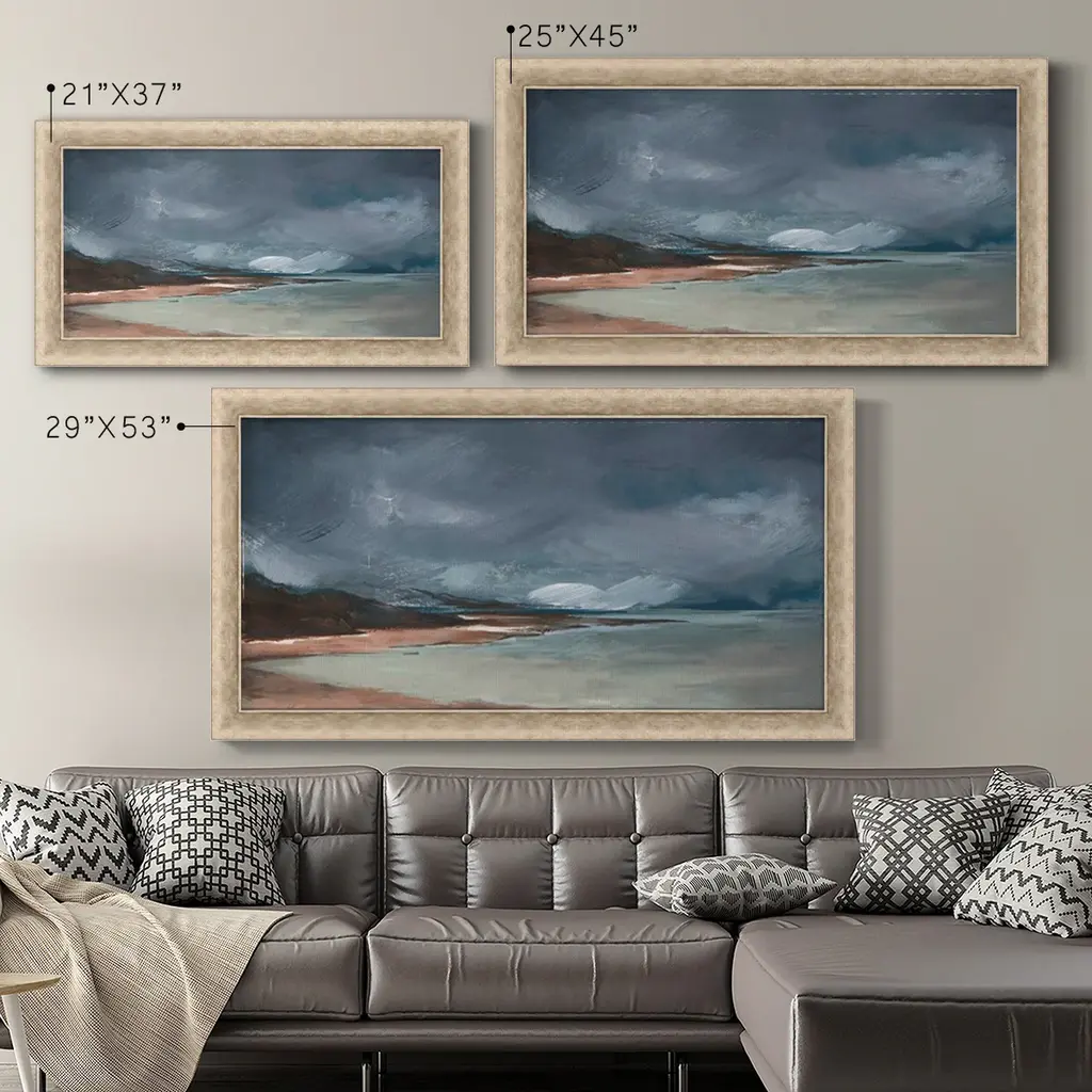 Sea Glass Storm III Premium Framed Canvas- Ready to Hang A Premium Framed Canvas created to last. Framed in distressed wood and available in an array of sizes and colors Featuring a beveled a solid wood stretcher bar, each piece comes ready to hand 3 SIZES AVAILABLE 21''X37'' - Overall Size 25''X45'' - Overall Size 29''x53'' - Overall Size Each piece is made to order. Each piece comes with hanging hardware. Made in the USA Ready to Hang Giclee Paper Print Acrylic Glass Beveled Matt Board