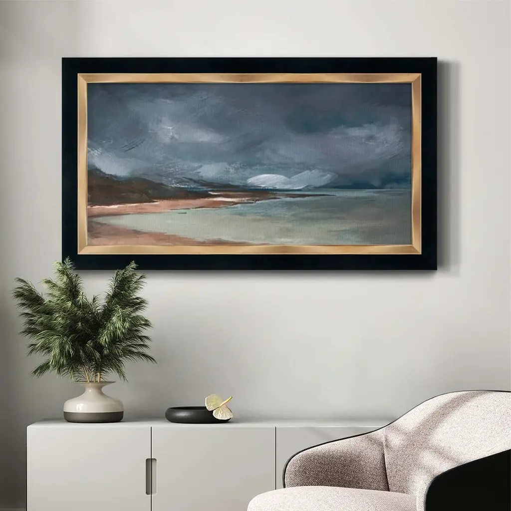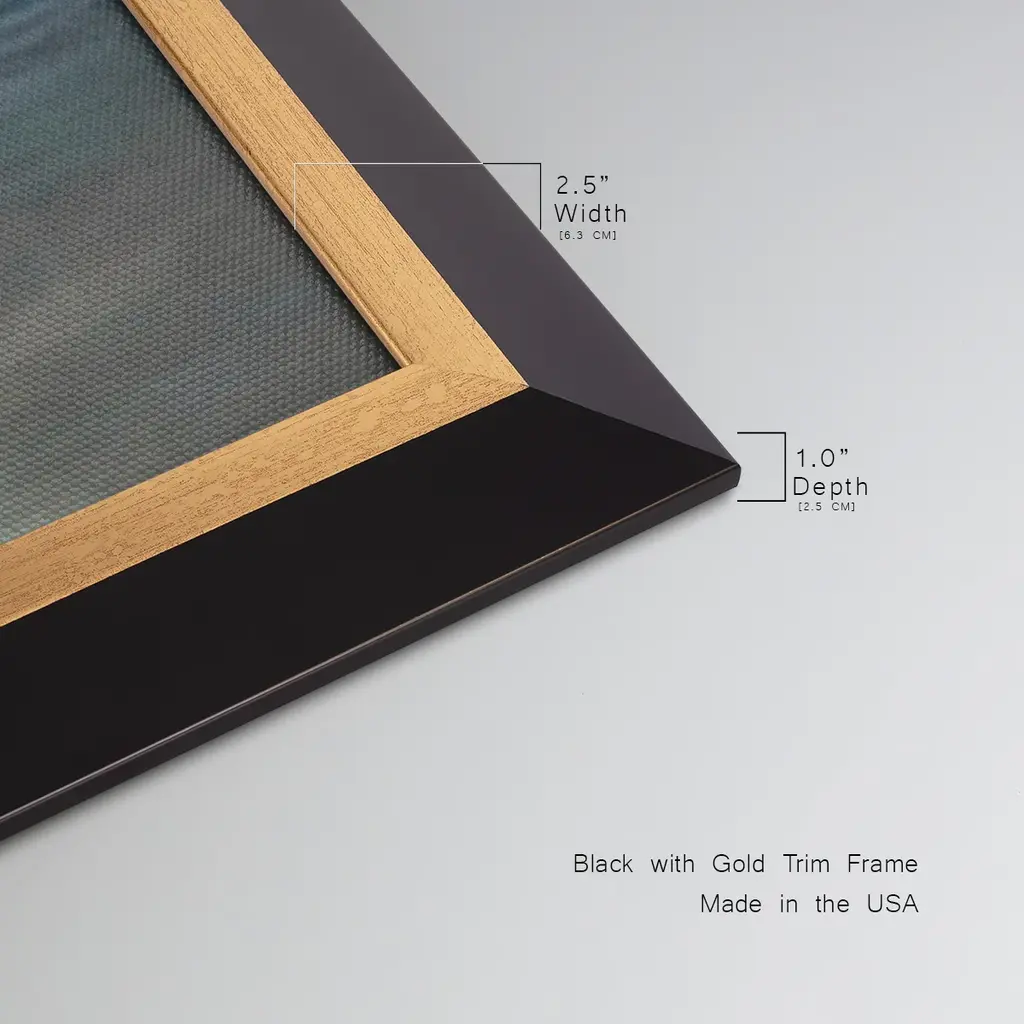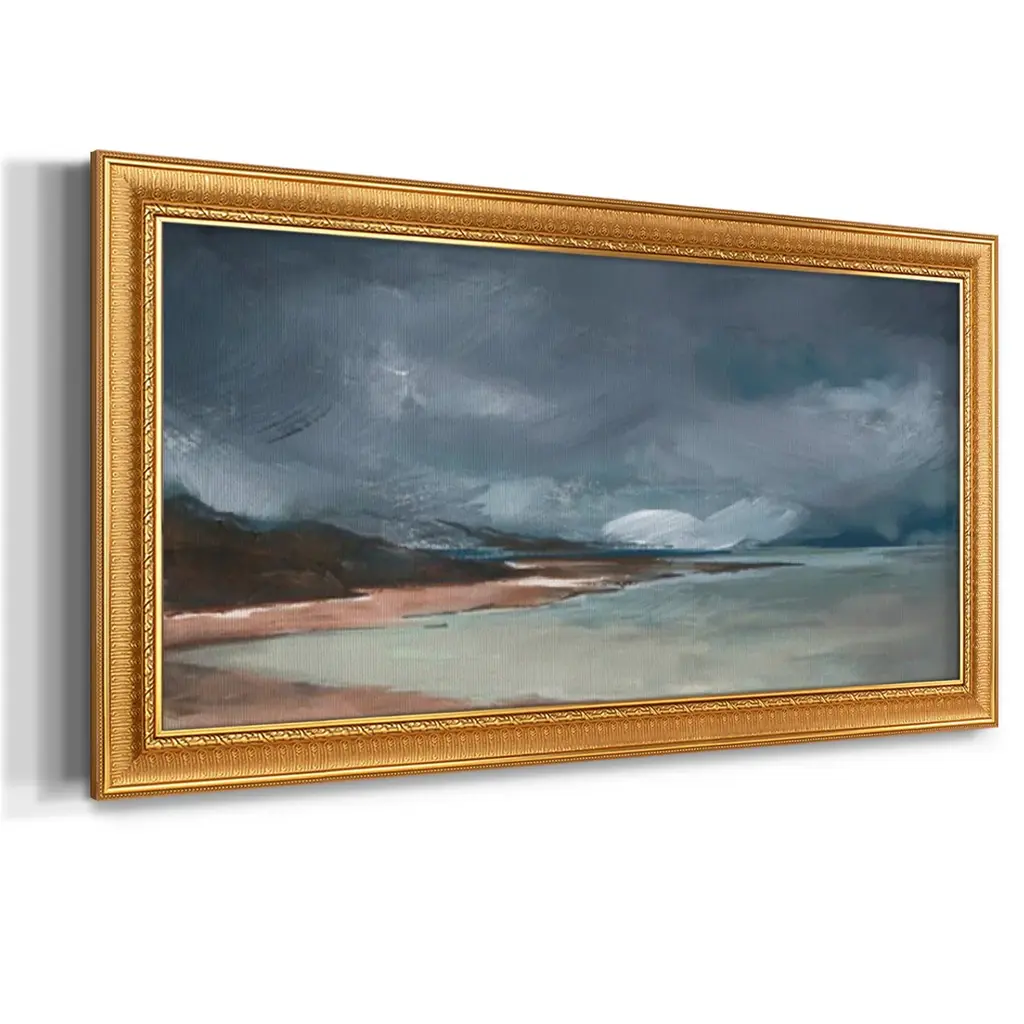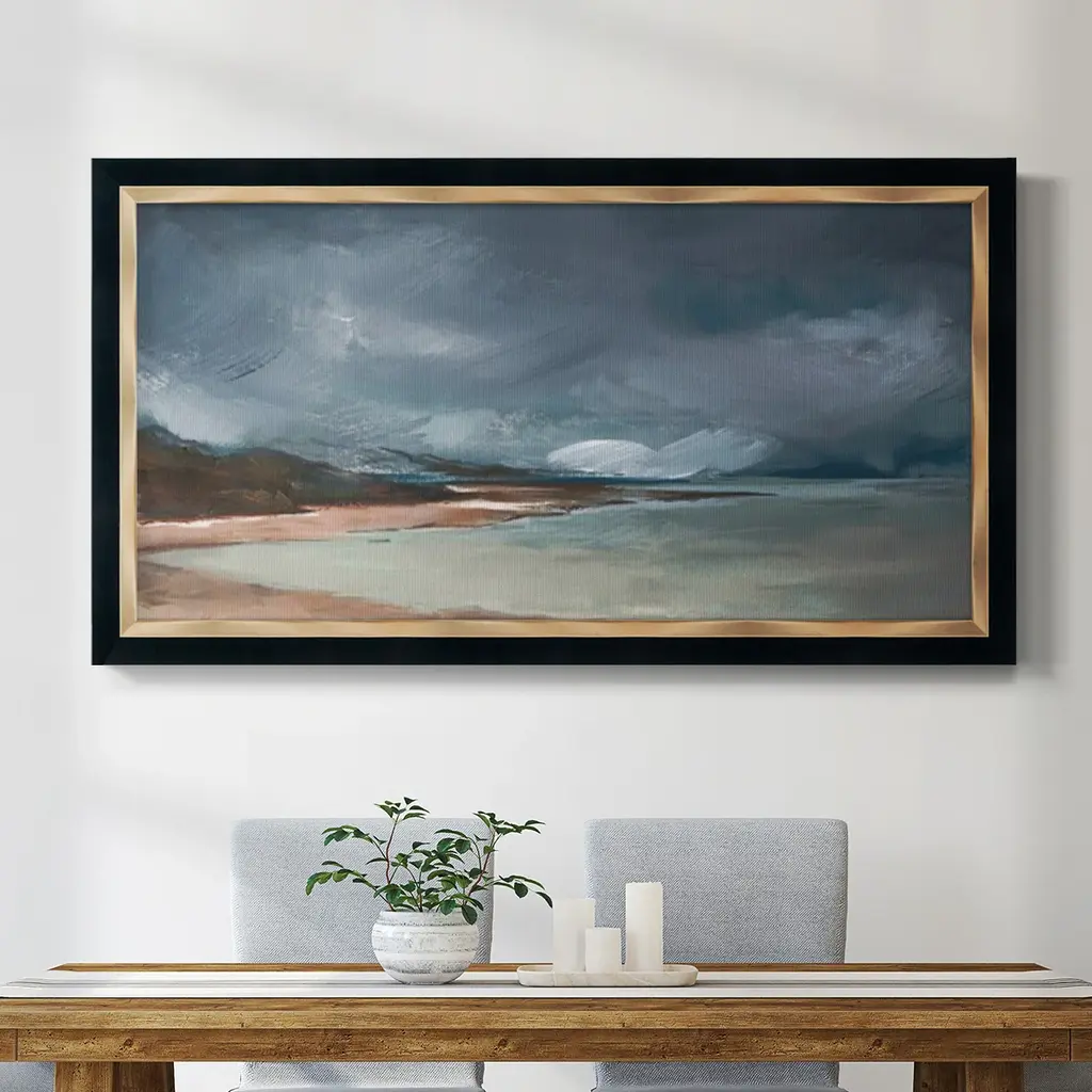 Sea Glass Storm III Premium Framed Canvas- Ready to Hang A Premium Framed Canvas created to last. Framed in distressed wood and available in an array of sizes and colors Featuring a beveled a solid wood stretcher bar, each piece comes ready to hand 3 SIZES AVAILABLE 21''X37'' - Overall Size 25''X45'' - Overall Size 29''x53'' - Overall Size Each piece is made to order. Each piece comes with hanging hardware. Made in the USA Ready to Hang Giclee Paper Print Acrylic Glass Beveled Matt Board