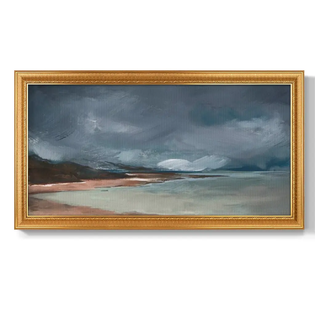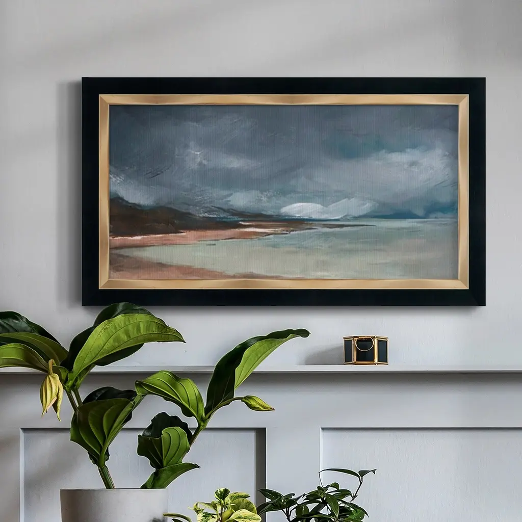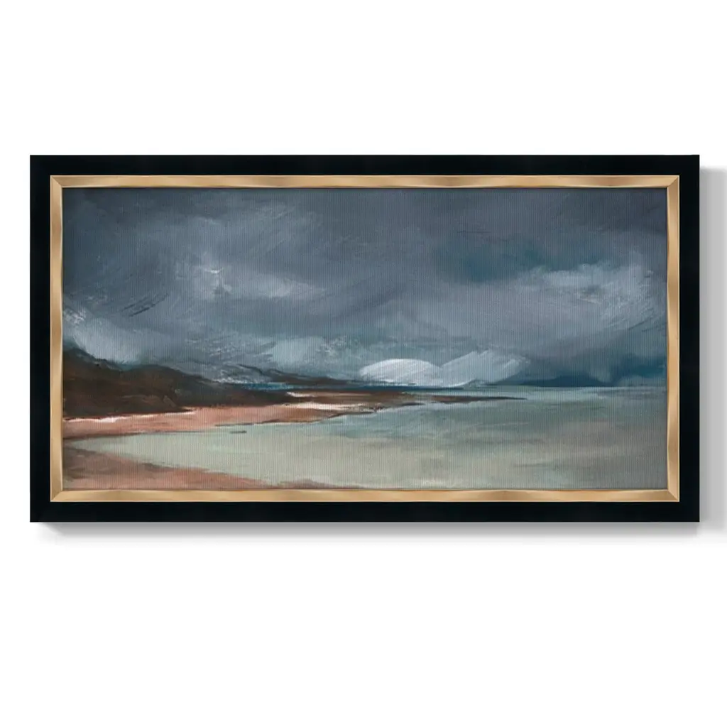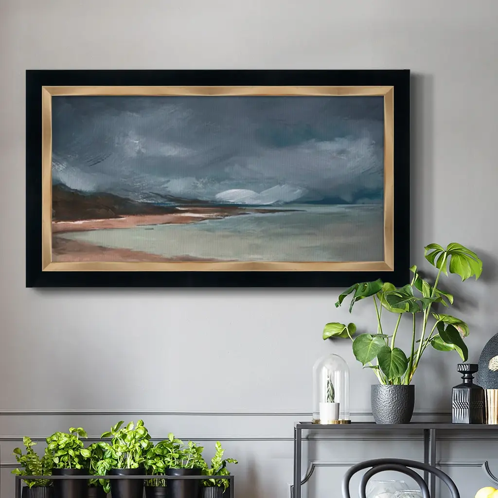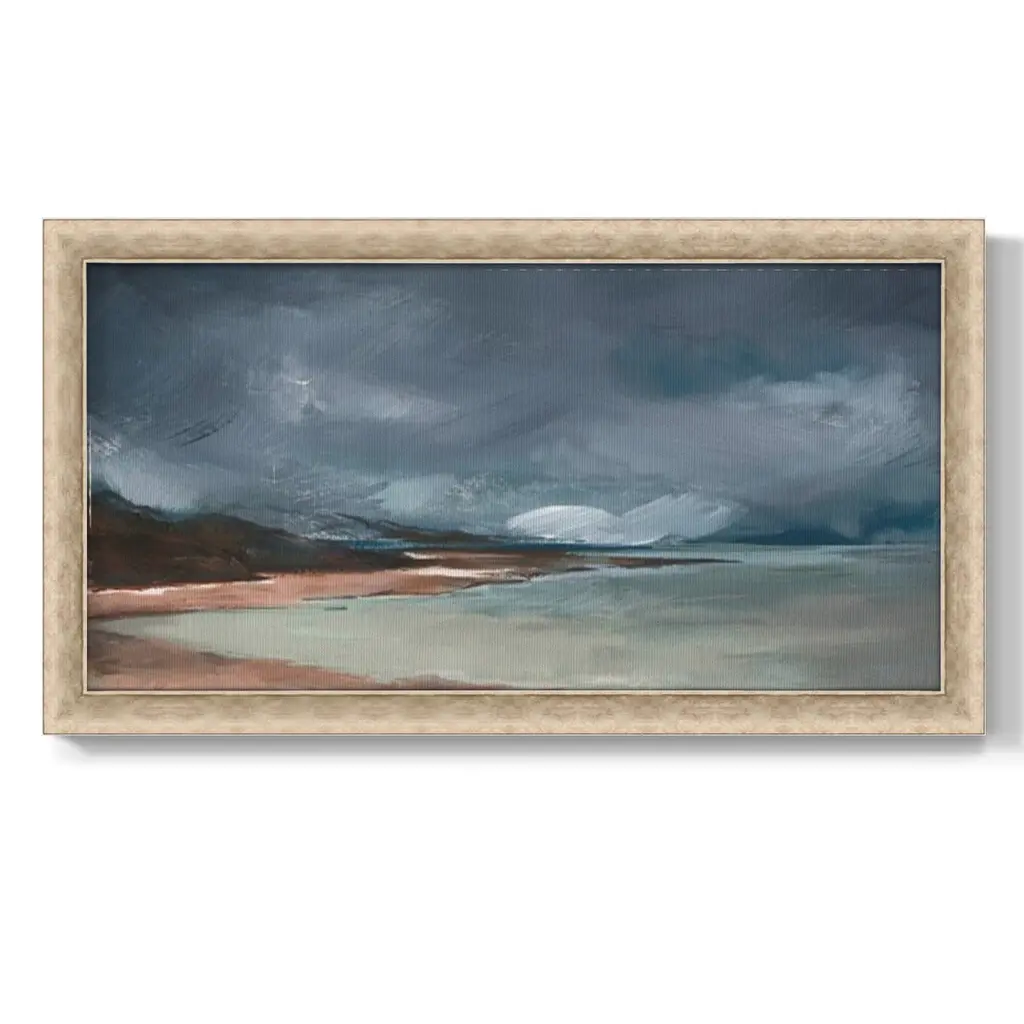 Sea Glass Storm III Premium Framed Canvas- Ready to Hang A Premium Framed Canvas created to last. Framed in distressed wood and available in an array of sizes and colors Featuring a beveled a solid wood stretcher bar, each piece comes ready to hand 3 SIZES AVAILABLE 21''X37'' - Overall Size 25''X45'' - Overall Size 29''x53'' - Overall Size Each piece is made to order. Each piece comes with hanging hardware. Made in the USA Ready to Hang Giclee Paper Print Acrylic Glass Beveled Matt Board
