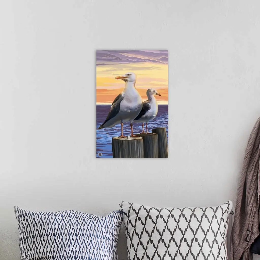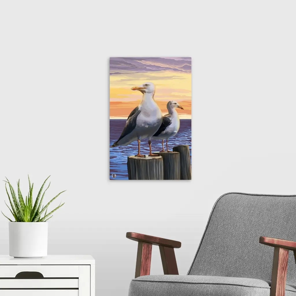 Retro stylized art poster of two seagulls perched on wooden poles.