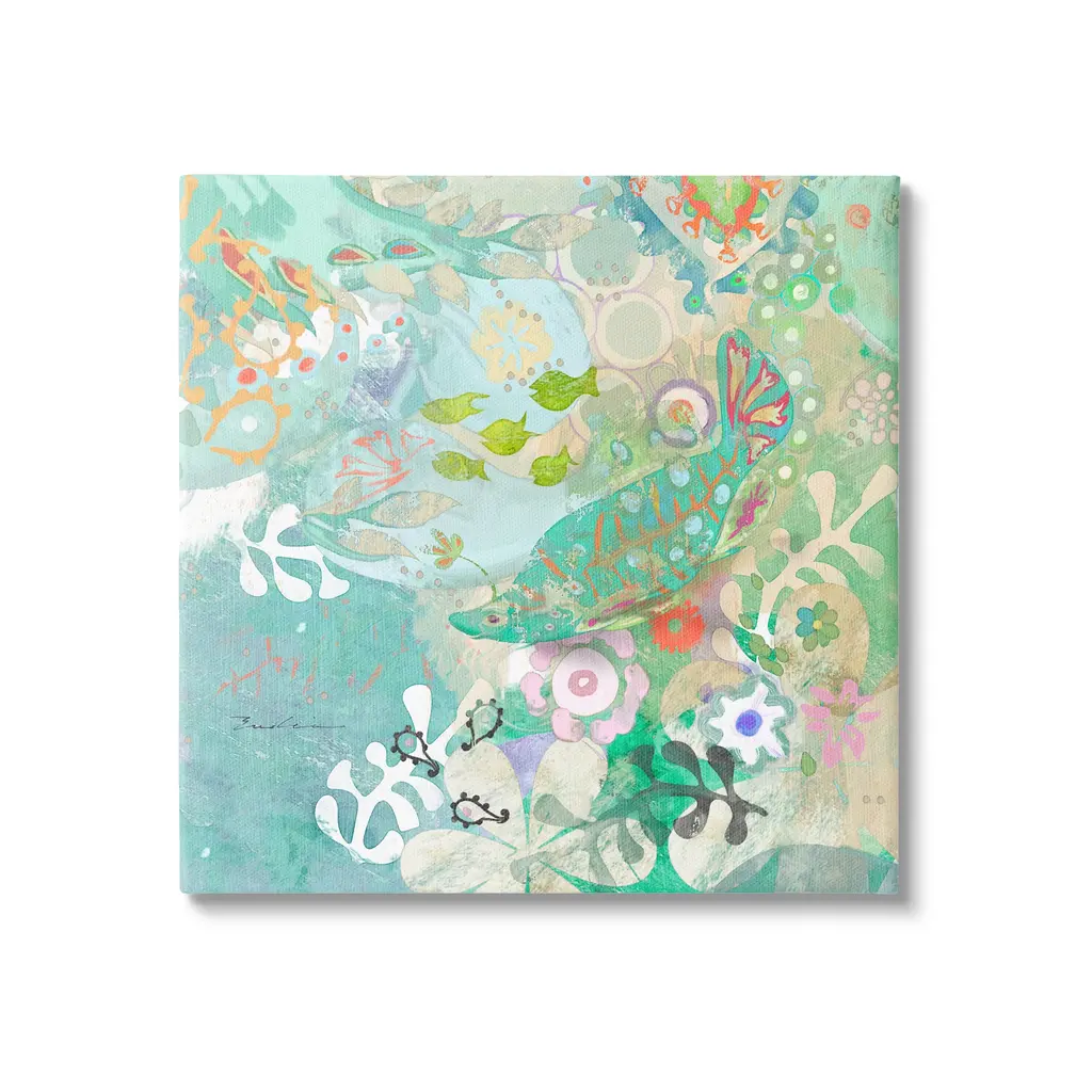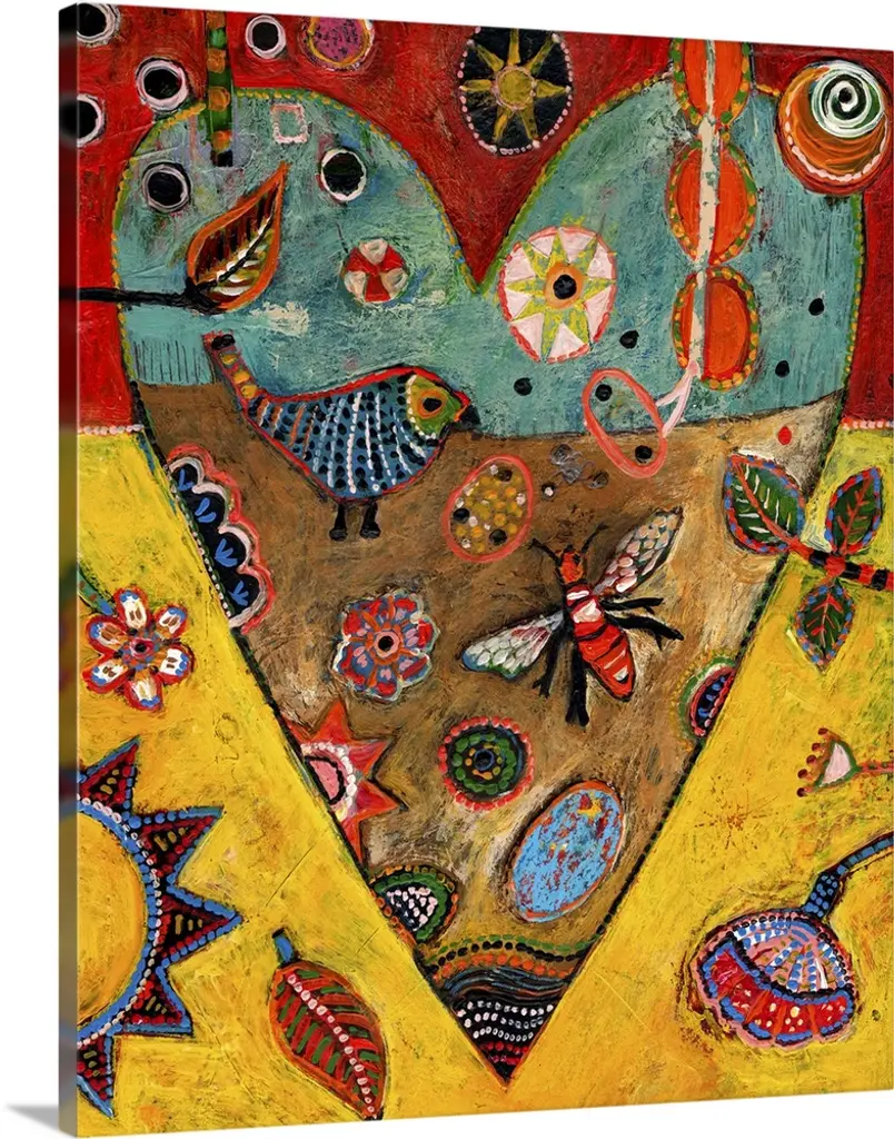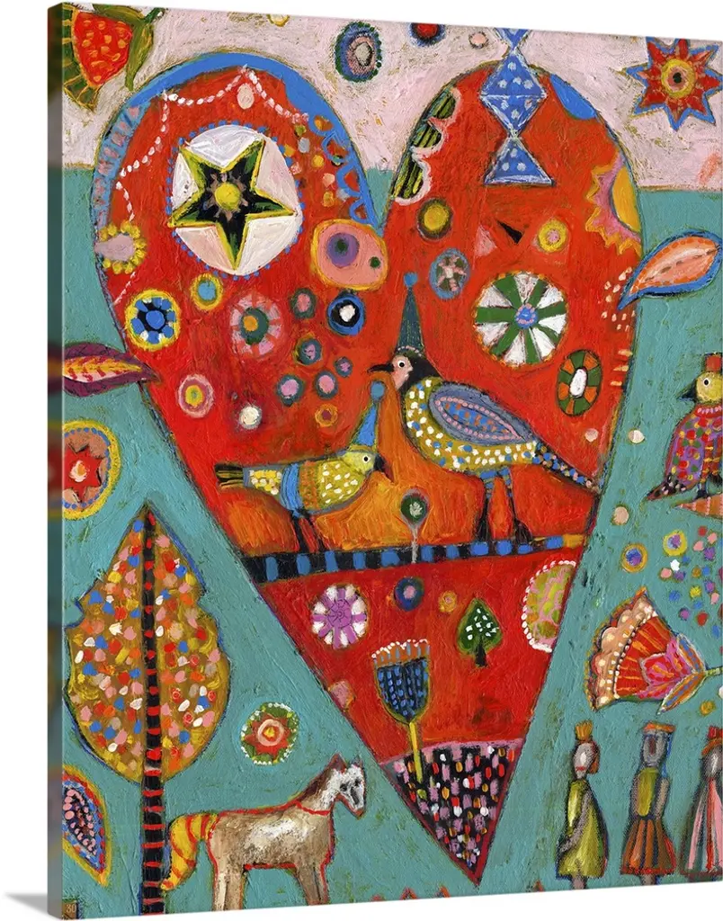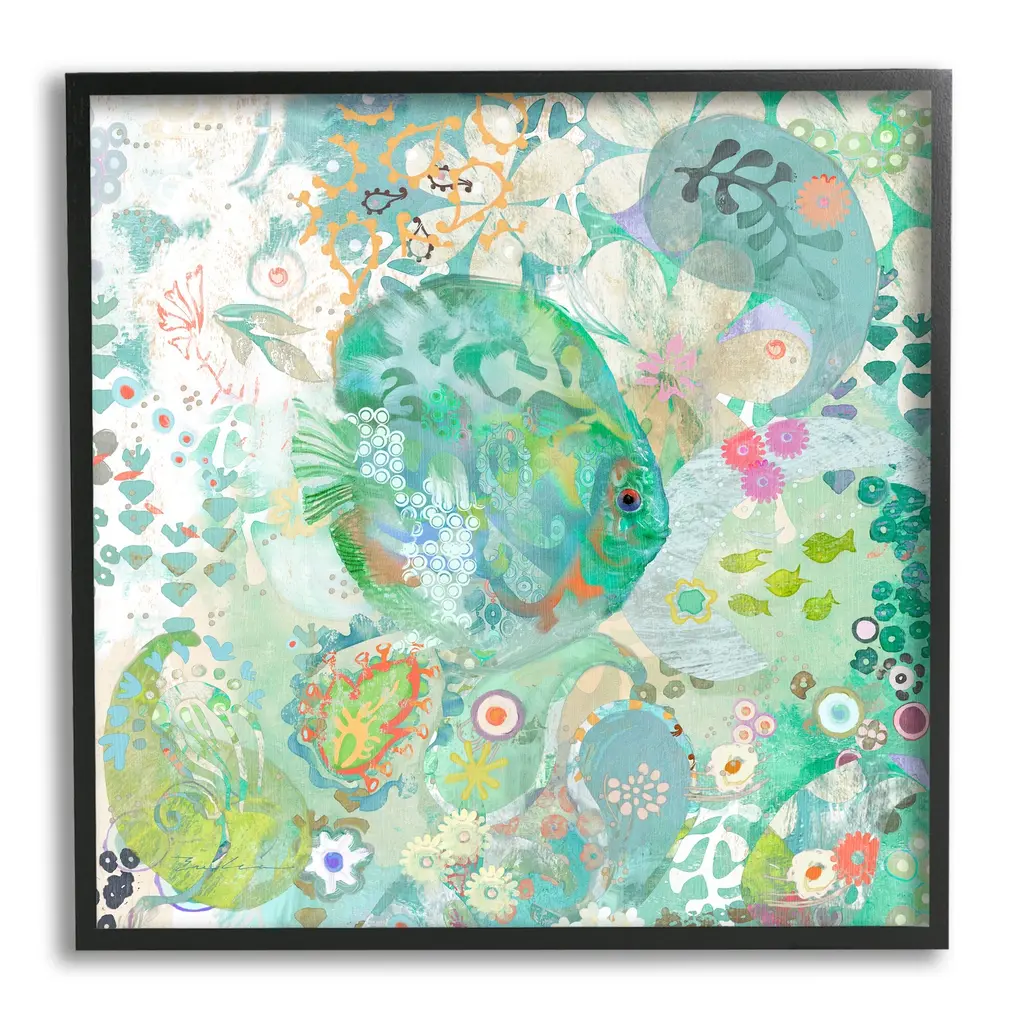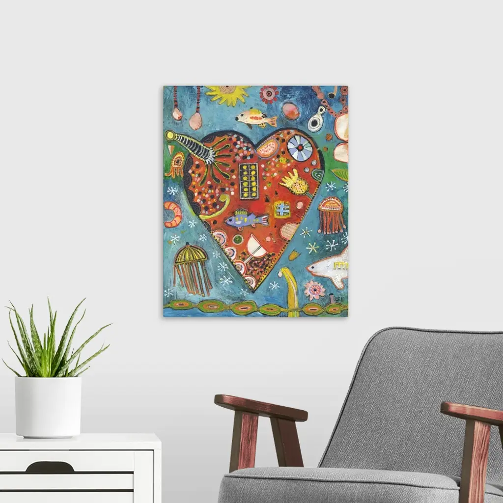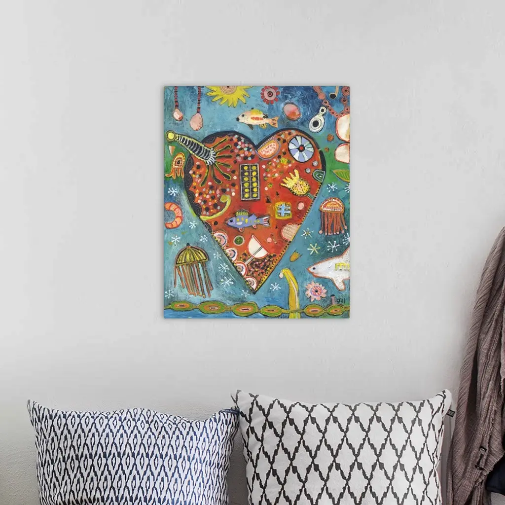 Lighthearted contemporary painting of a heart with a collage of marine life inside.