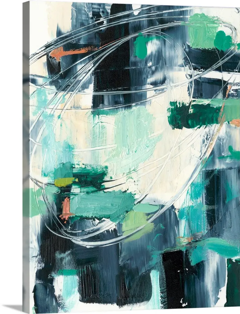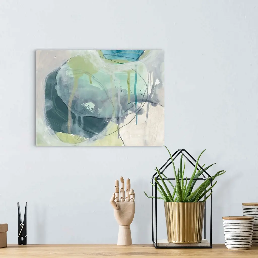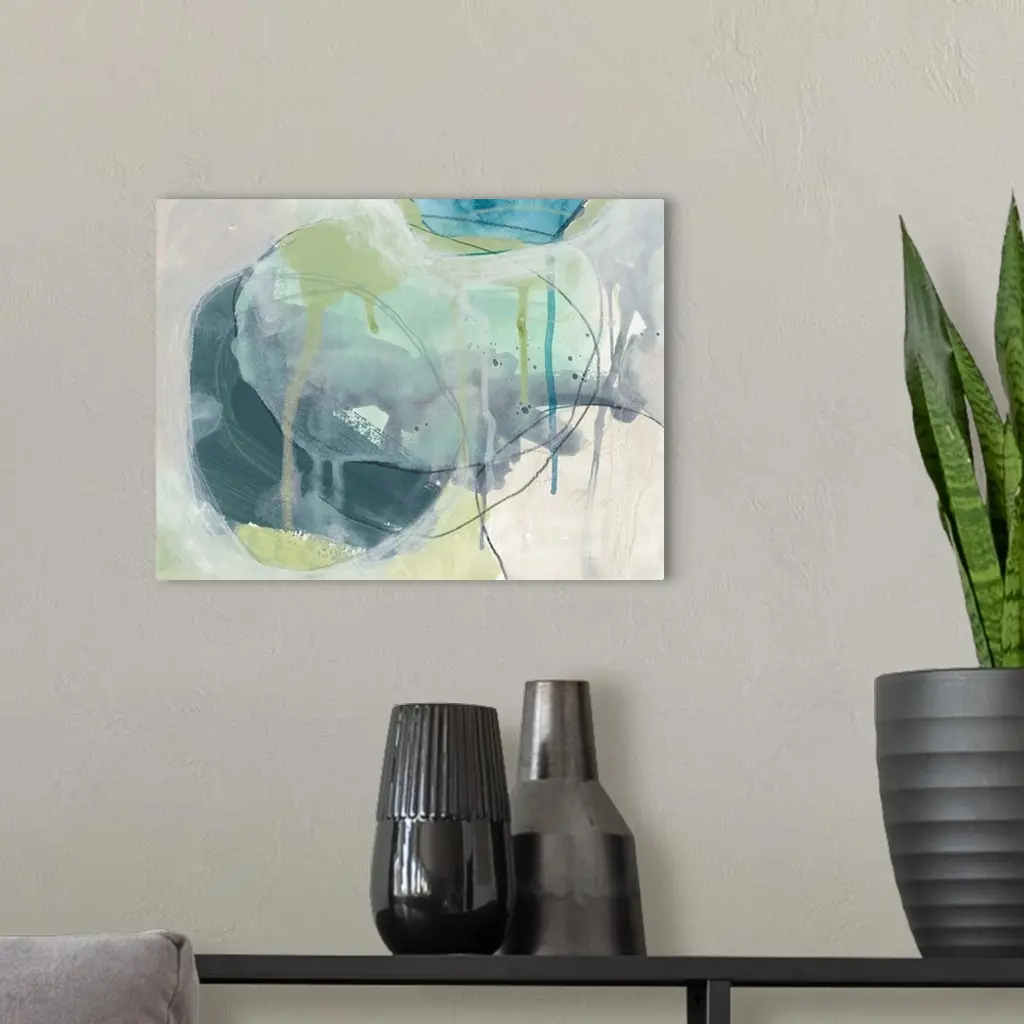 Contemporary abstract painting of ovular, stone-like shapes in blue and green hues reminiscent of the sea.