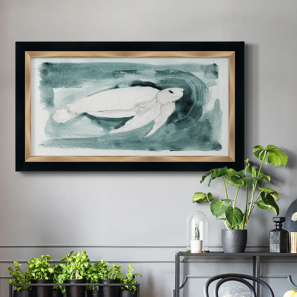 Sea Turtle Searching I Premium Framed Canvas- Ready to Hang A Premium Framed Canvas created to last. Framed in distressed wood and available in an array of sizes and colors Featuring a beveled a solid wood stretcher bar, each piece comes ready to hand 3 SIZES AVAILABLE 21''X37'' - Overall Size 25''X45'' - Overall Size 29''x53'' - Overall Size Each piece is made to order. Each piece comes with hanging hardware. Made in the USA Ready to Hang Giclee Paper Print Acrylic Glass Beveled Matt Board