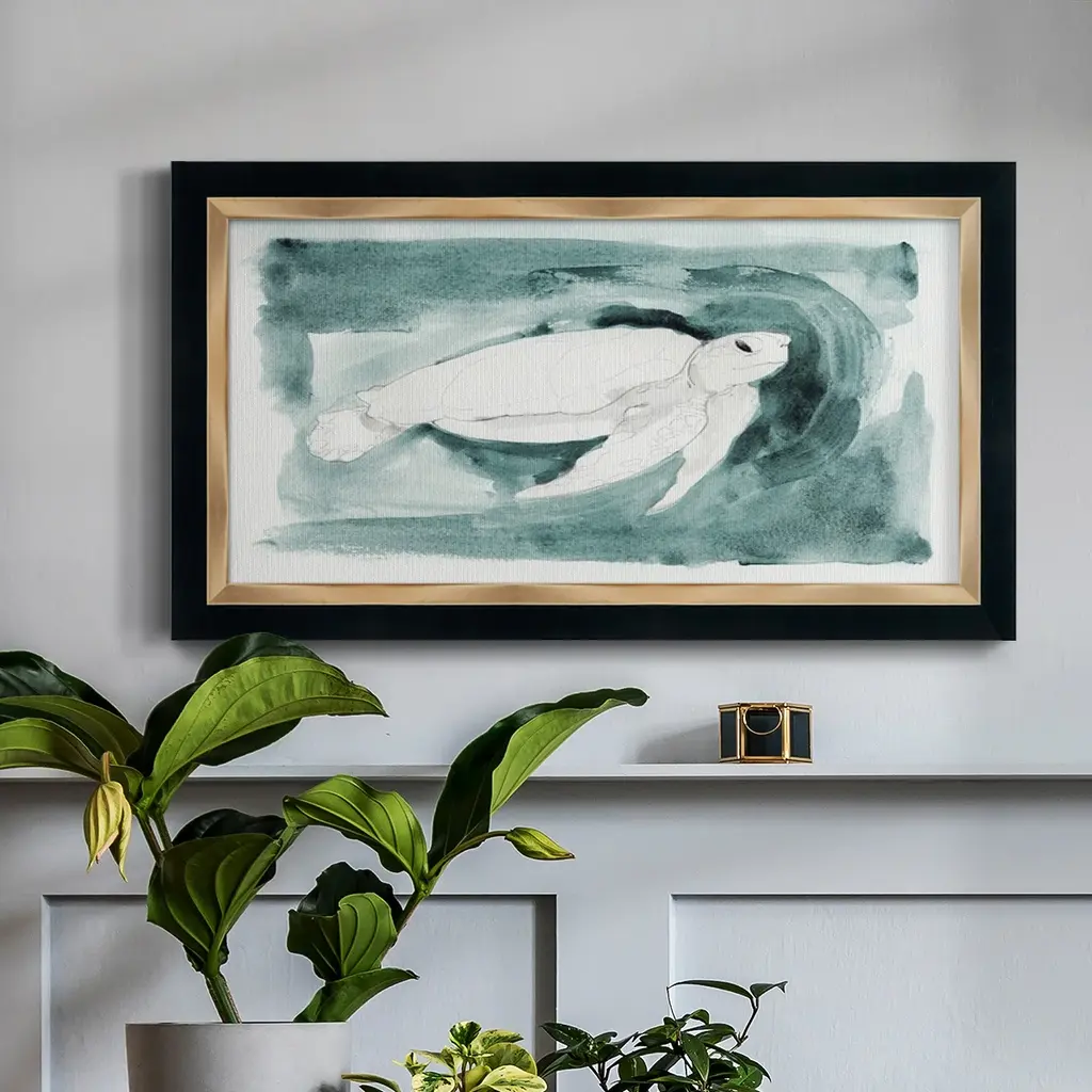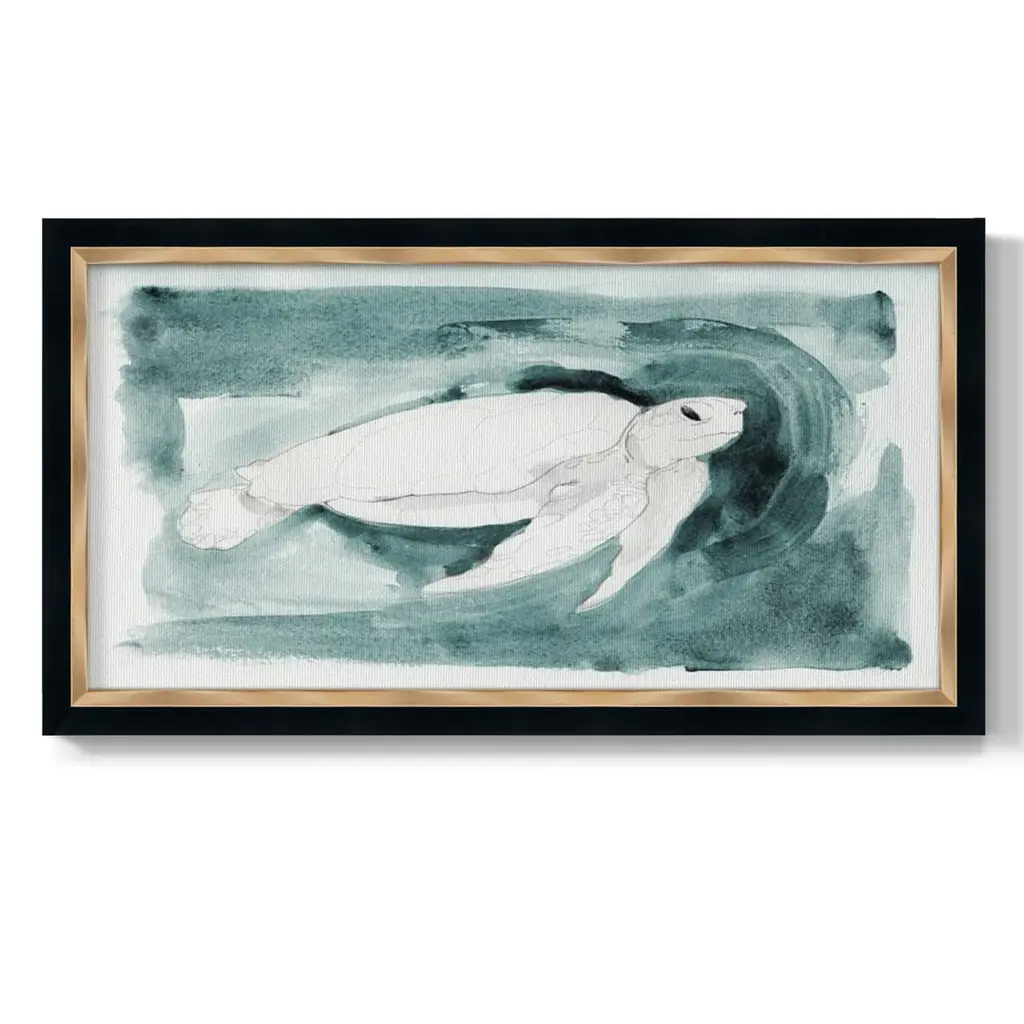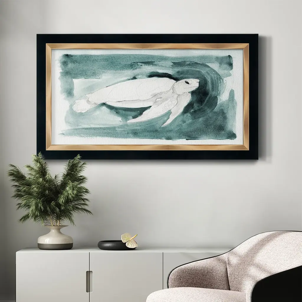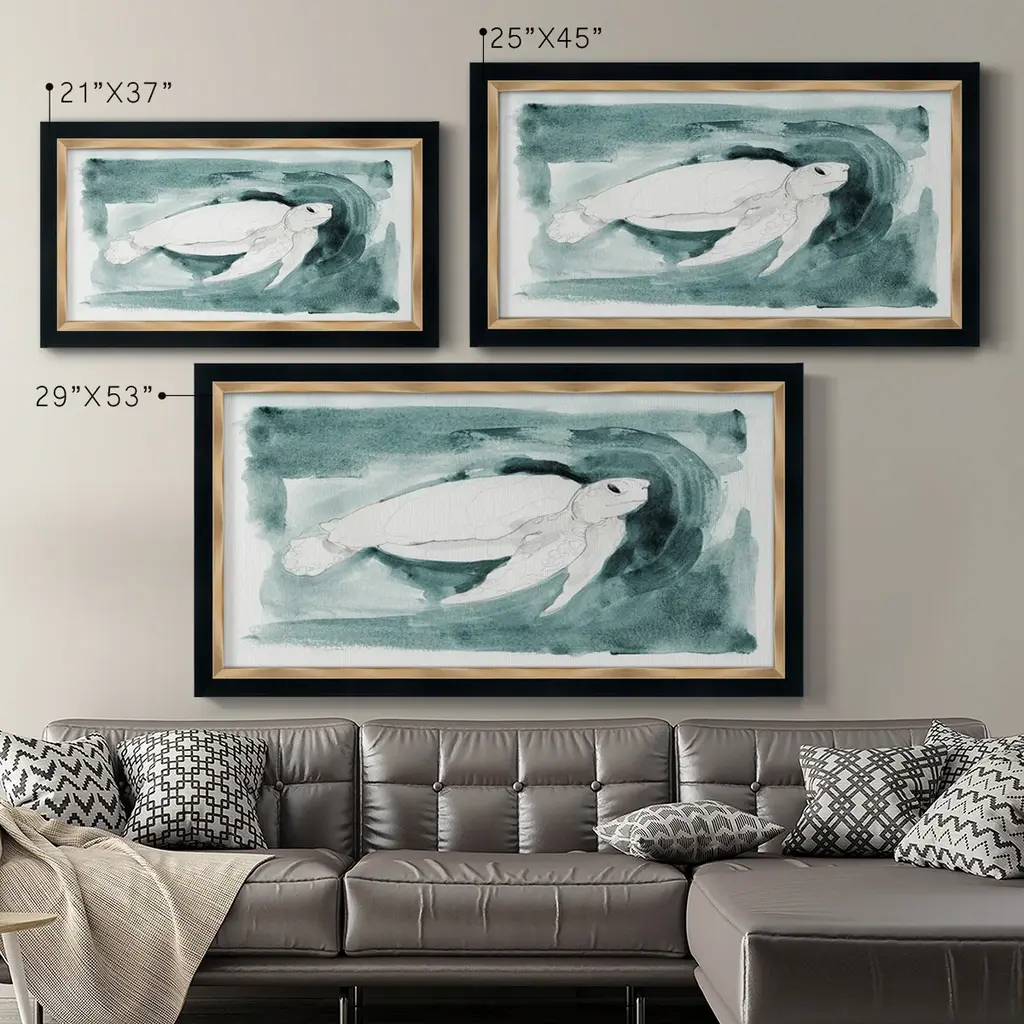 Sea Turtle Searching I Premium Framed Canvas- Ready to Hang A Premium Framed Canvas created to last. Framed in distressed wood and available in an array of sizes and colors Featuring a beveled a solid wood stretcher bar, each piece comes ready to hand 3 SIZES AVAILABLE 21''X37'' - Overall Size 25''X45'' - Overall Size 29''x53'' - Overall Size Each piece is made to order. Each piece comes with hanging hardware. Made in the USA Ready to Hang Giclee Paper Print Acrylic Glass Beveled Matt Board