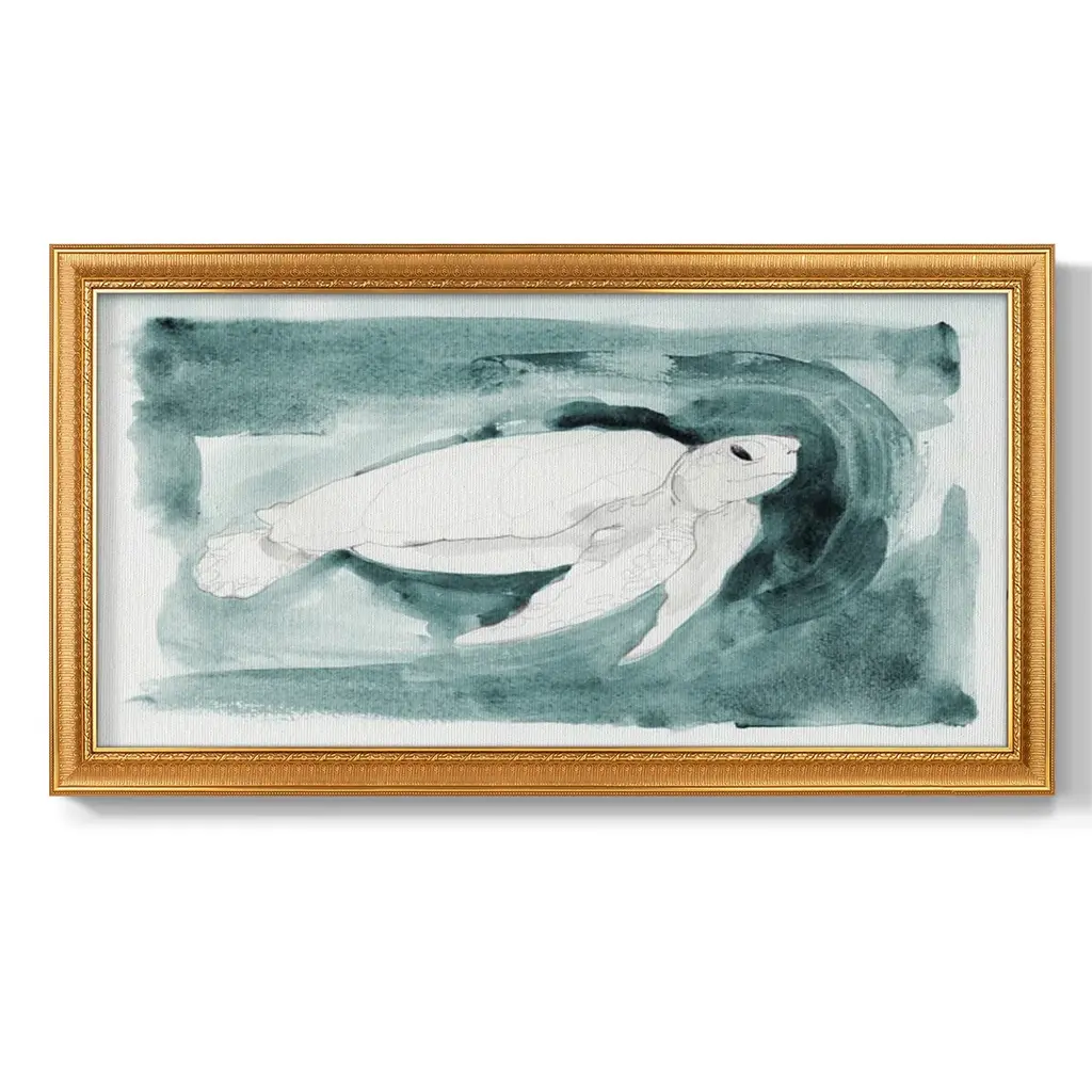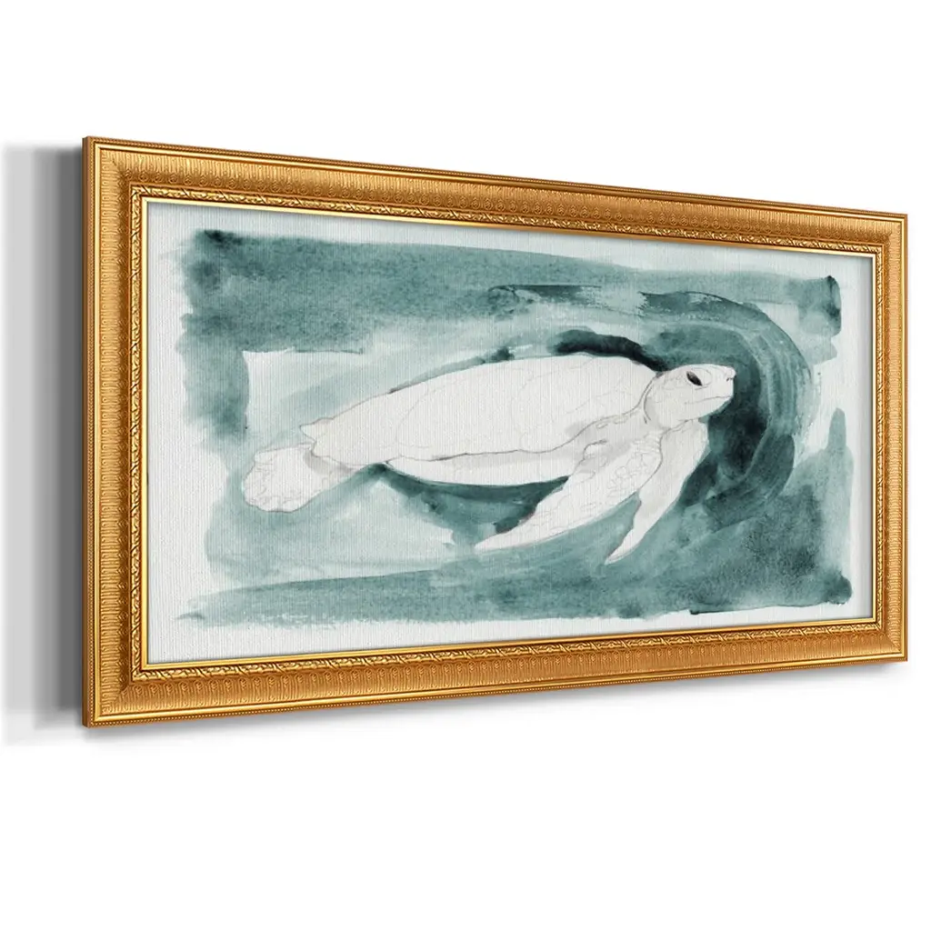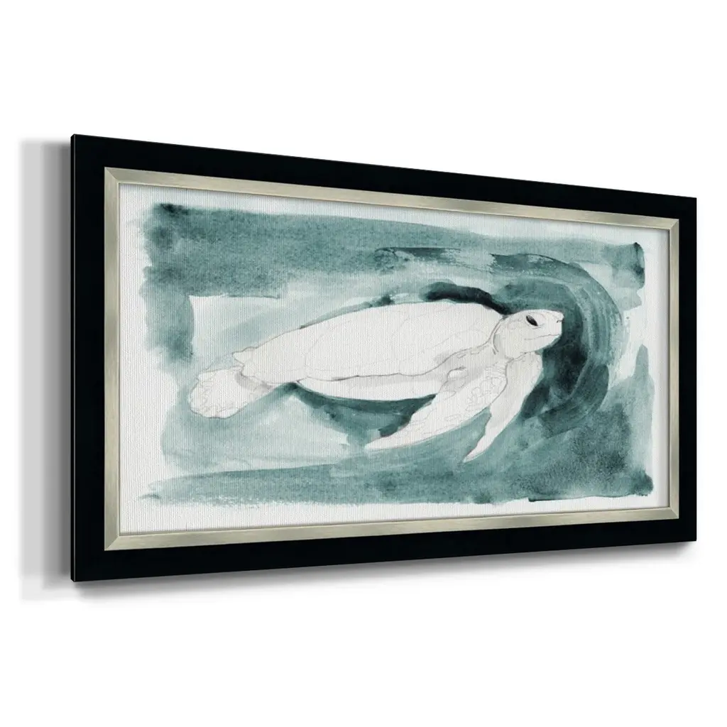 Sea Turtle Searching I Premium Framed Canvas- Ready to Hang A Premium Framed Canvas created to last. Framed in distressed wood and available in an array of sizes and colors Featuring a beveled a solid wood stretcher bar, each piece comes ready to hand 3 SIZES AVAILABLE 21''X37'' - Overall Size 25''X45'' - Overall Size 29''x53'' - Overall Size Each piece is made to order. Each piece comes with hanging hardware. Made in the USA Ready to Hang Giclee Paper Print Acrylic Glass Beveled Matt Board