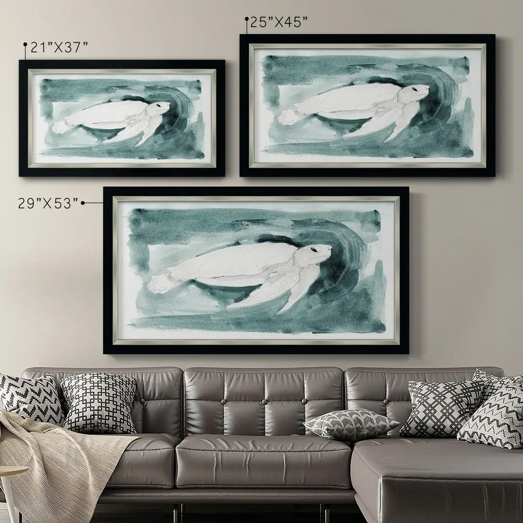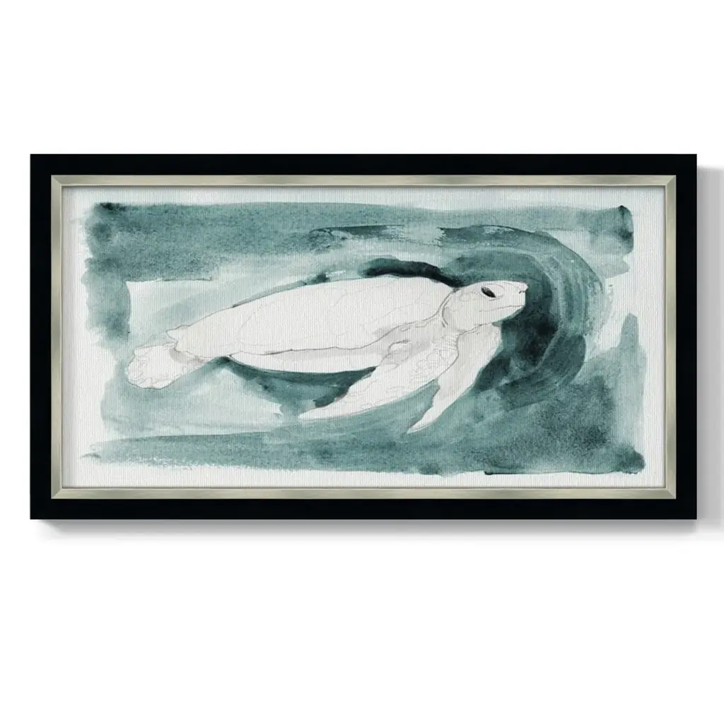 Sea Turtle Searching I Premium Framed Canvas- Ready to Hang A Premium Framed Canvas created to last. Framed in distressed wood and available in an array of sizes and colors Featuring a beveled a solid wood stretcher bar, each piece comes ready to hand 3 SIZES AVAILABLE 21''X37'' - Overall Size 25''X45'' - Overall Size 29''x53'' - Overall Size Each piece is made to order. Each piece comes with hanging hardware. Made in the USA Ready to Hang Giclee Paper Print Acrylic Glass Beveled Matt Board