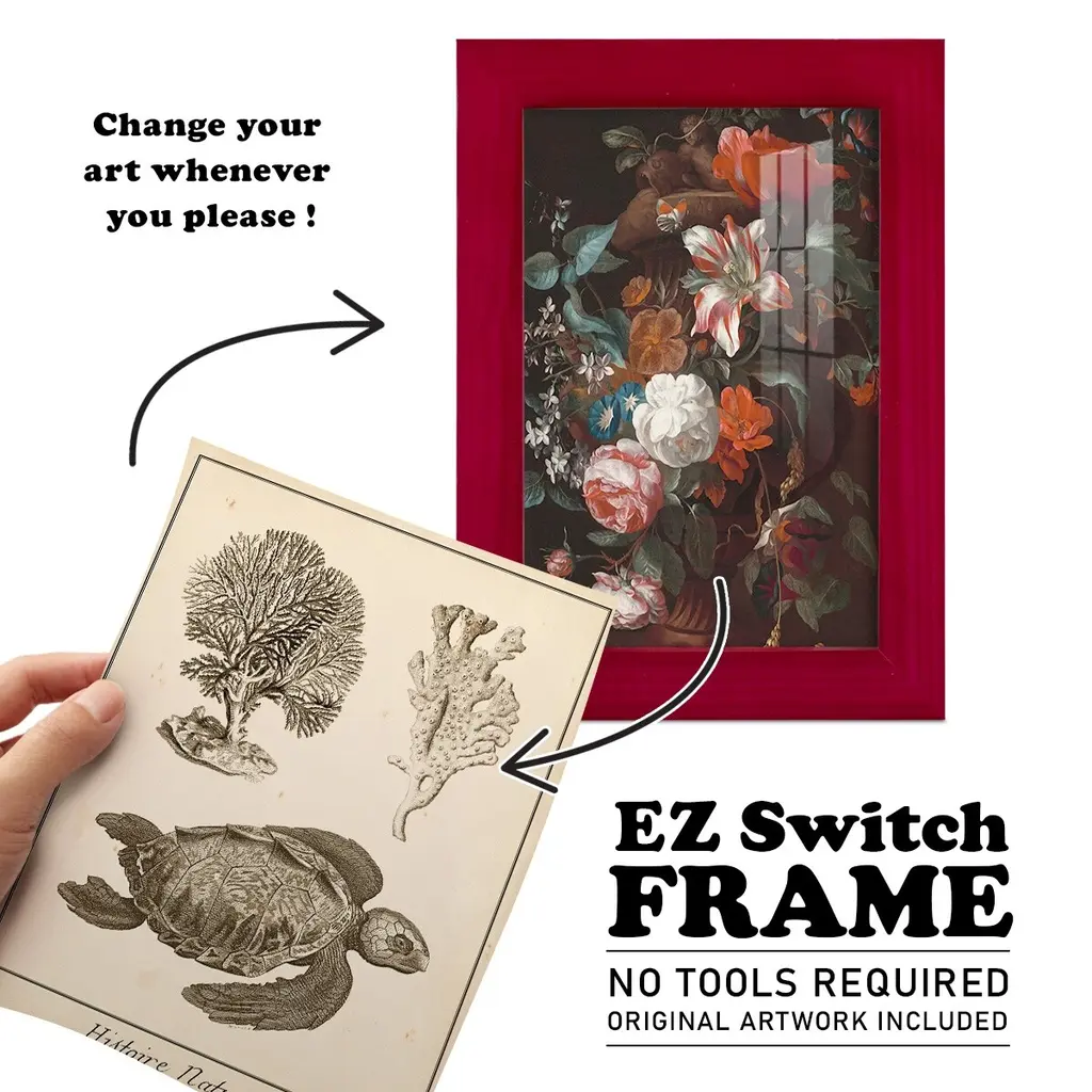 Sea Turtle Study I -EZ SWITCH Framed Print w/glass-Cherry Red A delightful, framed print. Featuring a solid wood frame with real wood glass. This premium print is giclee quality. In addition, every frame features a removable back and table top stand. This allows you to change your art in the future or to just stand the art on a table for a new look. We are sure you'll enjoy our new series of EZ SWITCH Framed Art. Solid Wood Frame Real Glass Removable / Replaceable Art Built in Tabletop Stand Sizes range from 4x6 up to 12x15 - buy just one or pair them up as sets as you see fit.