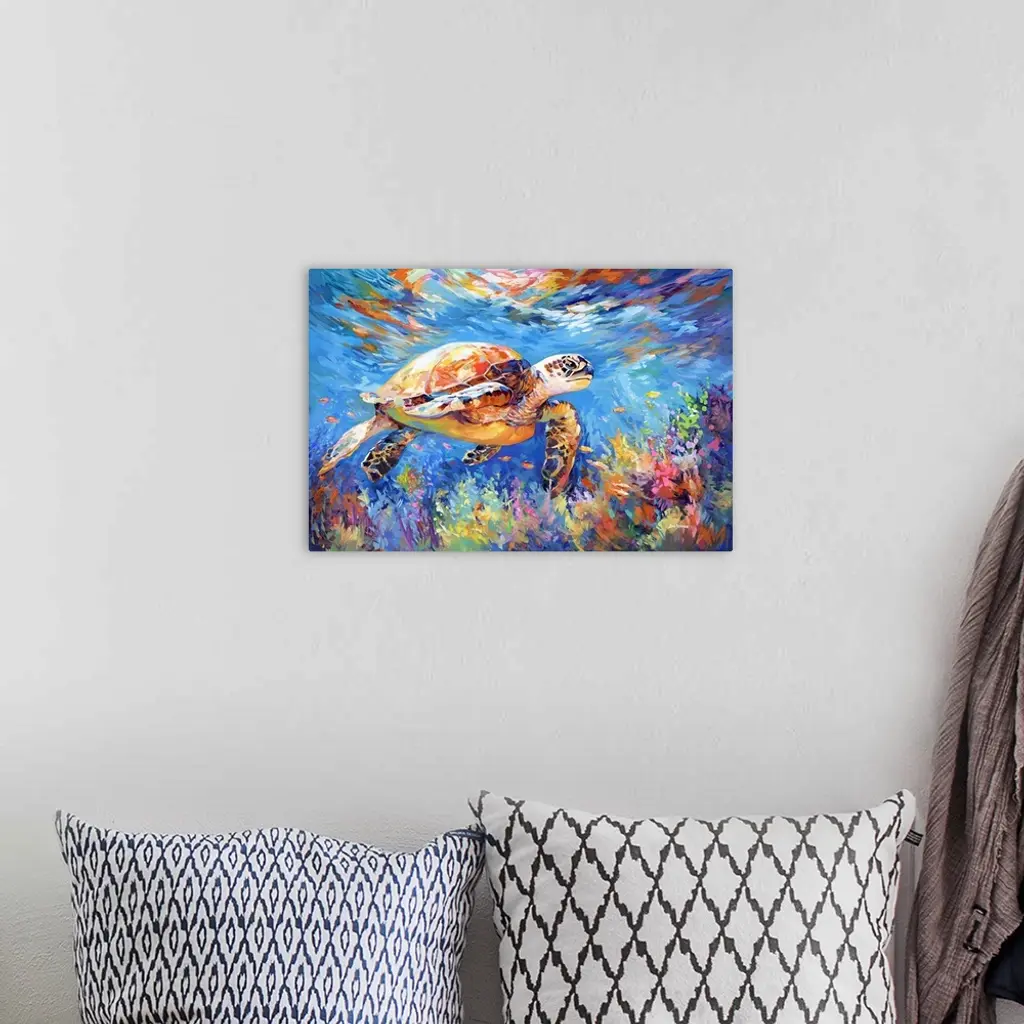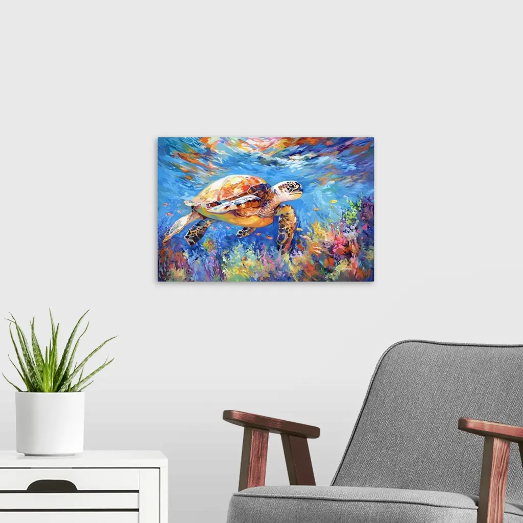 This contemporary artwork captures a sea turtle gliding through the ocean's depths, its form accentuated by the vivid hues of the coral and the darting colors of small fish, creating a dynamic and colorful marine scene. It's an ideal centerpiece for beach house decor or a vibrant addition to enhance the ambiance of a living room.