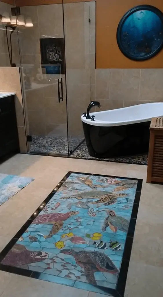 Dive into the enchanting world of marine life with our "Sea Turtles and Fish - Stone Mosaic Art." This stunning piece showcases a vibrant mosaic pattern, intricately designed using petal-shaped marble tiles to vividly depict the grace and beauty of sea turtles and fish. Each tile tells a story, bringing the essence of the ocean into your space.Perfect for creating a welcoming atmosphere, this mosaic art can be beautifully integrated into your bathroom as a unique tile backsplash, adding an artistic flair that sets your space apart. Alternatively, it serves as a distinctive outdoor decorative tile, transforming any patio or garden area into an ocean-inspired retreat. The handmade craftsmanship ensures that each mosaic is a one-of-a-kind masterpiece, making it a perfect focal point for your home.Not only is this mosaic design a captivating addition to indoor spaces, but it also makes for stylish pool art. Imagine lounging by your pool surrounded by the splendor of vibrant marine life captured in natural stone; it’s an idyllic complement for your swimming area. Our "Sea Turtles and Fish - Stone Mosaic Art" is available in custom sizes, allowing you to select the dimensions that best fit your vision. Whether you're looking for a large statement piece or something more subtle, we can accommodate your needs to create a personalized experience.Explore our mosaic gallery to discover a wide array of patterns that will enhance your swimming pool, bathroom, or any other space you wish to revitalize. Bring the charm of the sea into your home with this exquisite mosaic art piece that celebrates the beauty of nature and craftsmanship. Elevate your decor with the timeless elegance of natural stone; order your "Sea Turtles and Fish - Stone Mosaic Art" today and embrace the serenity of the ocean wherever you are.