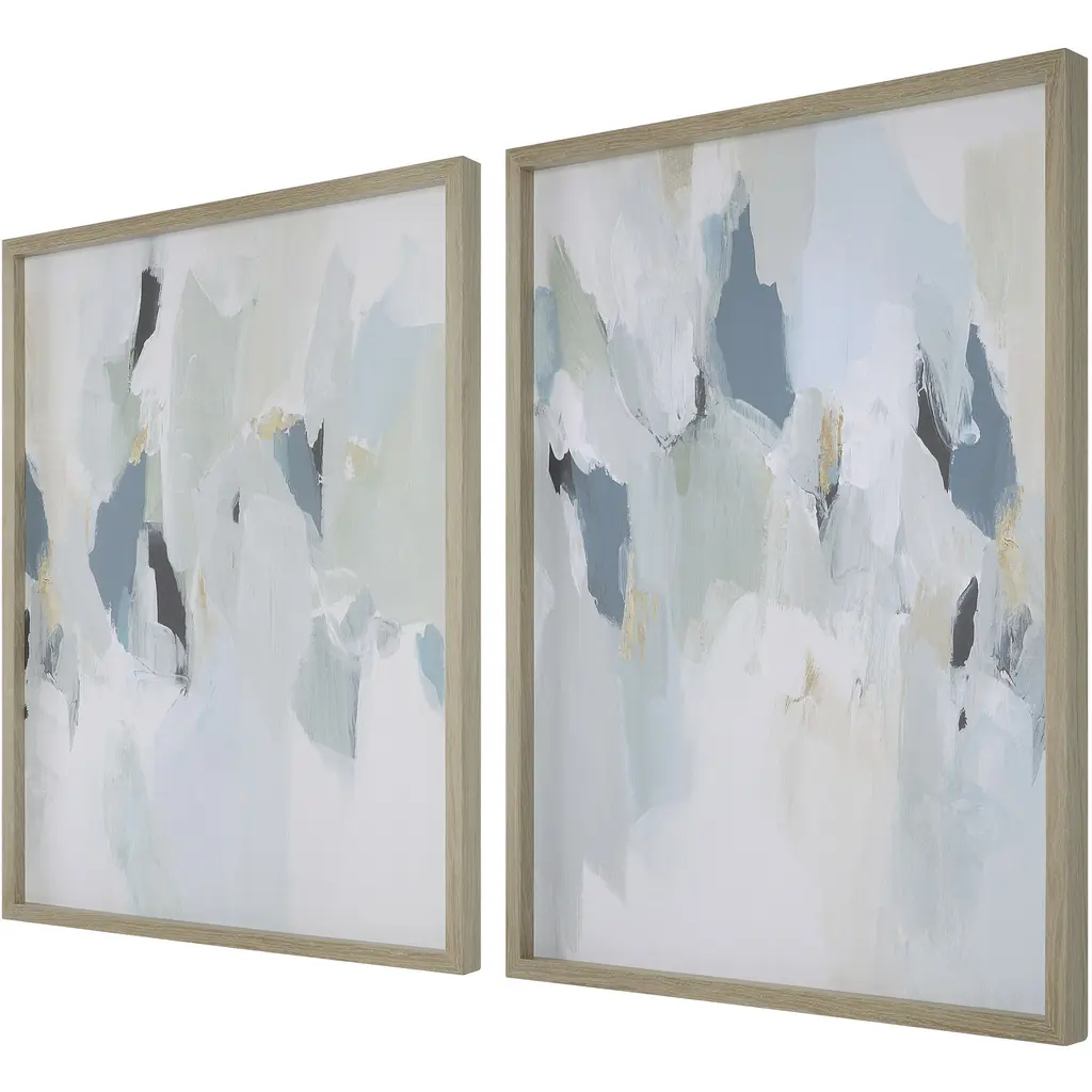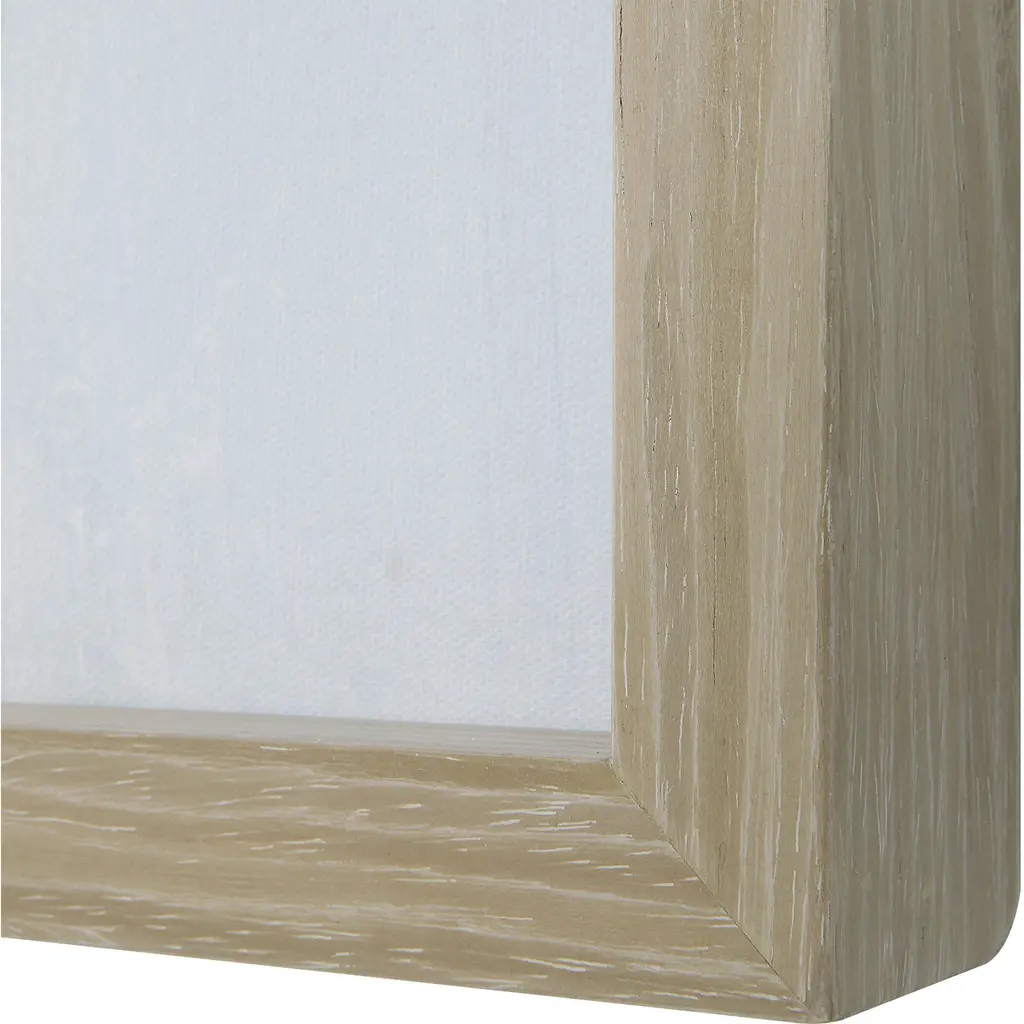 Printed on canvas, soothing hues of blue, taupe, and gray blend together with light moss and slate to create a modern coastal feel. A gray washed pine frame surrounds each canvas. May be hung horizontal or vertical. Artwork by isabelle z.