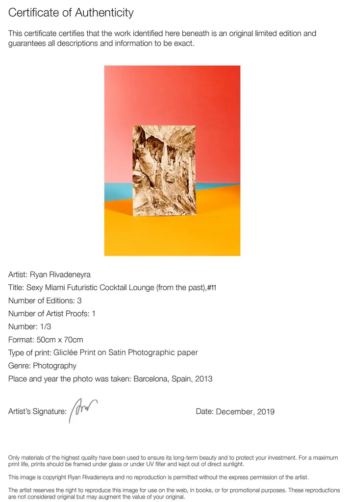"Sexy Miami Futuristic Cocktail Lounge" is a series of photographs by Ryan Rivadeneyra inspired by the Art Deco colors of Miami that show beautiful objects and textures arranged meticulously in front of a backdrop of bright pastel colors. Details: Title: "Sexy Miami Futuristic Cocktail Lounge" (from the past) #11 Edition Size: Edition of 3 per image and 1 AP Medium: Giclée print on gallery quality satin photographic paper Size: 70x50 cm Year: 2013 The series was shown in the Tapies Foundation Museum in Barcelona in 2013. Ryan Rivadeneyra (Miami, 1984) is based in Barcleona, Spain. He has shown in Museums such as the MACBA, Tapies Foundation, and CA2M in Spain, and in galleries such as Flat Time House (London), Galerie Juliette Jongma (Amsterdam), Helmhaus (Zurich), Casa Hoffman (Bogota), or Art Sonje (Seoul)