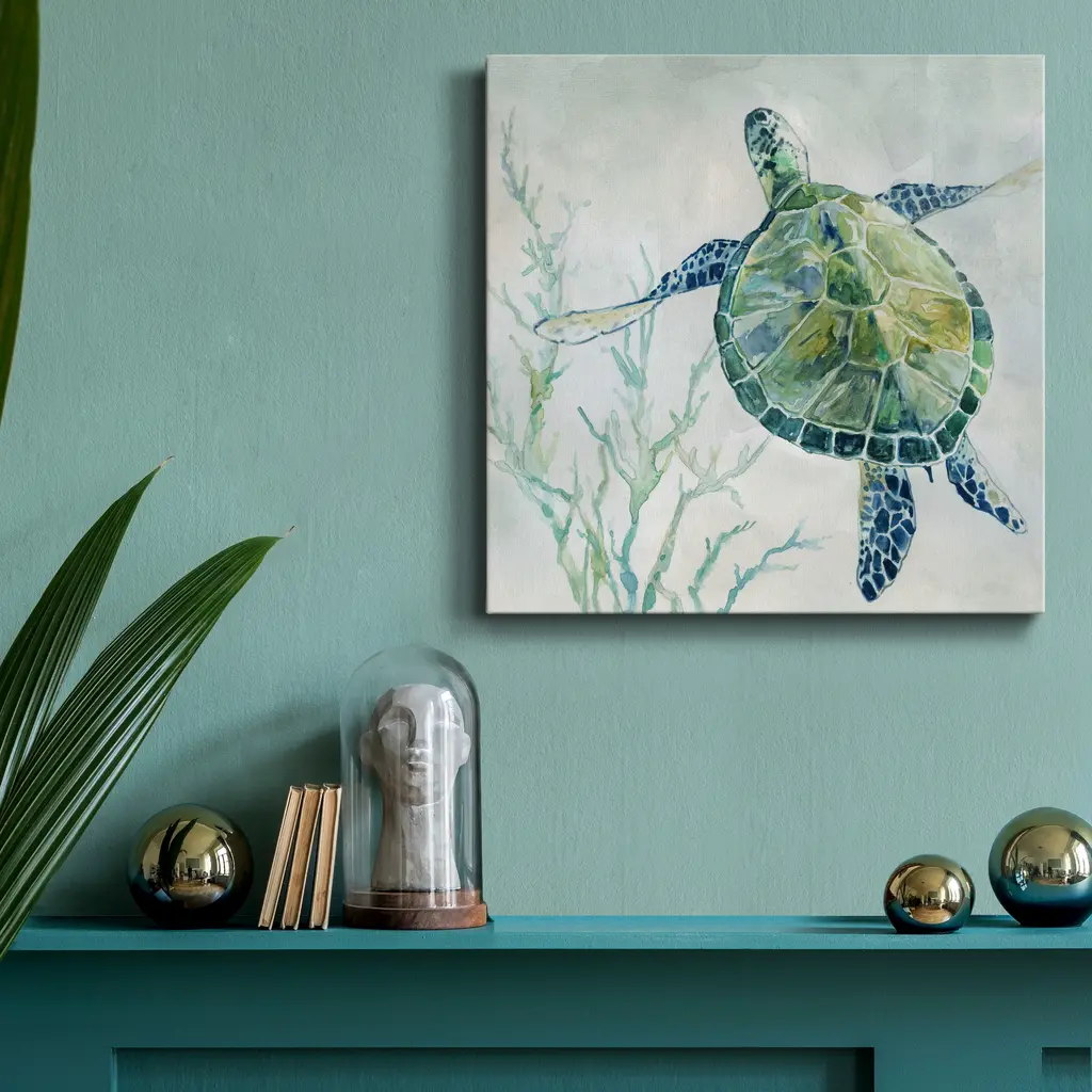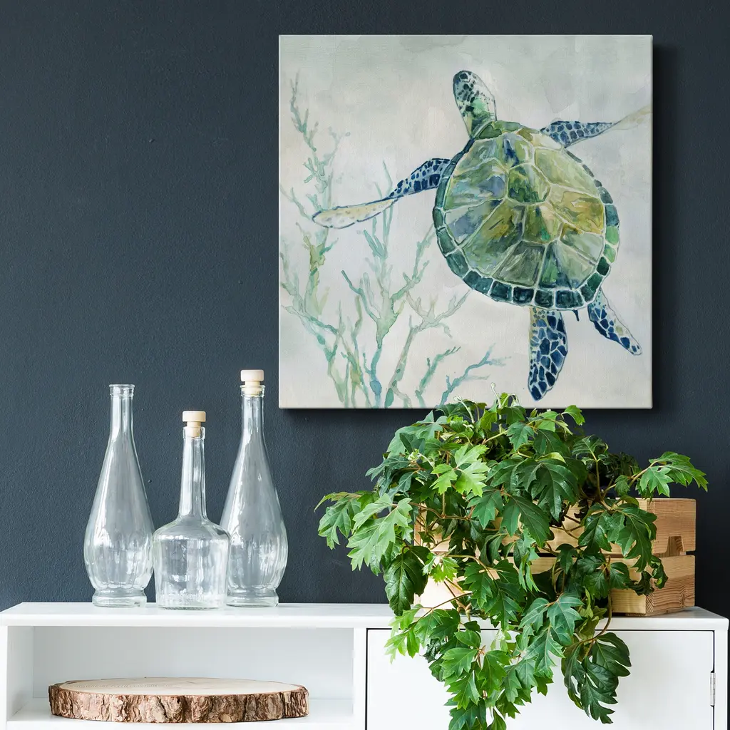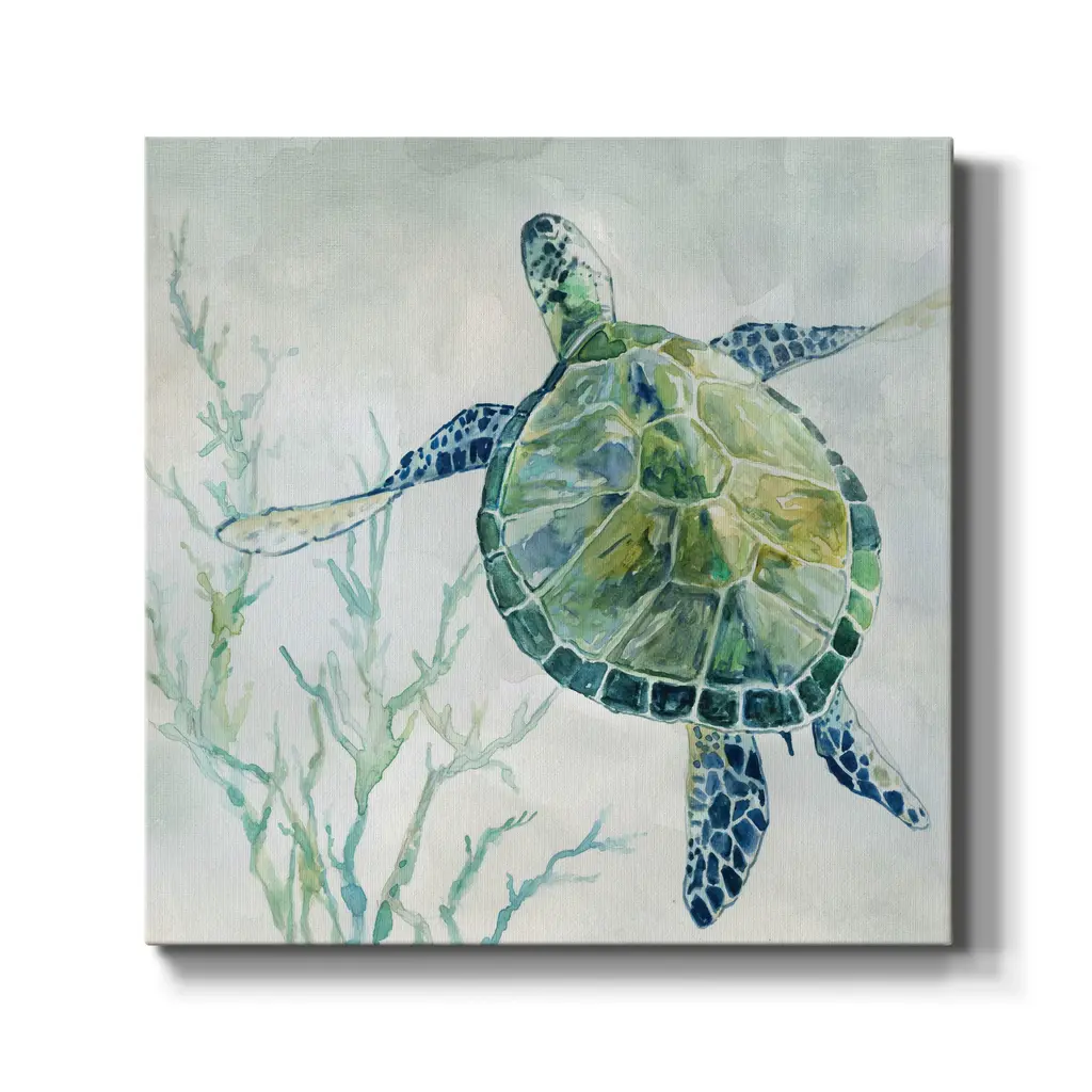 Seaglass Turtle II-Premium Gallery Wrapped Canvas - Ready to Hang A premium hand stretched gallery wrapped canvas print created to last. Featuring a beveled a solid wood stretcher bar, each piece comes ready to hand 5 SIZES AVAILABLE 10''X10'' - Overall Size 16''x16'' - Overall Size 24''x24'' - Overall Size 32''x32'' - Overall Size 40''x40'' - Overall Size Each piece is made to order. Built to Last Each piece comes ready to hang Solid wood stretcher Fade and Water resistant Made domestically