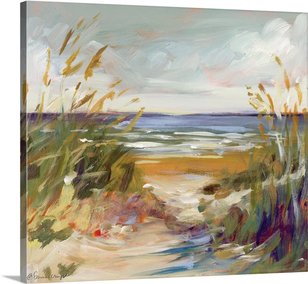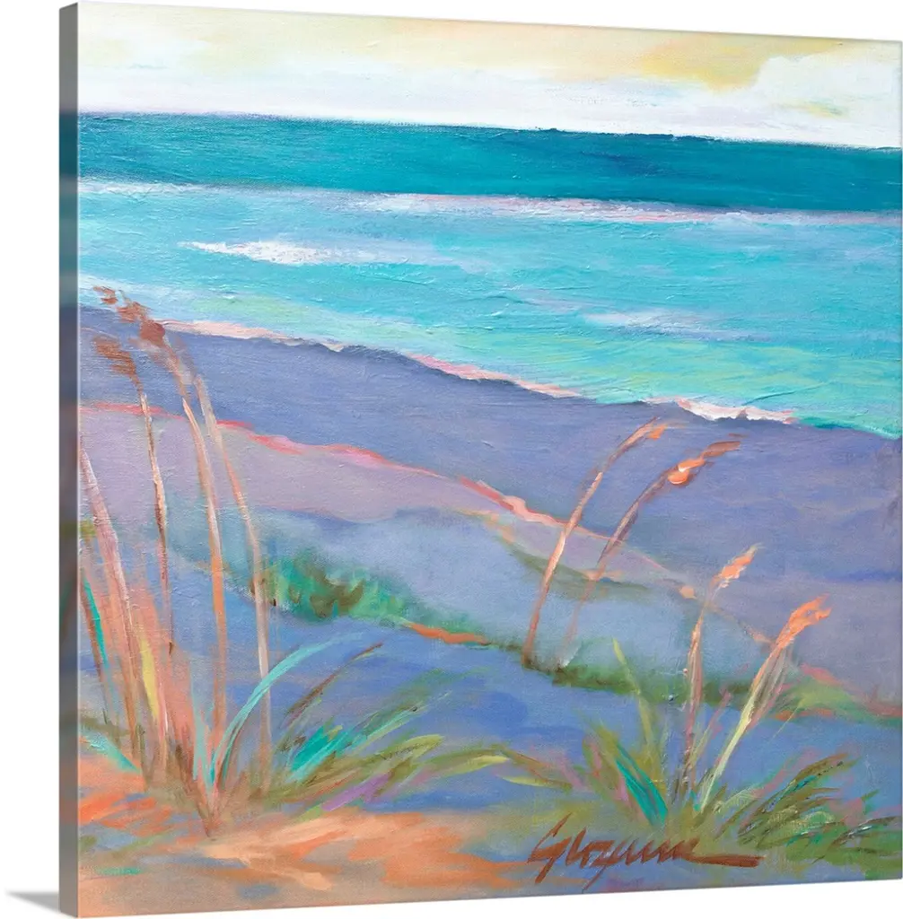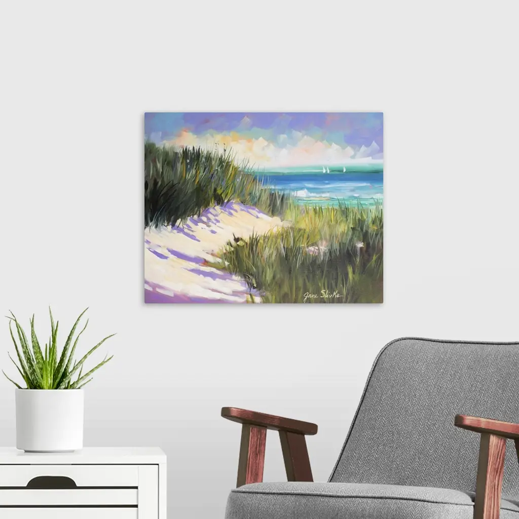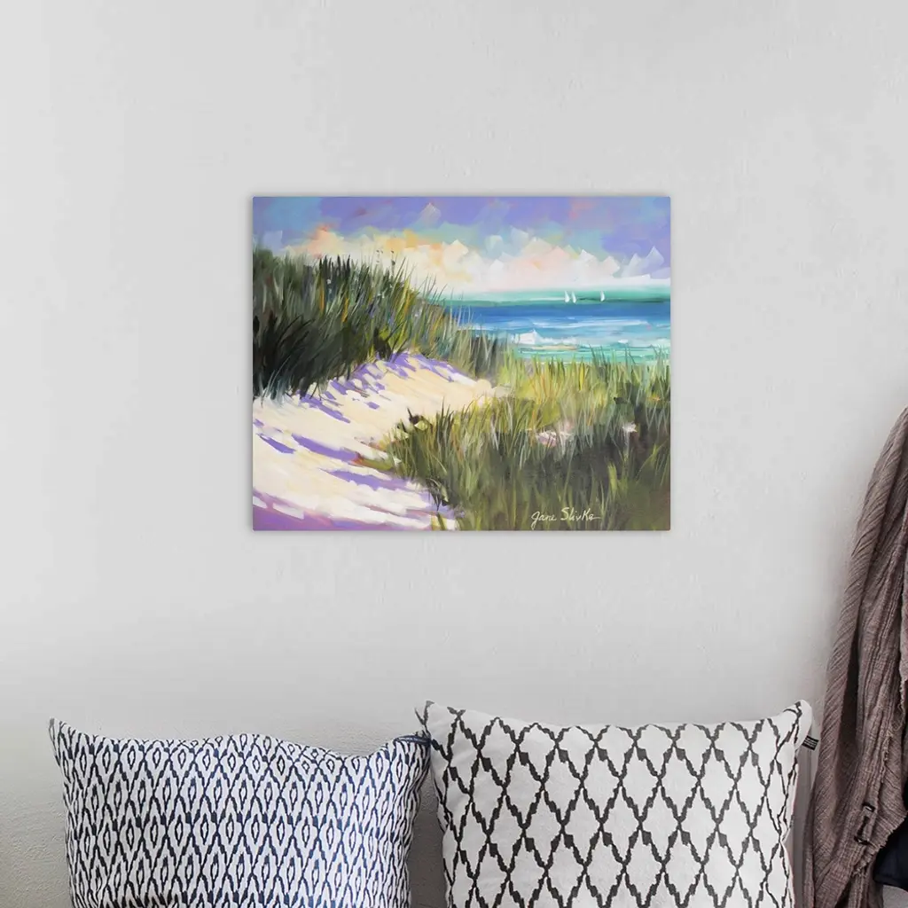 Contemporary painting of beach grasses in the dunes overlooking the ocean.