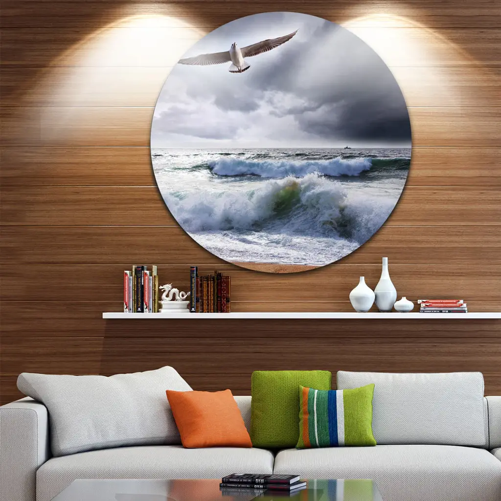 Bring Contemporary Abstraction to your home with this large Circle Metal wall art. This Large Seagull over Stormy Waves Metal Artwork makes it the focal point of any room or office. - White Gloss Coating ensures colors are extra vibrant with light reflection.- Aluminum grade Sheet Metal with 1 inch mounting frame on the back giving the illusion that the artwork is floating on the wall..- Mounting Brackets are included along with instructions.- High Quality Digital images are created directly into a glossy aluminum panel producing a stunning and captivating print into the glossy finish of the metal.- Water, Fire and Scratch resistant HD Aluminum panels.- Looks better than any photo paper and guaranteed to last at least 20 years- Easy to clean with a microfiber cloth. Colors are far superior to regular Canvas Art. - Easy to Hang