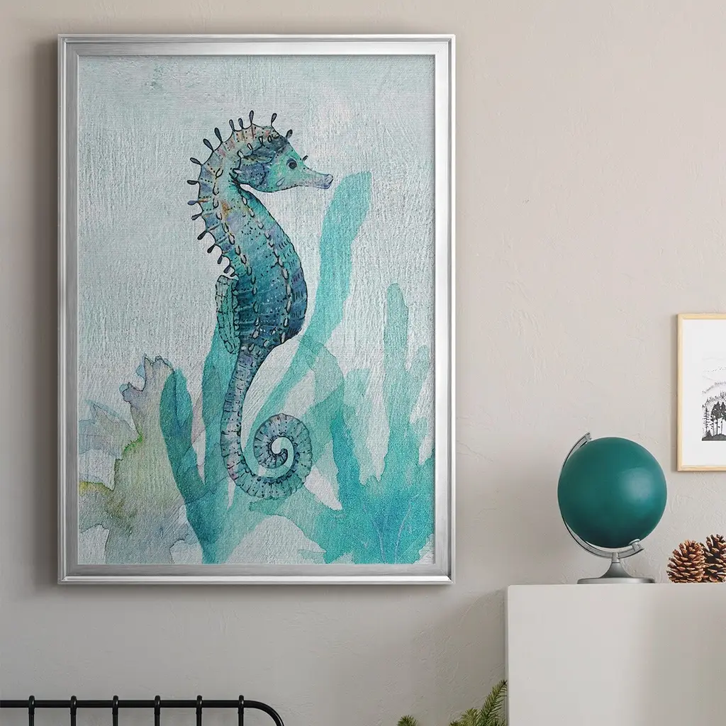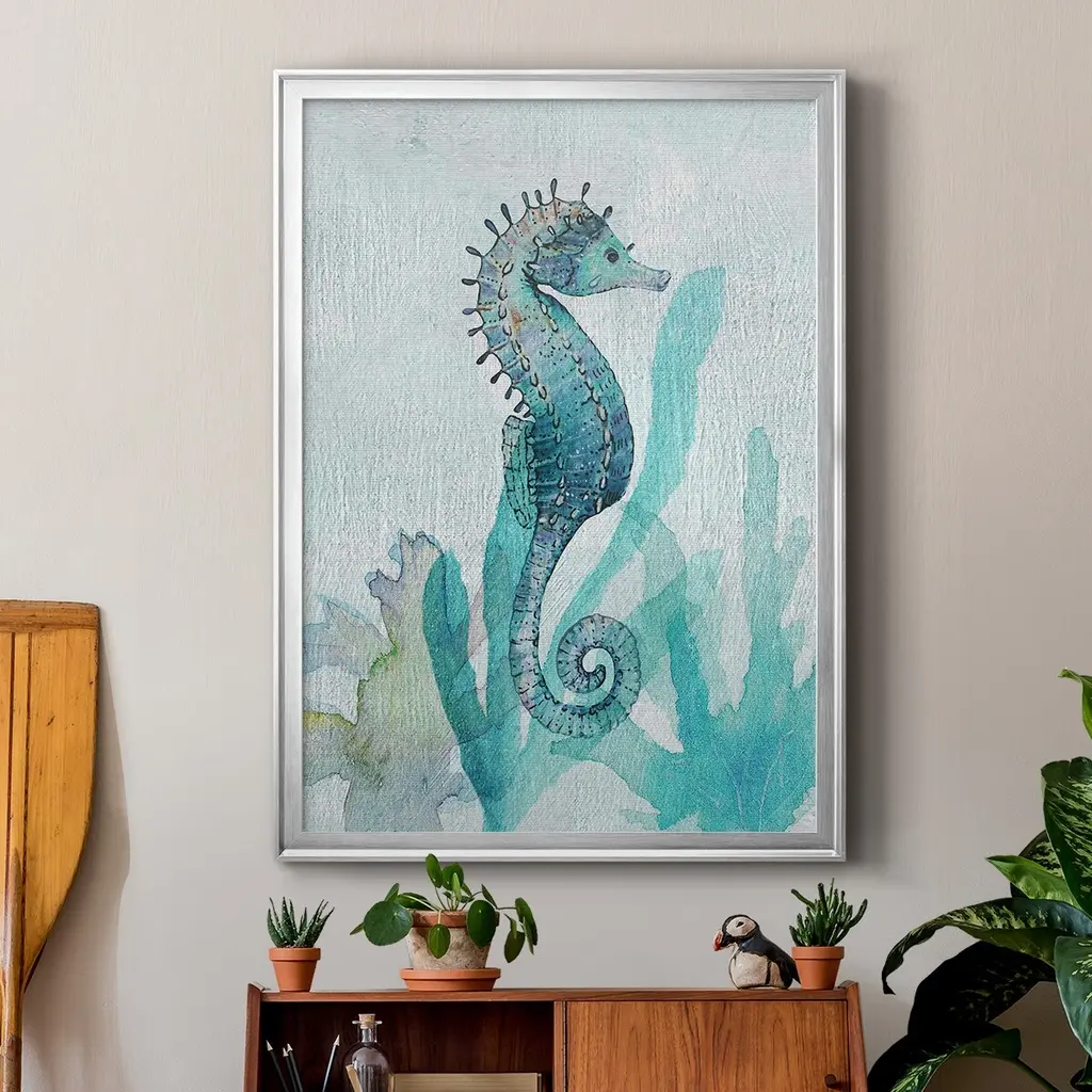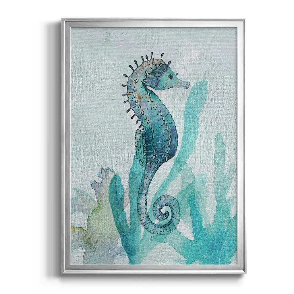Seahorse I Premium Framed Print - Ready to Hang A Premium Framed Print created to last. Framed in distressed wood and available in an array of sizes and colors Featuring a beveled a solid wood stretcher bar, each piece comes ready to hand 4 SIZES AVAILABLE 30.5''X42.5'' - Overall Size 26.5'X36.5'' - Overall Size 22.5''x30.5'' - Overall Size 18.5''x24.5'' - Overall Size Each piece is made to order. Each piece comes with hanging hardware. Made in the USA Ready to Hang