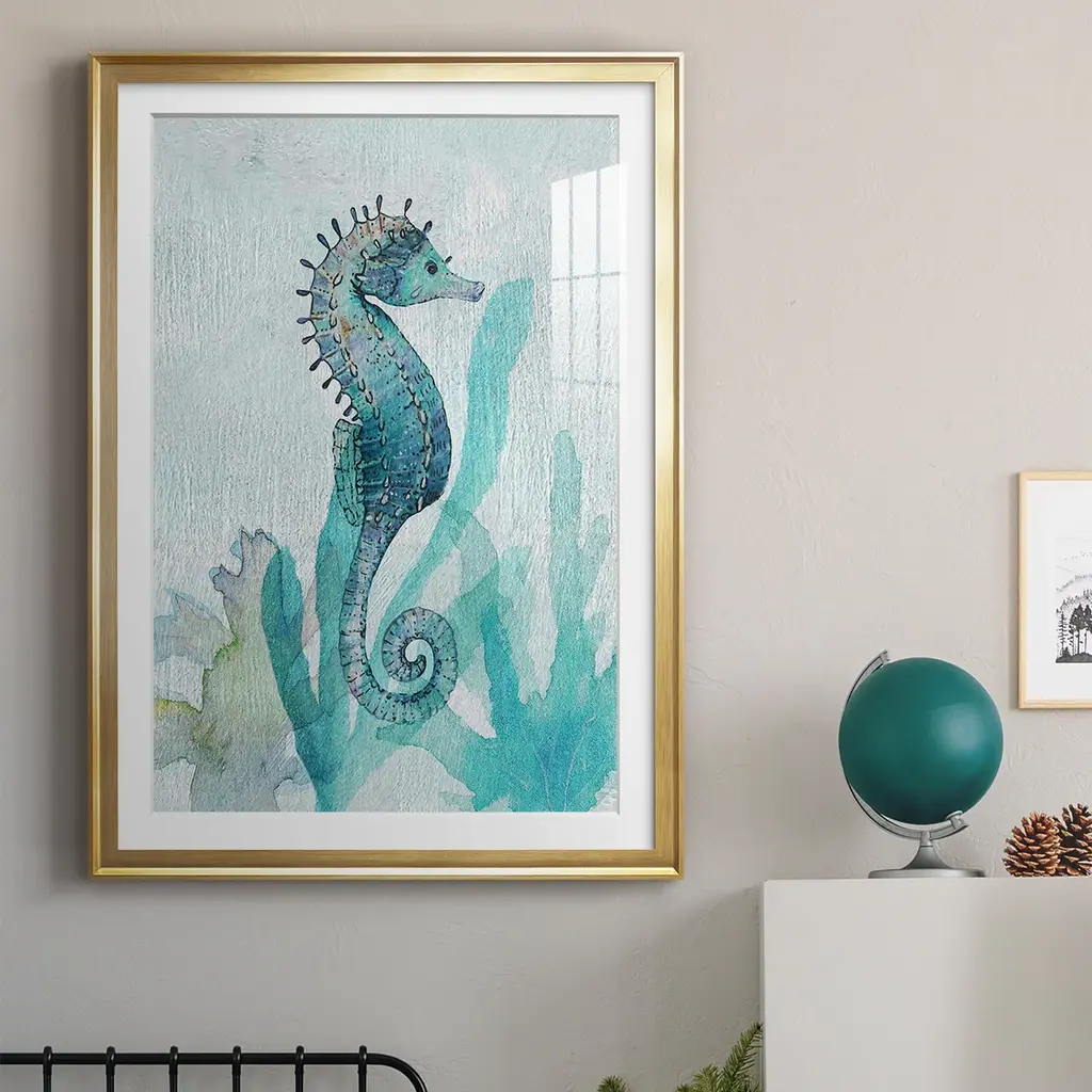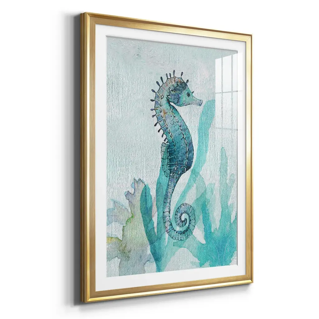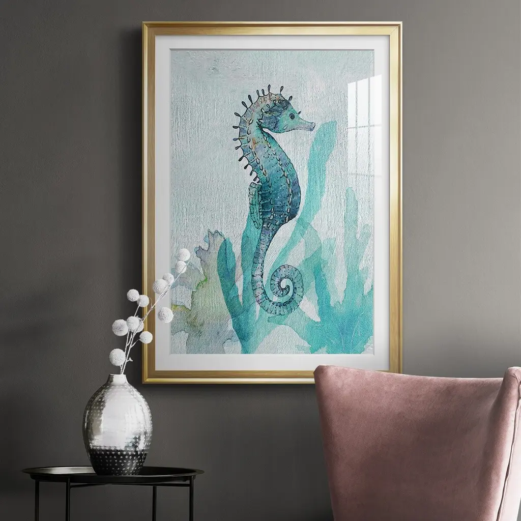 Seahorse I Premium Framed Print - Ready to Hang A Premium Framed Print created to last. Framed in distressed wood and available in an array of sizes and colors Featuring a beveled a solid wood stretcher bar, each piece comes ready to hand 4 SIZES AVAILABLE 30.5''X42.5'' - Overall Size 26.5'X36.5'' - Overall Size 22.5''x30.5'' - Overall Size 18.5''x24.5'' - Overall Size Each piece is made to order. Each piece comes with hanging hardware. Made in the USA Ready to Hang Giclee Paper Print Acrylic Glass Beveled Matt Board