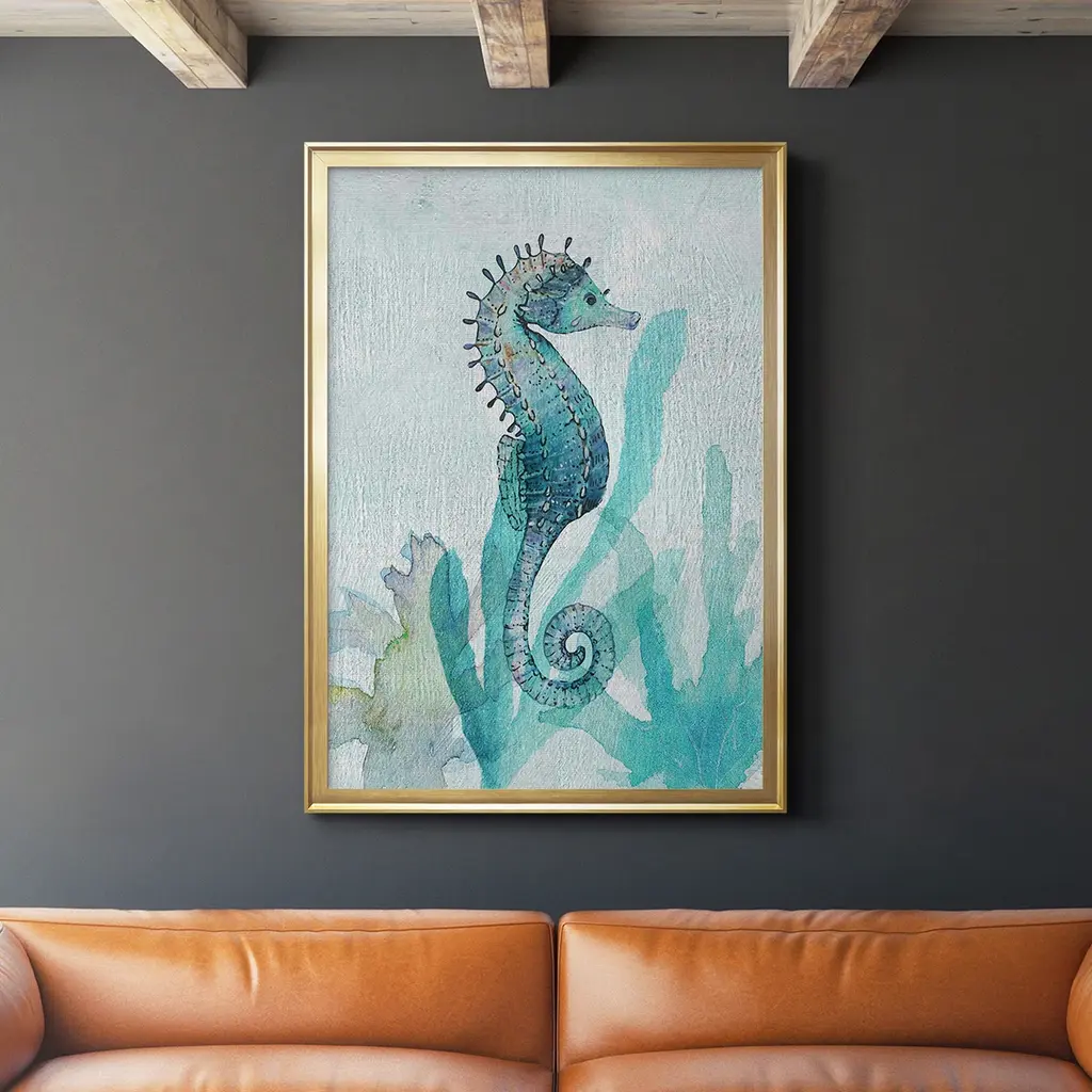 Seahorse I Premium Framed Print - Ready to Hang A Premium Framed Print created to last. Framed in distressed wood and available in an array of sizes and colors Featuring a beveled a solid wood stretcher bar, each piece comes ready to hand 4 SIZES AVAILABLE 30.5''X42.5'' - Overall Size 26.5'X36.5'' - Overall Size 22.5''x30.5'' - Overall Size 18.5''x24.5'' - Overall Size Each piece is made to order. Each piece comes with hanging hardware. Made in the USA Ready to Hang