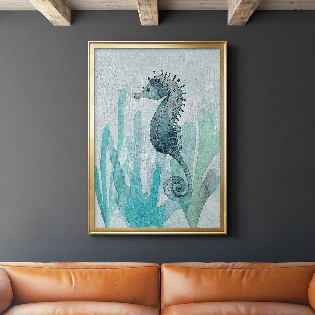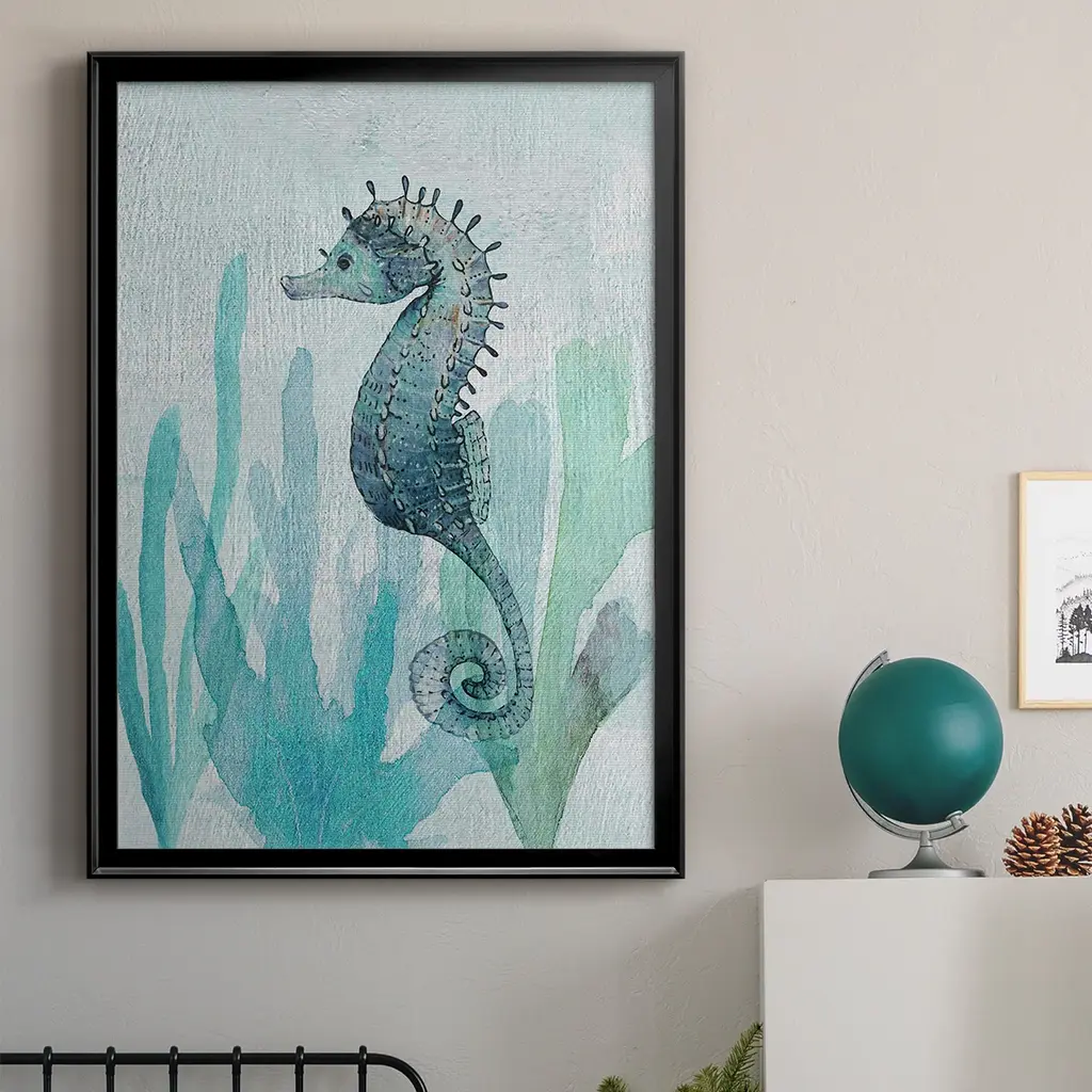 Seahorse II Premium Framed Print - Ready to Hang A Premium Framed Print created to last. Framed in distressed wood and available in an array of sizes and colors Featuring a beveled a solid wood stretcher bar, each piece comes ready to hand 4 SIZES AVAILABLE 30.5''X42.5'' - Overall Size 26.5'X36.5'' - Overall Size 22.5''x30.5'' - Overall Size 18.5''x24.5'' - Overall Size Each piece is made to order. Each piece comes with hanging hardware. Made in the USA Ready to Hang