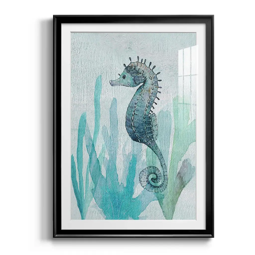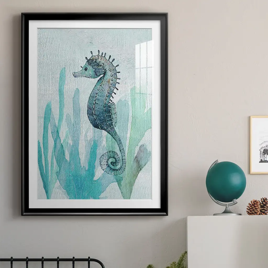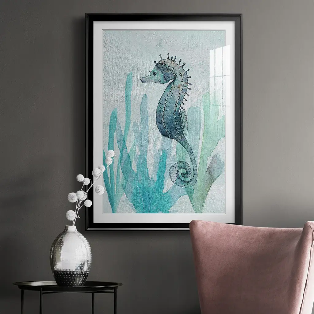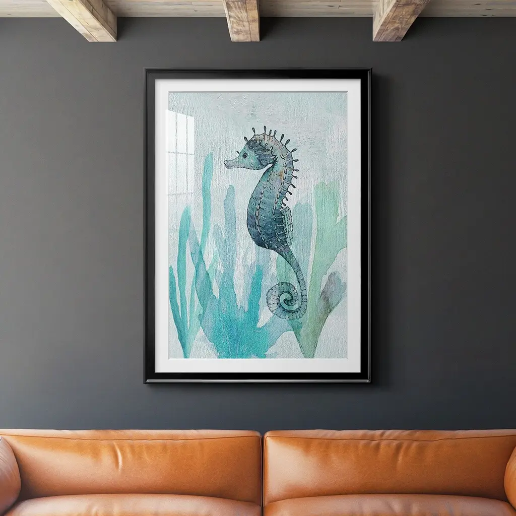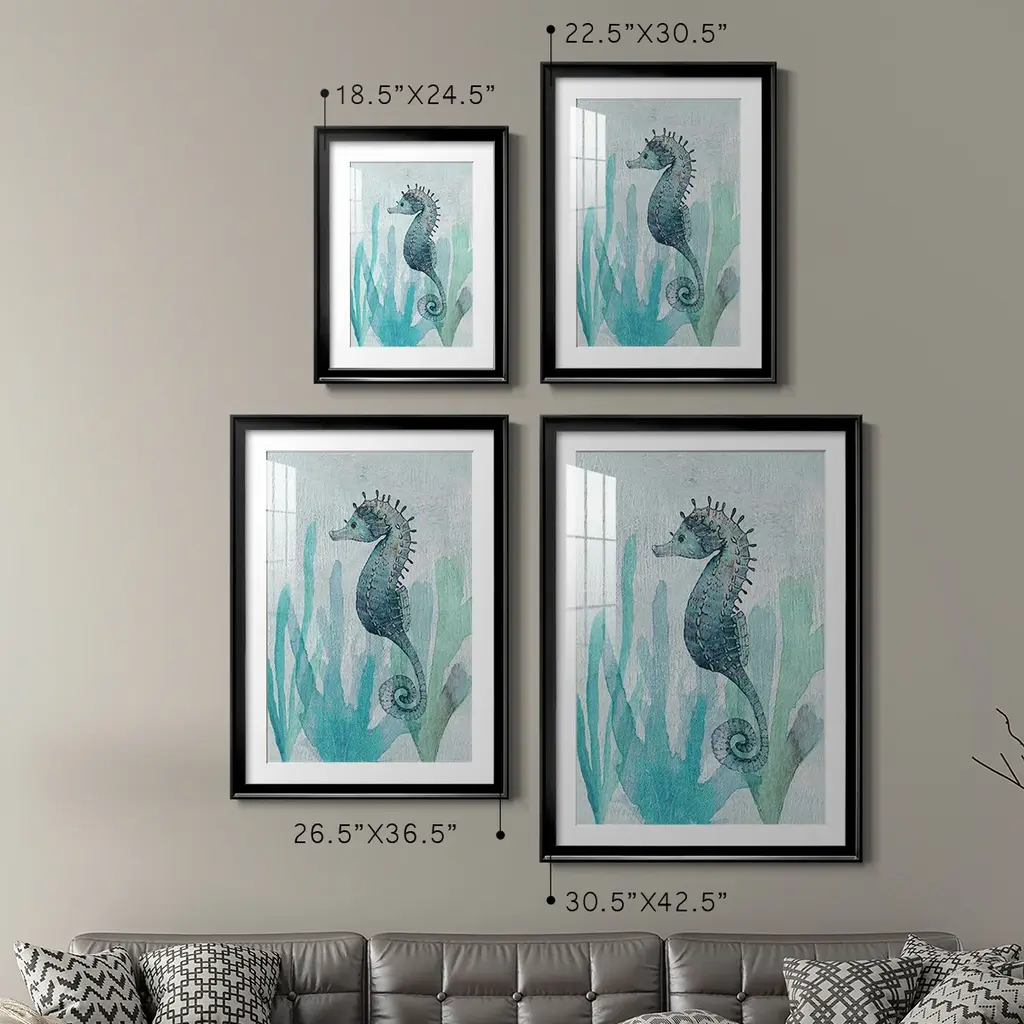 Seahorse II Premium Framed Print - Ready to Hang A Premium Framed Print created to last. Framed in distressed wood and available in an array of sizes and colors Featuring a beveled a solid wood stretcher bar, each piece comes ready to hand 4 SIZES AVAILABLE 30.5''X42.5'' - Overall Size 26.5'X36.5'' - Overall Size 22.5''x30.5'' - Overall Size 18.5''x24.5'' - Overall Size Each piece is made to order. Each piece comes with hanging hardware. Made in the USA Ready to Hang Giclee Paper Print Acrylic Glass Beveled Matt Board