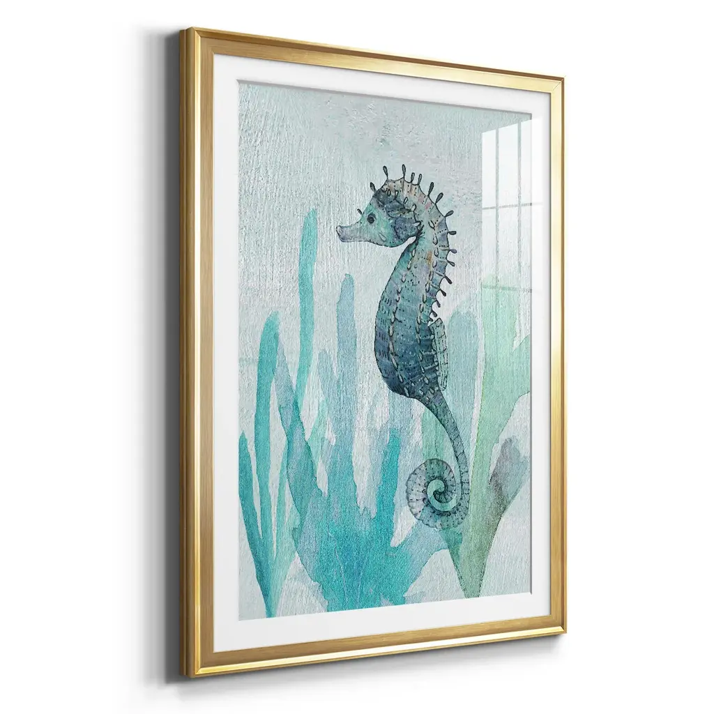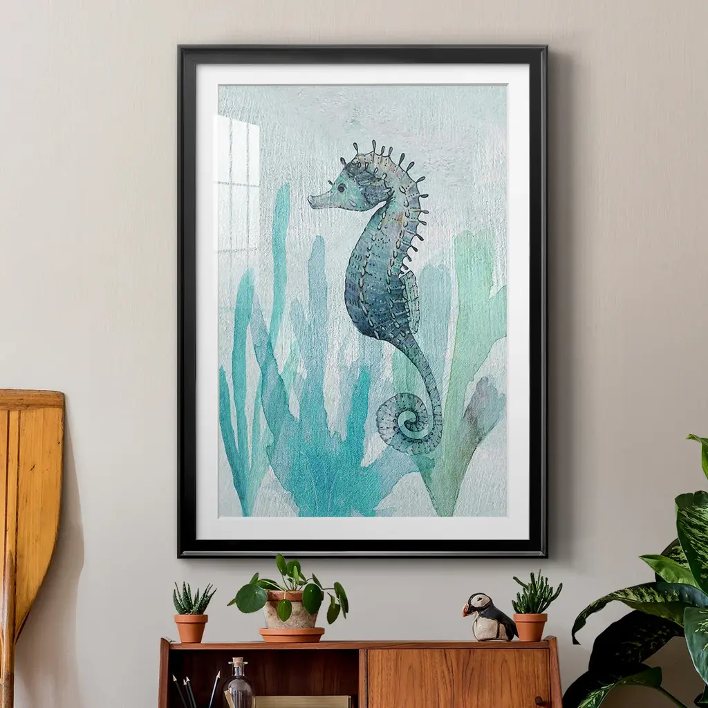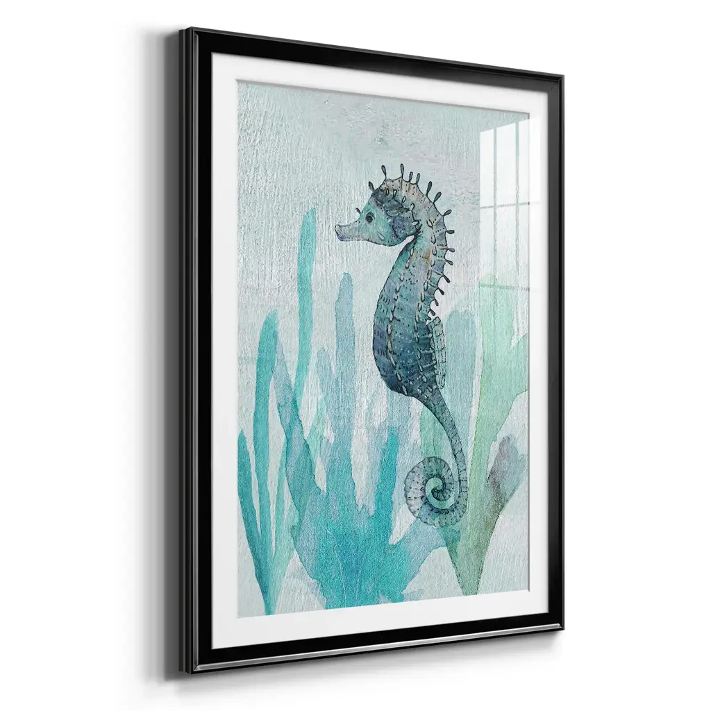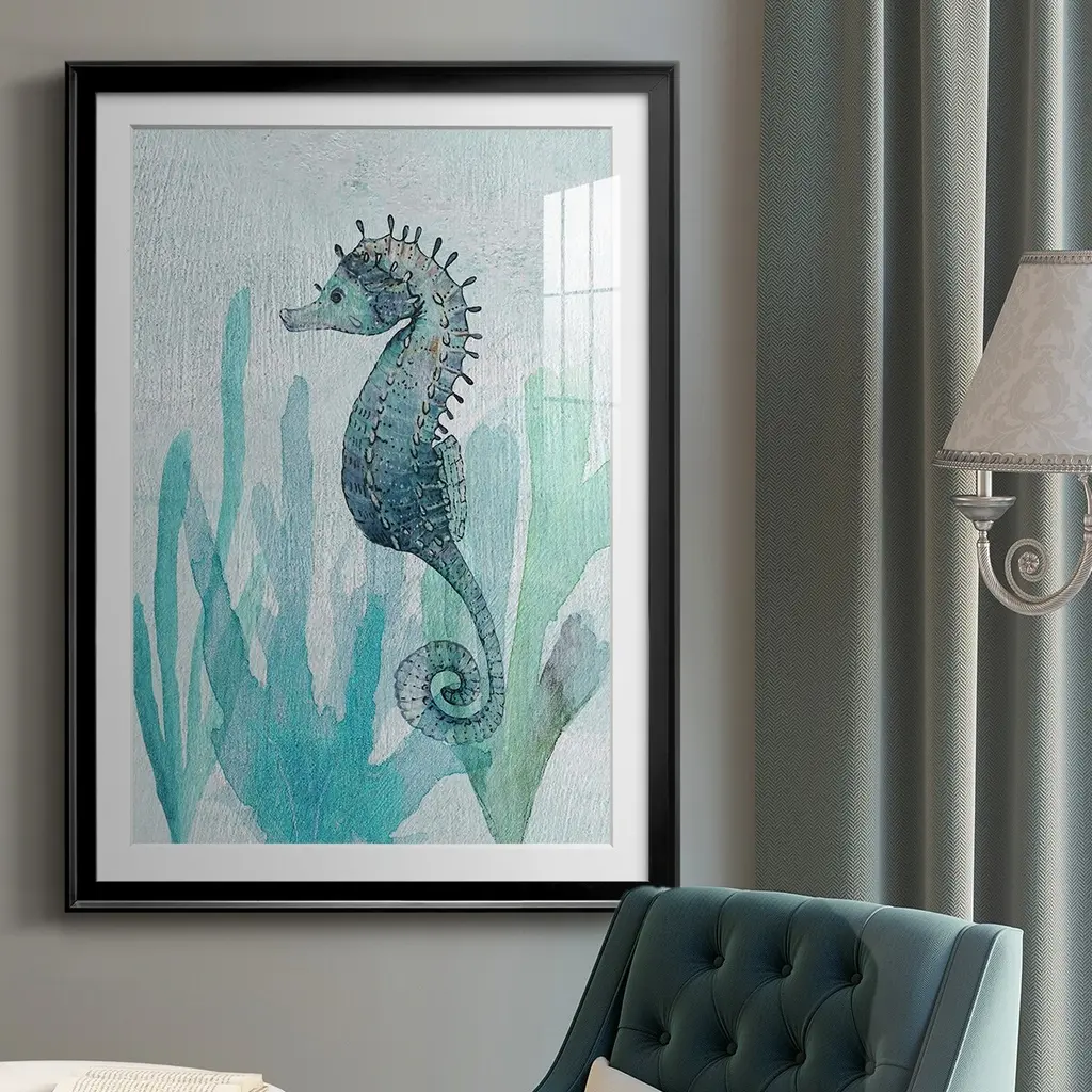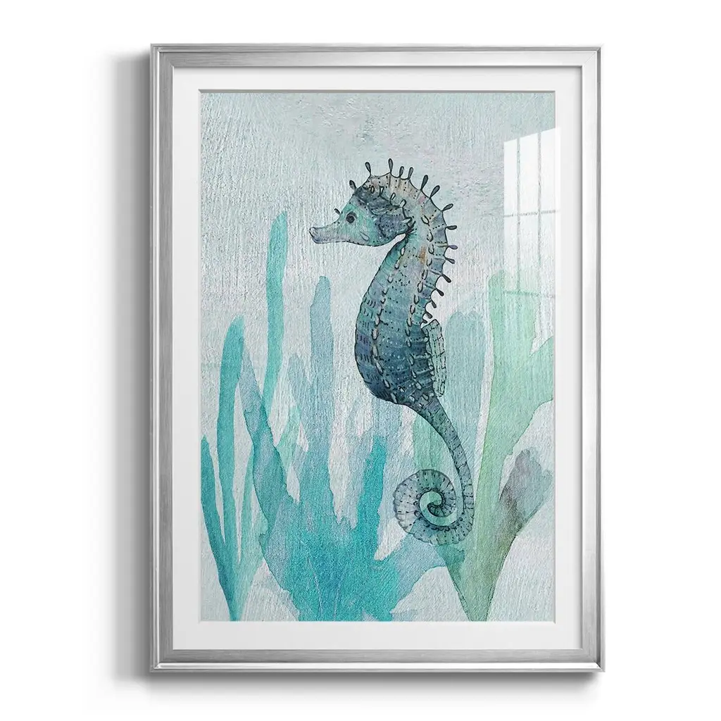 Seahorse II Premium Framed Print - Ready to Hang A Premium Framed Print created to last. Framed in distressed wood and available in an array of sizes and colors Featuring a beveled a solid wood stretcher bar, each piece comes ready to hand 4 SIZES AVAILABLE 30.5''X42.5'' - Overall Size 26.5'X36.5'' - Overall Size 22.5''x30.5'' - Overall Size 18.5''x24.5'' - Overall Size Each piece is made to order. Each piece comes with hanging hardware. Made in the USA Ready to Hang Giclee Paper Print Acrylic Glass Beveled Matt Board