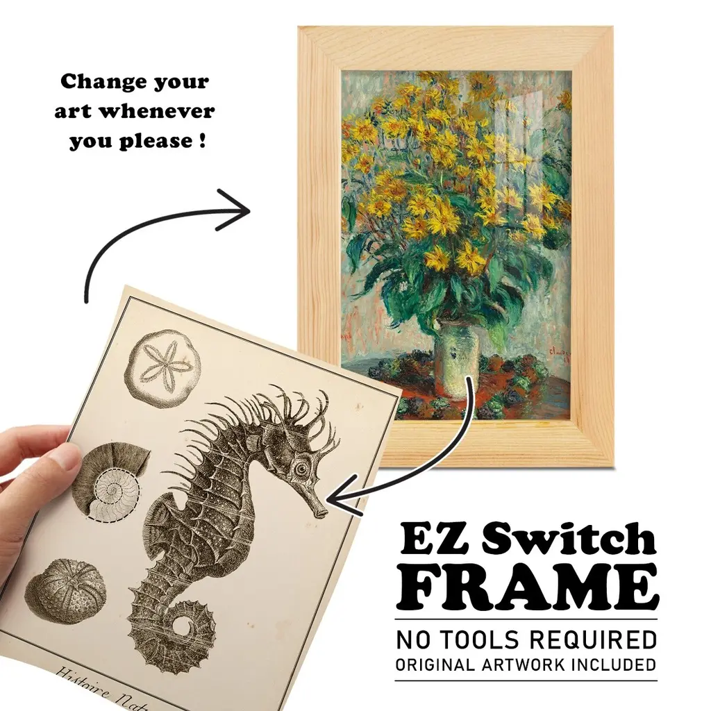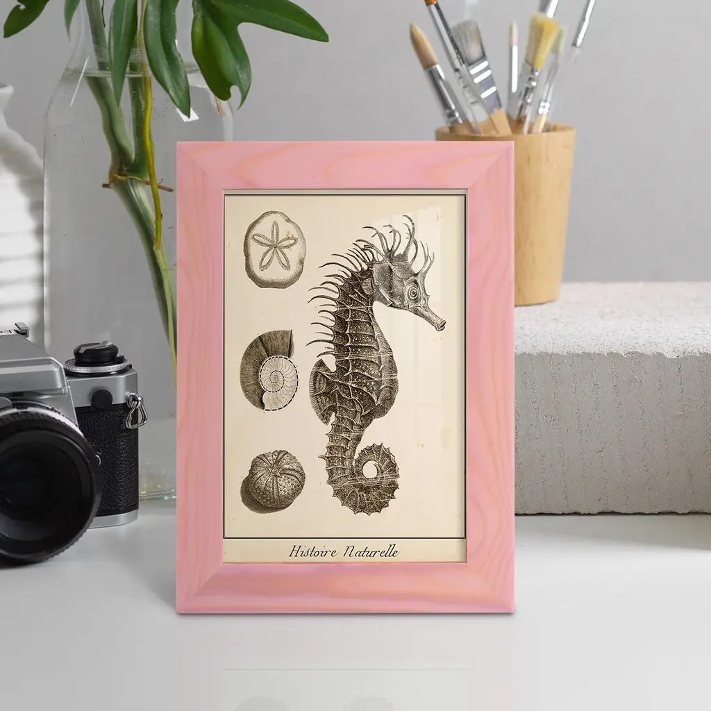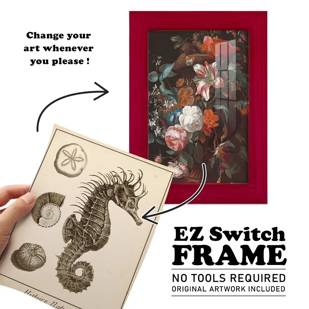 Seahorse Study I -EZ SWITCH Framed Print w/glass-Cherry Red A delightful, framed print. Featuring a solid wood frame with real wood glass. This premium print is giclee quality. In addition, every frame features a removable back and table top stand. This allows you to change your art in the future or to just stand the art on a table for a new look. We are sure you'll enjoy our new series of EZ SWITCH Framed Art. Solid Wood Frame Real Glass Removable / Replaceable Art Built in Tabletop Stand Sizes range from 4x6 up to 12x15 - buy just one or pair them up as sets as you see fit.