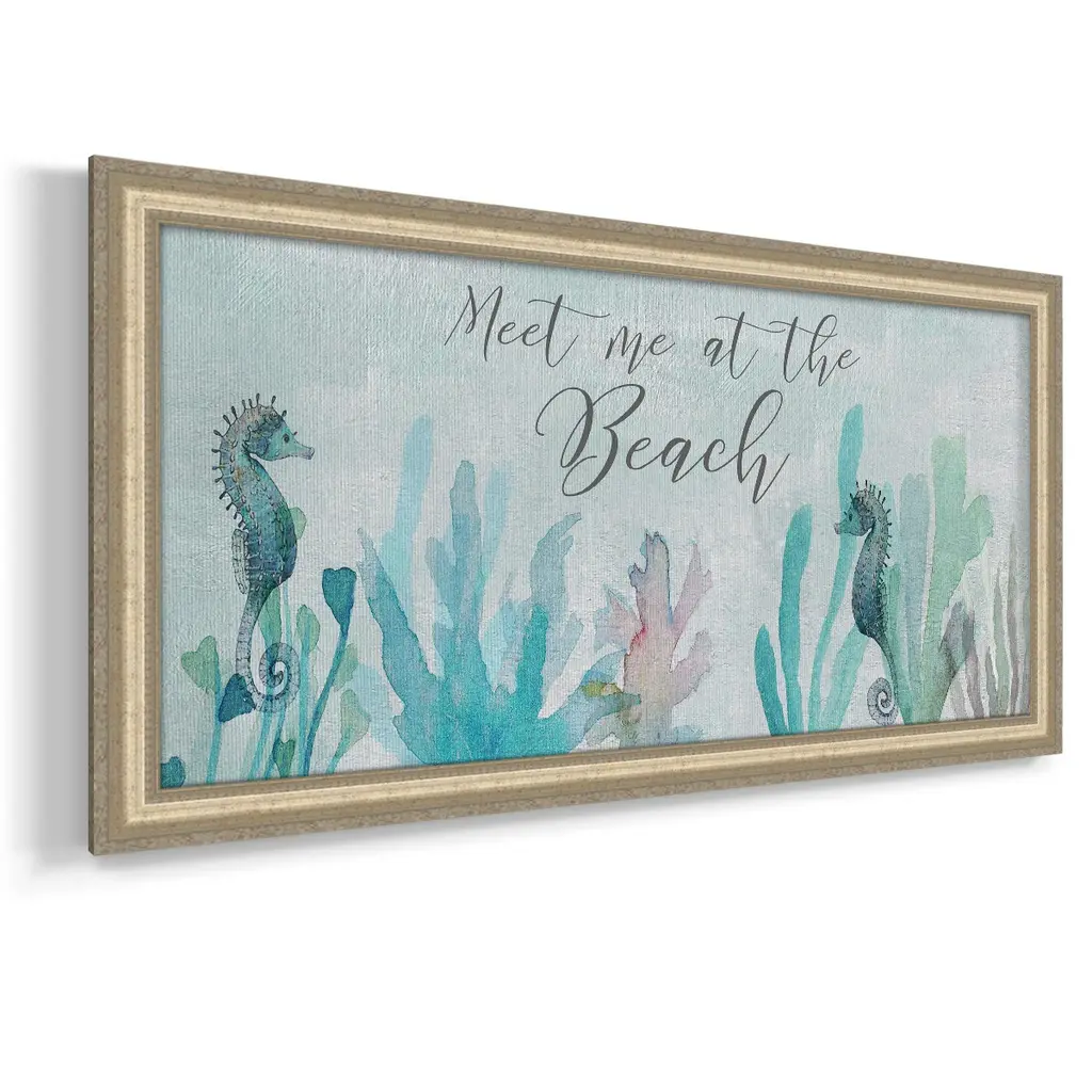 Seahorses and Coral Premium Framed Canvas- Ready to Hang A Premium Framed Canvas created to last. Framed in distressed wood and available in an array of sizes and colors Featuring a beveled a solid wood stretcher bar, each piece comes ready to hand 3 SIZES AVAILABLE 21''X37'' - Overall Size 25''X45'' - Overall Size 29''x53'' - Overall Size Each piece is made to order. Each piece comes with hanging hardware. Made in the USA Ready to Hang Giclee Paper Print Acrylic Glass Beveled Matt Board
