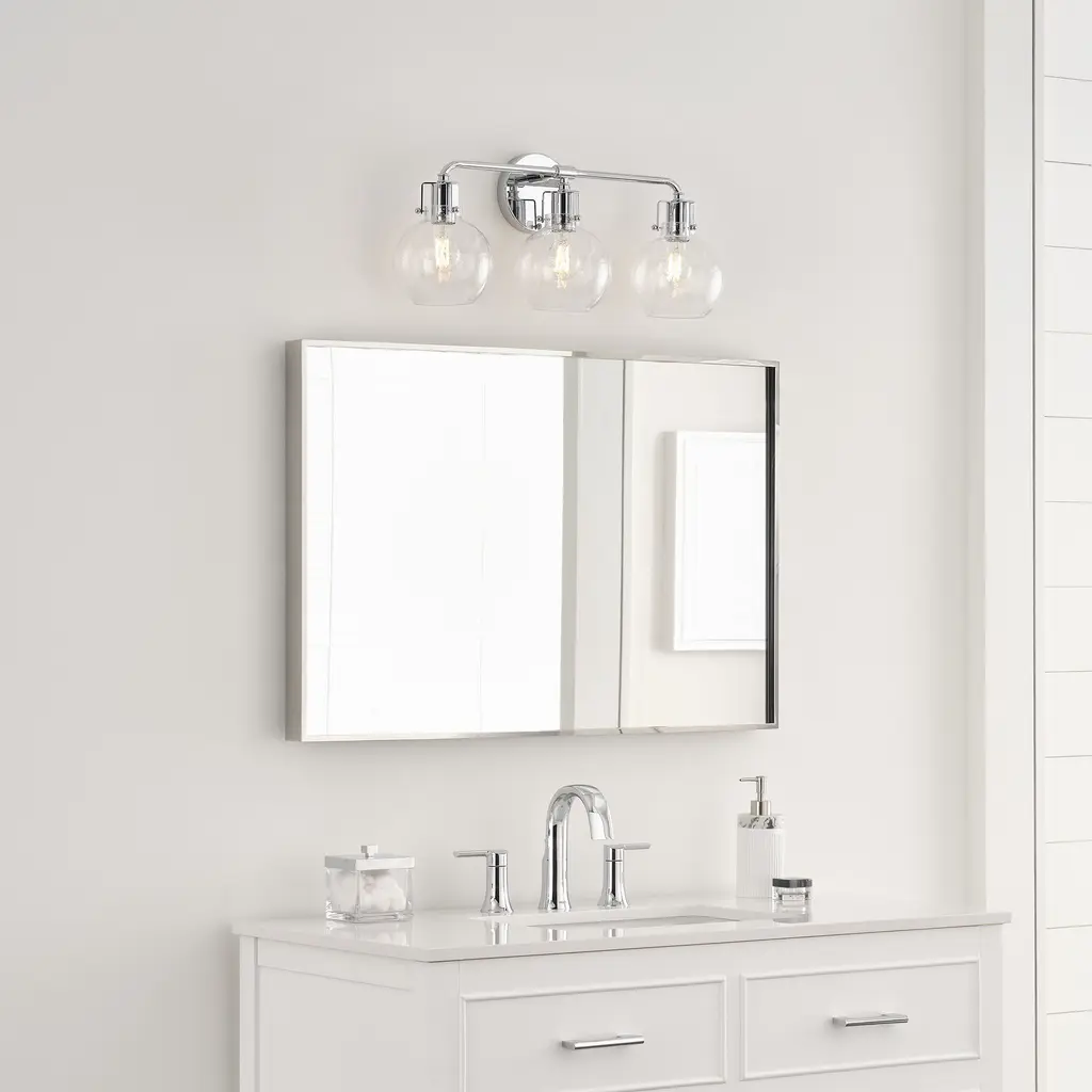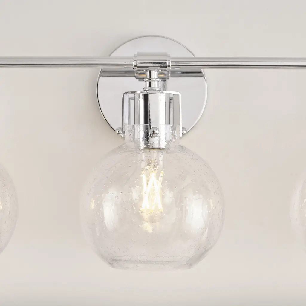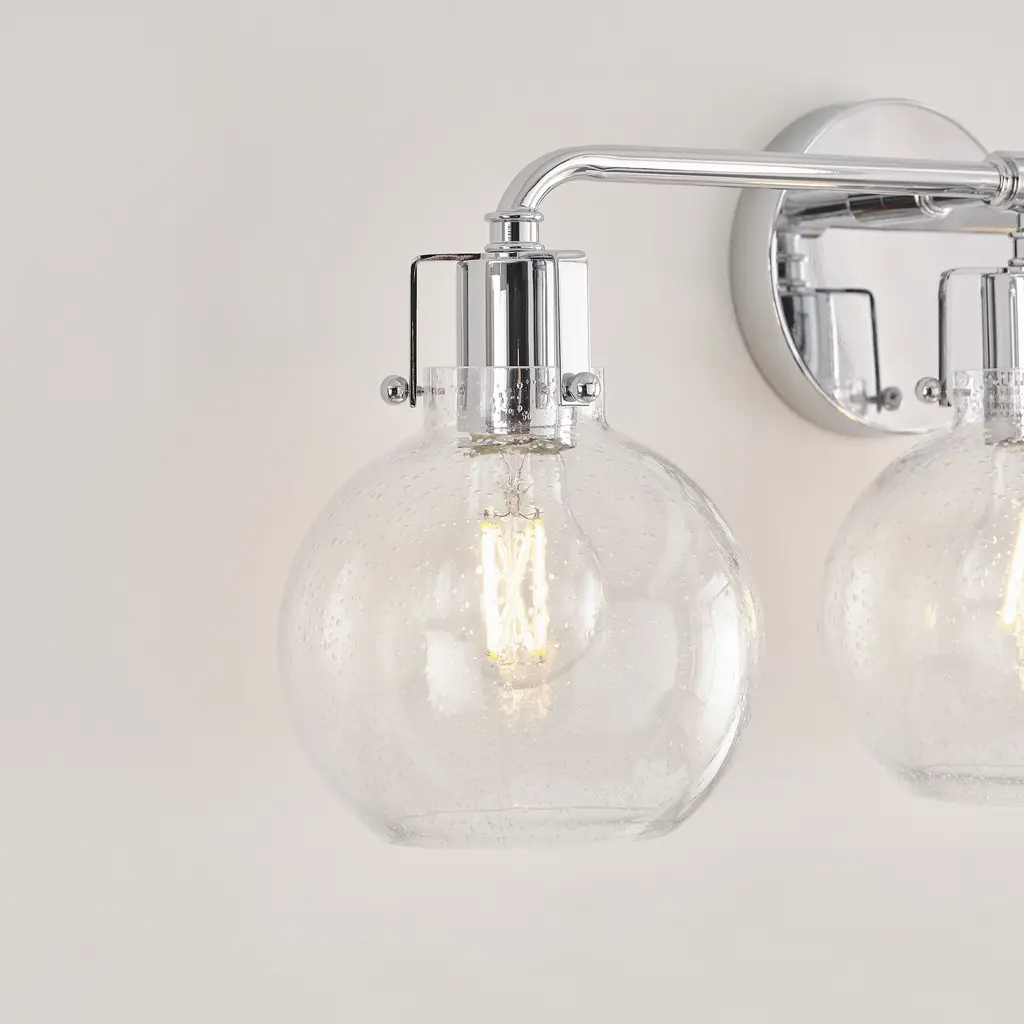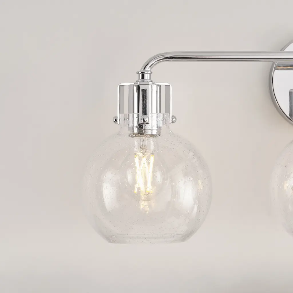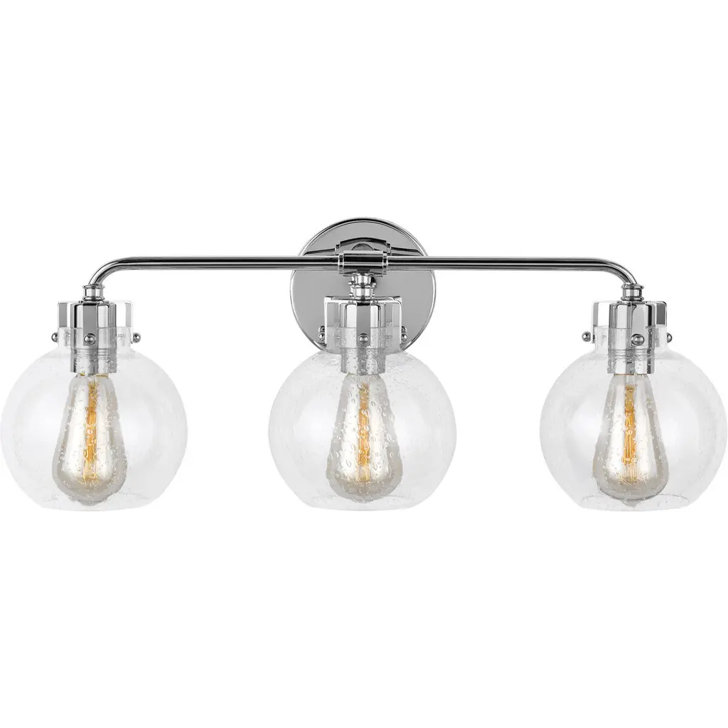Clara features Clear Seeded glass shades that subtly diffuse the lamping while allowing the exposed bulb to be a central design element of the fixture. Choose the look that is right for your space with four finish options: Burnished Brass, Chrome, Satin Nickel, Oil Rubbed Bronze or a two-toned finish of Textured Black with Chrome.