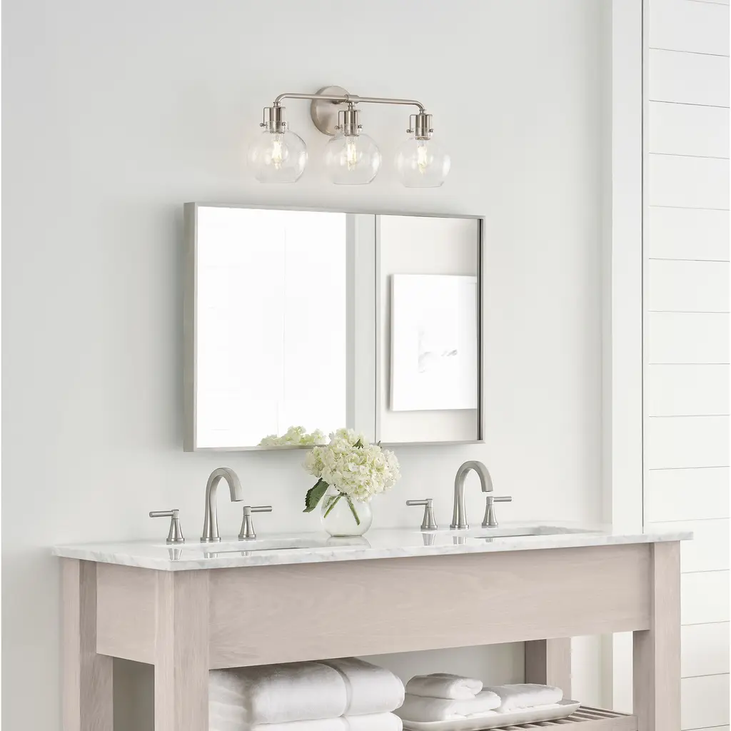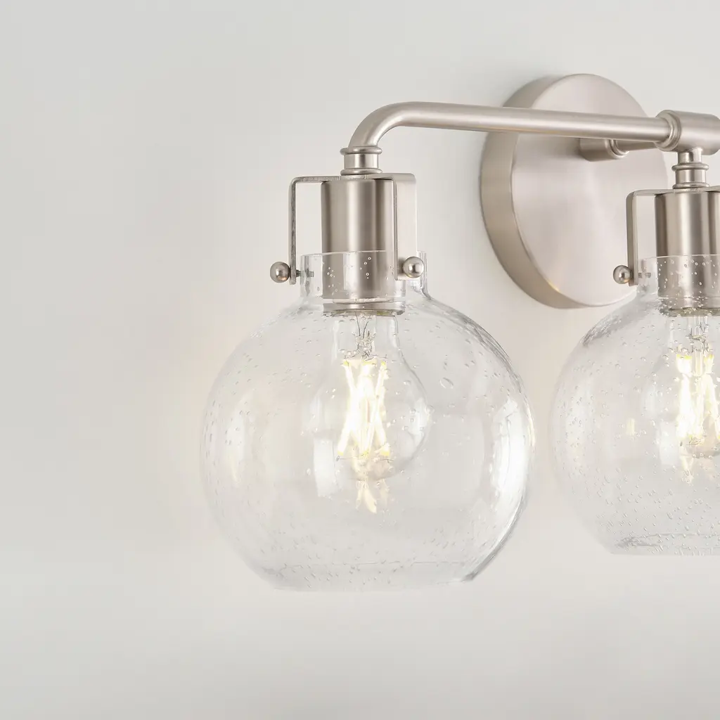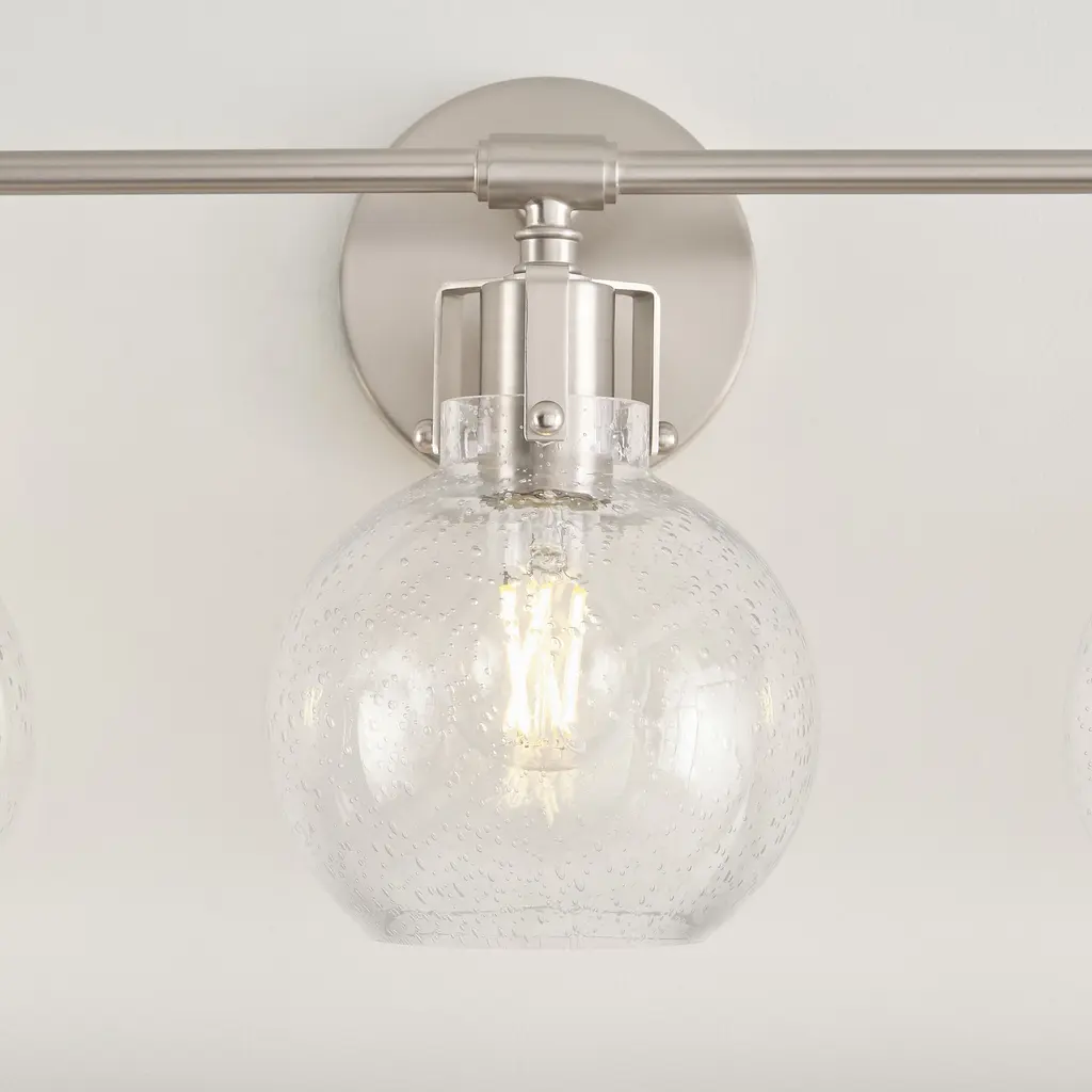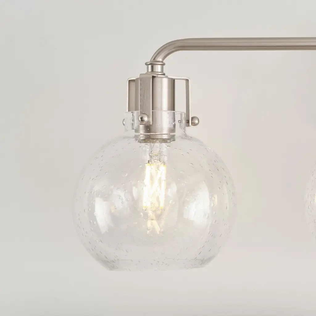 Clara features Clear Seeded glass shades that subtly diffuse the lamping while allowing the exposed bulb to be a central design element of the fixture. Choose the look that is right for your space with four finish options: Burnished Brass, Chrome, Satin Nickel, Oil Rubbed Bronze or a two-toned finish of Textured Black with Chrome.