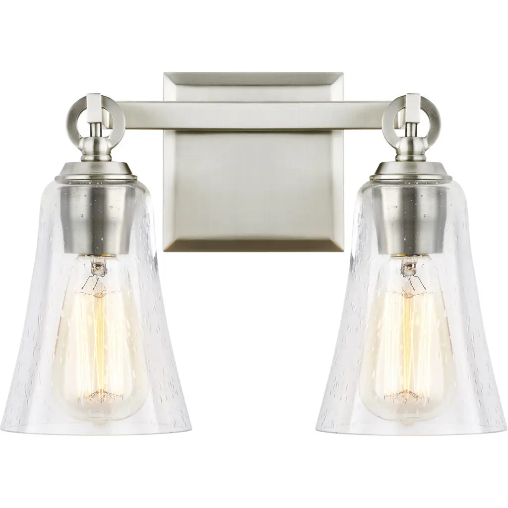 The Sean Lavin Monterro two light vanity fixture in chrome offers shadow-free lighting in your powder room, spa, or master bath room. Monterro features beautiful tapered glass shades and exquisite cast details, including a cast backplate, cast ring, and hook hardware that elegantly supports the shades. The Chrome version is available with two glass options; either White Opal Etched glass or Clear Seeded glass, while the Burnished Brass, Satin Nickel finish is available in Clear Seeded glass only.