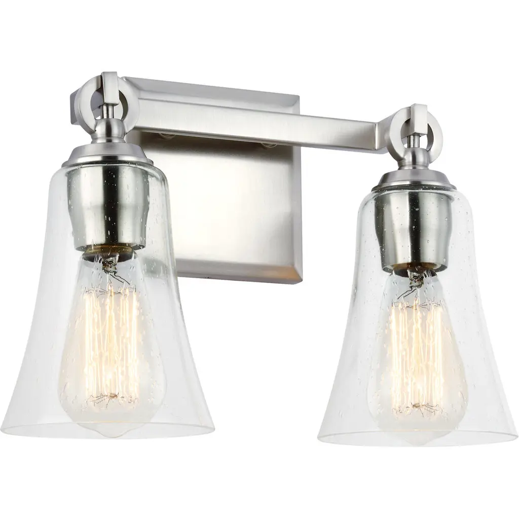 The Sean Lavin Monterro two light vanity fixture in satin nickel offers shadow-free lighting in your powder room, spa, or master bath room. Monterro features beautiful tapered glass shades and exquisite cast details, including a cast backplate, cast ring, and hook hardware that elegantly supports the shades. The Chrome version is available with two glass options; either White Opal Etched glass or Clear Seeded glass, while the Burnished Brass, Satin Nickel finish is available in Clear Seeded glass only.