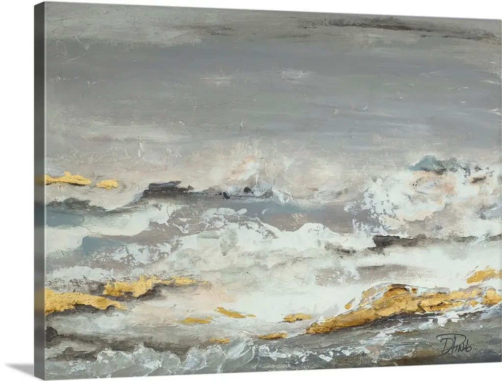 Horizontal landscape painting of a rocky seashore done is textured neutral tones.