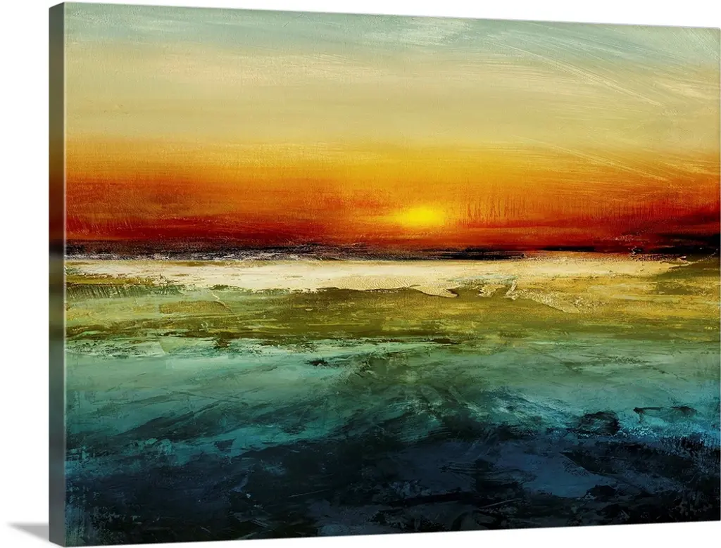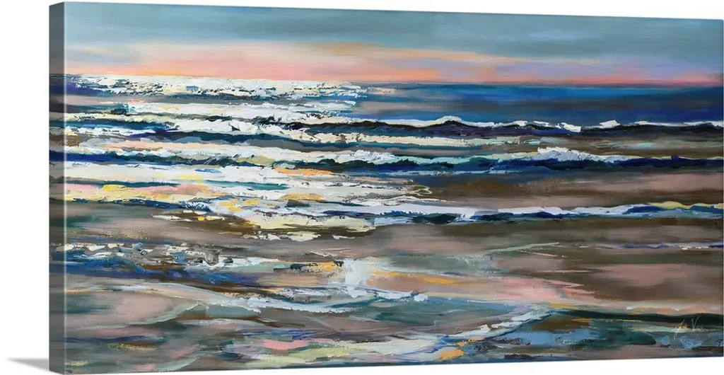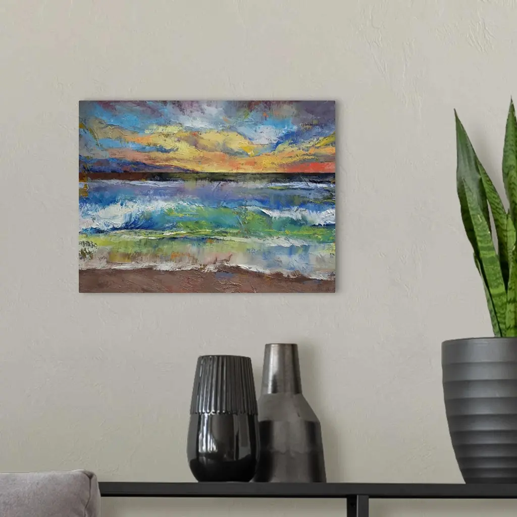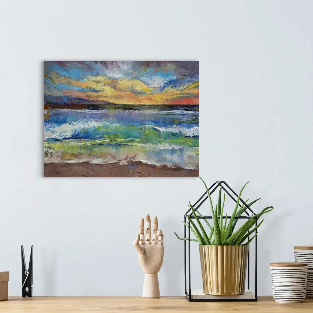 A beautiful painting that uses all different colors to create a sunset over the ocean with waves crashing onto the beach.