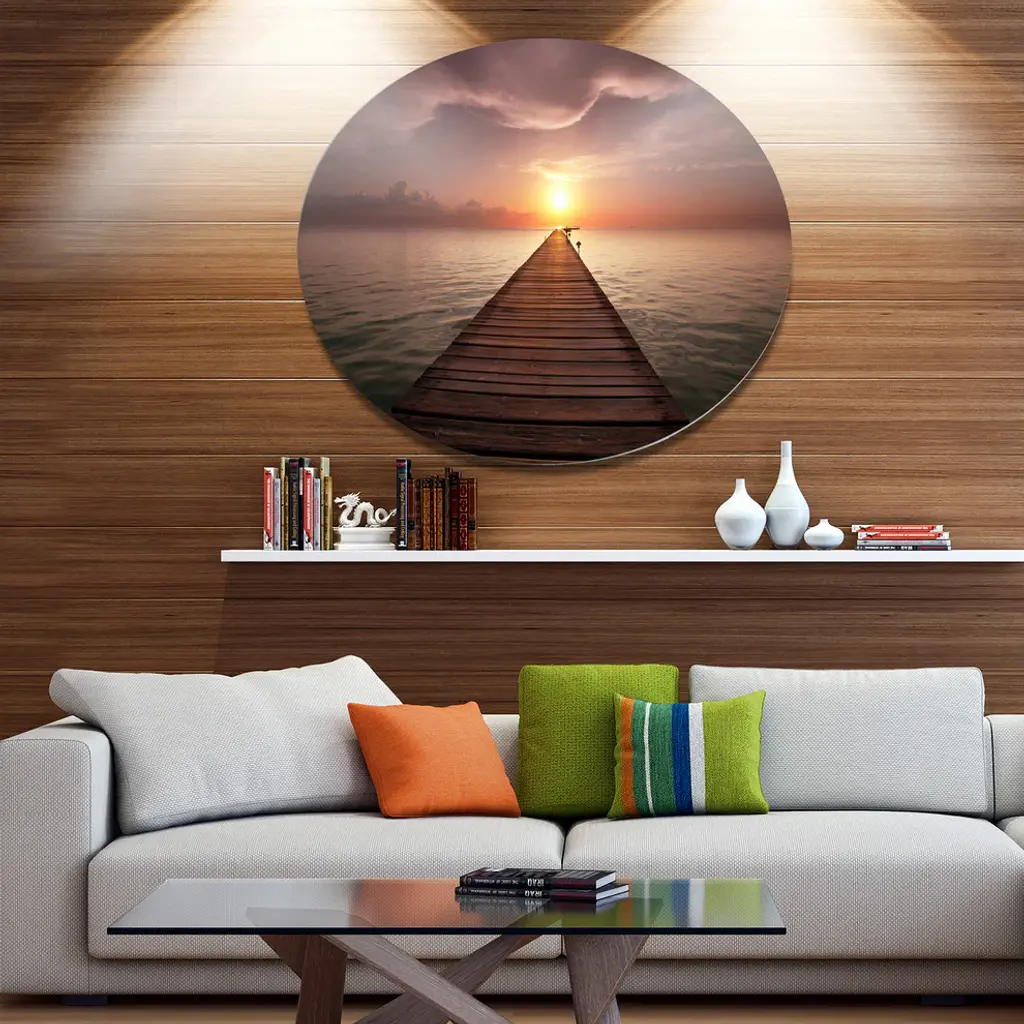 Bring Contemporary Abstraction to your home with this large Circle Metal wall art. This Seashore Boardwalk into the Sun Metal Artwork makes it the focal point of any room or office. - White Gloss Coating ensures colors are extra vibrant with light reflection.- Aluminum grade Sheet Metal with 1 inch mounting frame on the back giving the illusion that the artwork is floating on the wall..- Mounting Brackets are included along with instructions.- High Quality Digital images are created directly into a glossy aluminum panel producing a stunning and captivating print into the glossy finish of the metal.- Water, Fire and Scratch resistant HD Aluminum panels.- Looks better than any photo paper and guaranteed to last at least 20 years- Easy to clean with a microfiber cloth. Colors are far superior to regular Canvas Art. - Easy to Hang