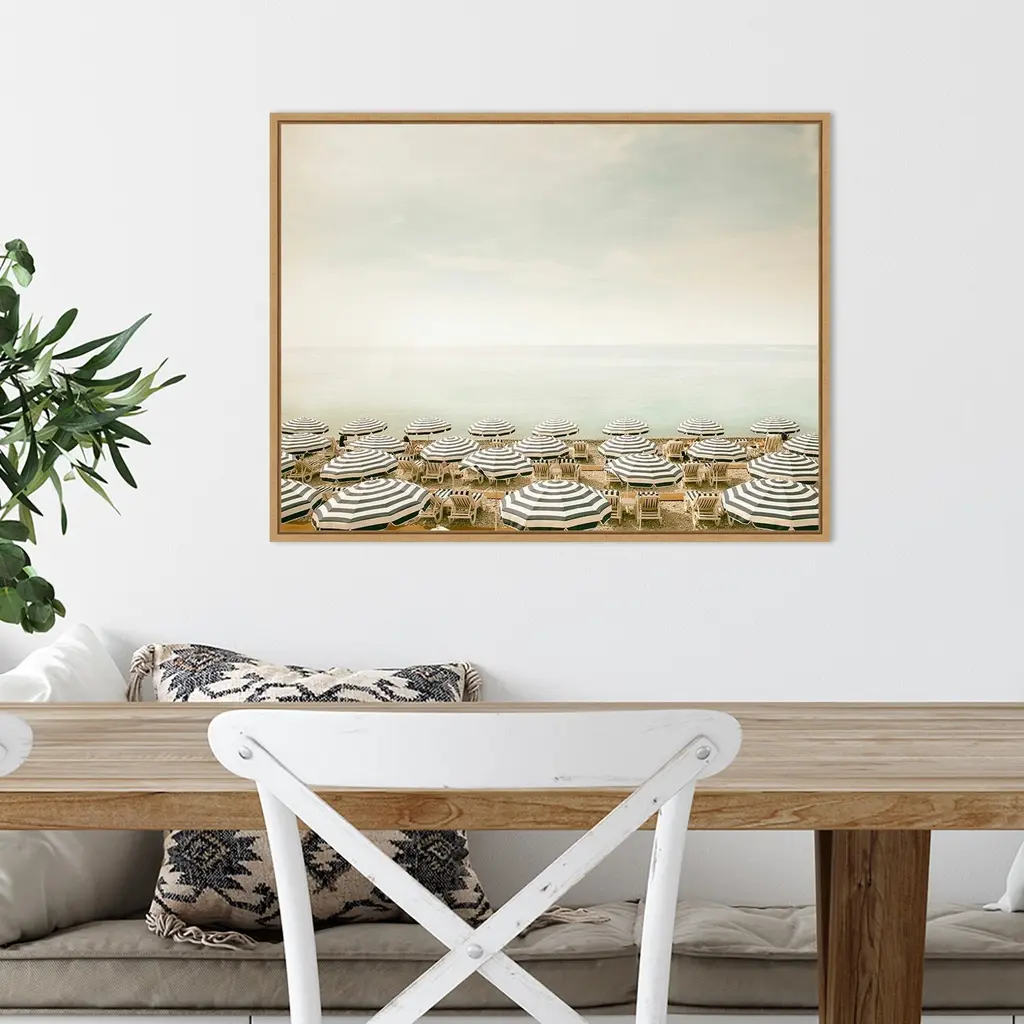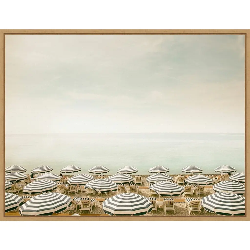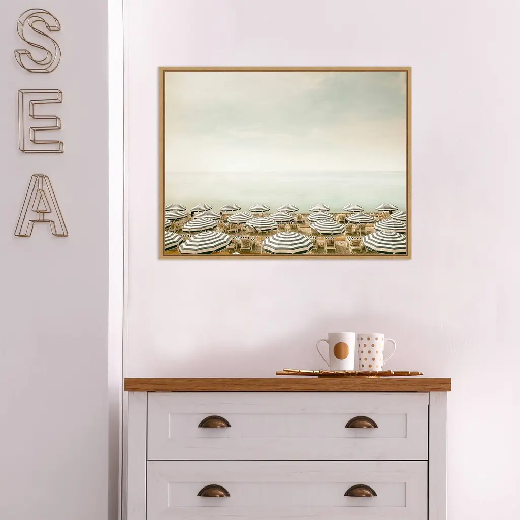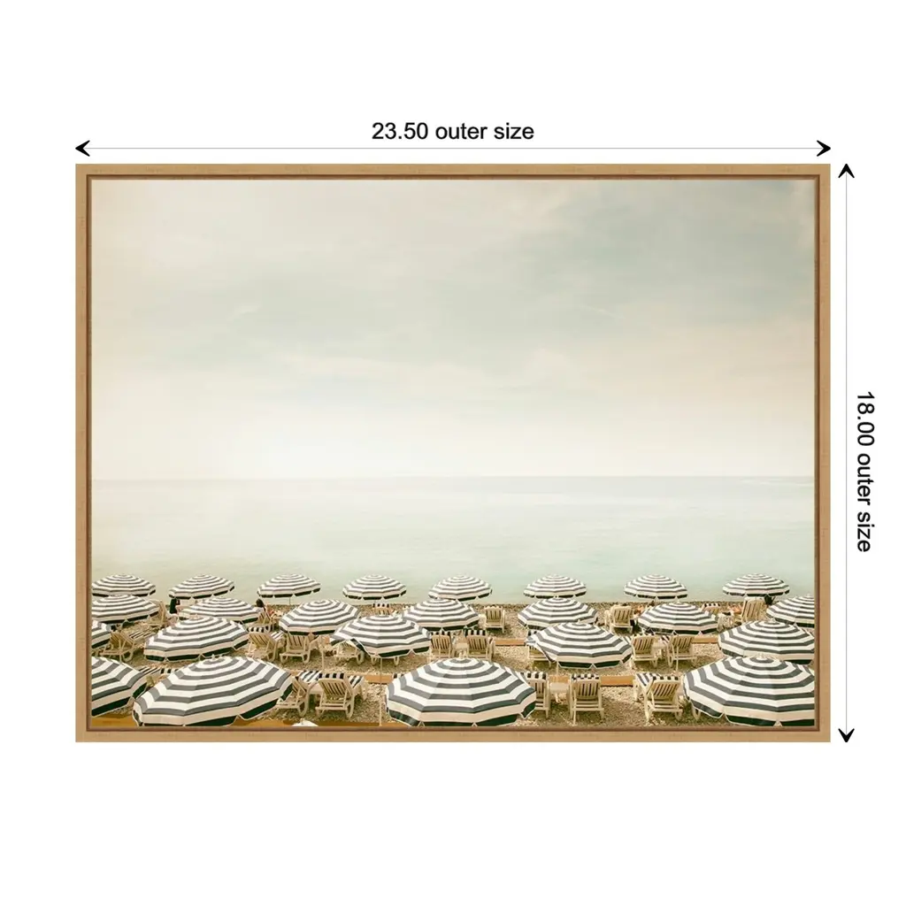The pale aqua color of a still and peaceful sea is contrasted by multiple rows of navy and white beach umbrellas and lounge chairs spread out across the sand. Sunbathers can be seen taking advantage of the sunny day.Features:FLOAT FRAMED CANVAS ART: Canvas is framed in a floated style that showcases a narrow gap between the edge of the gallery wrapped canvas and the frame. The wrapped canvas appears as if it's "floating" on the frame. The overall look is clean, modern and upscale.QUALITY: Canvas is printed with high quality, fade-resistant inks and stretched to hide corner folds. Canvas is stretched across a solid surface to resist sagging.AUTHENTICITY: Canvas is printed and professionally framed in Madison, Wisconsin USA with authentically licensed artwork.EFFORTLESS HANGING: Ready to hangfor easy installation. The metal sawtooth hangers come attached on the inset back for easy wall display.CUSTOM PACKAGED: Canvas is custom packaged for protection in shipment to arrive without damage.Details:Artist: Carina OkulaTitle: Seaside 4 (Beach)Product type: Framed Canvas BoxStyle: Modern ContemporaryFormat: landscapeSize: MediumSubject: PhotographyFrame: Sylvie Maple .5"Image dimensions: 16.50 inches high x 22 inches wideOutside dimensions: 18 inches high x 23.50 inches wide x 1.875 inches deep