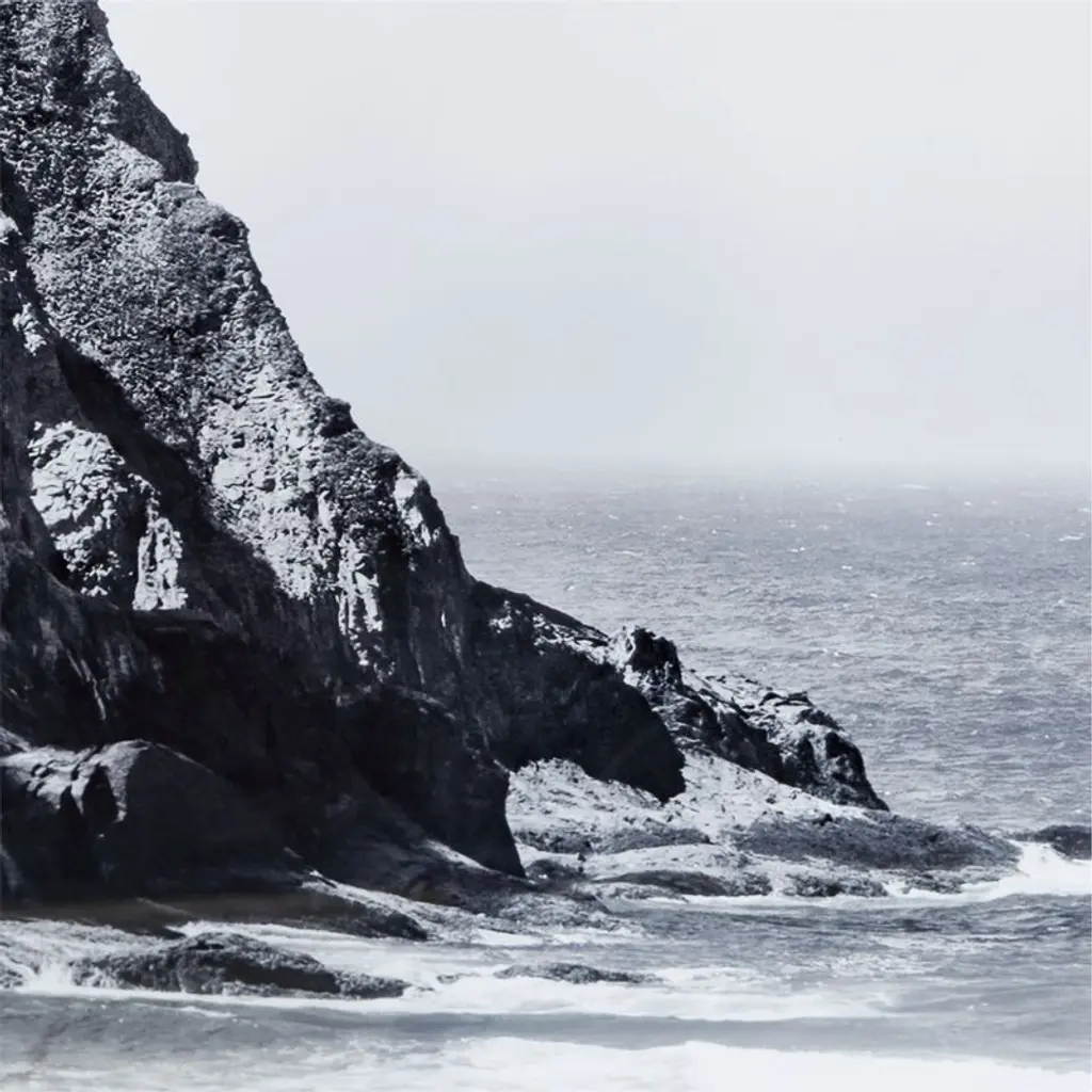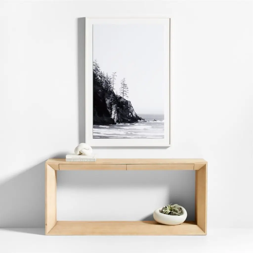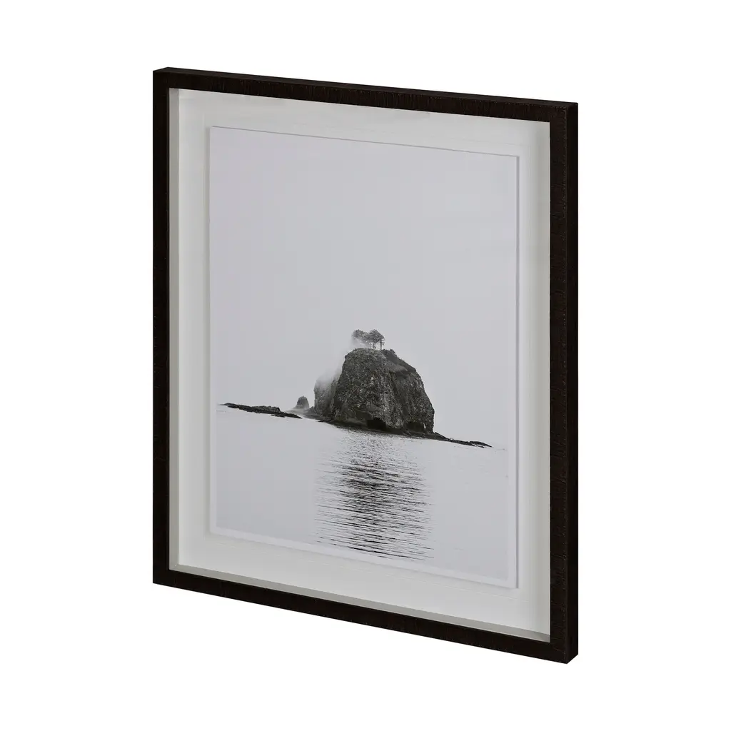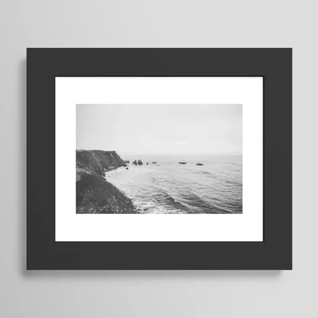 Depicting a spot where forest meets ocean, Eric Muhr focused his lens on this dramatic cliffside. The image explores the full range of black-and-white photography, from the deep blacks of the rocky shadows to the white surf and mid-greys of the sea. Each print is presented in a whitewash wood frame under acrylic glass for a clean, modern look.