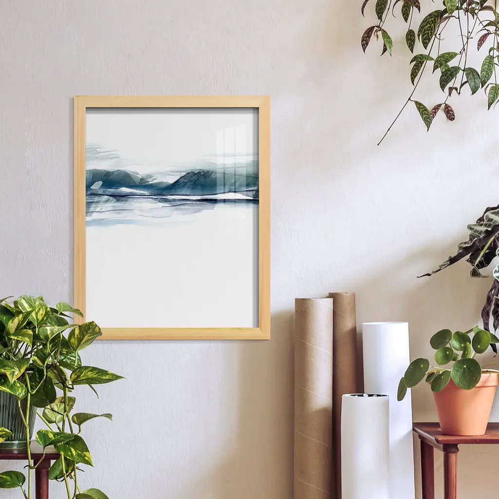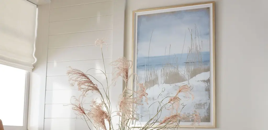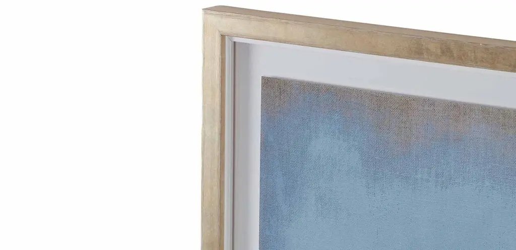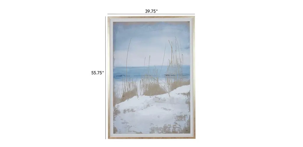 Artist Paul Ngo brings a modern perspective to the classic seaside painting. Through a unique process of drizzling, scraping, brushing, and layering paints, he creates a serene scene: a low-hanging sunrise above a calm coastline. Simply illustrated in soothing blue, beige, and white shades, and framed in a pale gold frame with a white fillet, this seaside artwork adds fresh sophistication to quintessential coastal style.