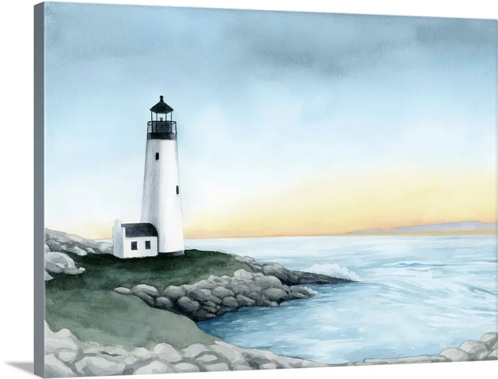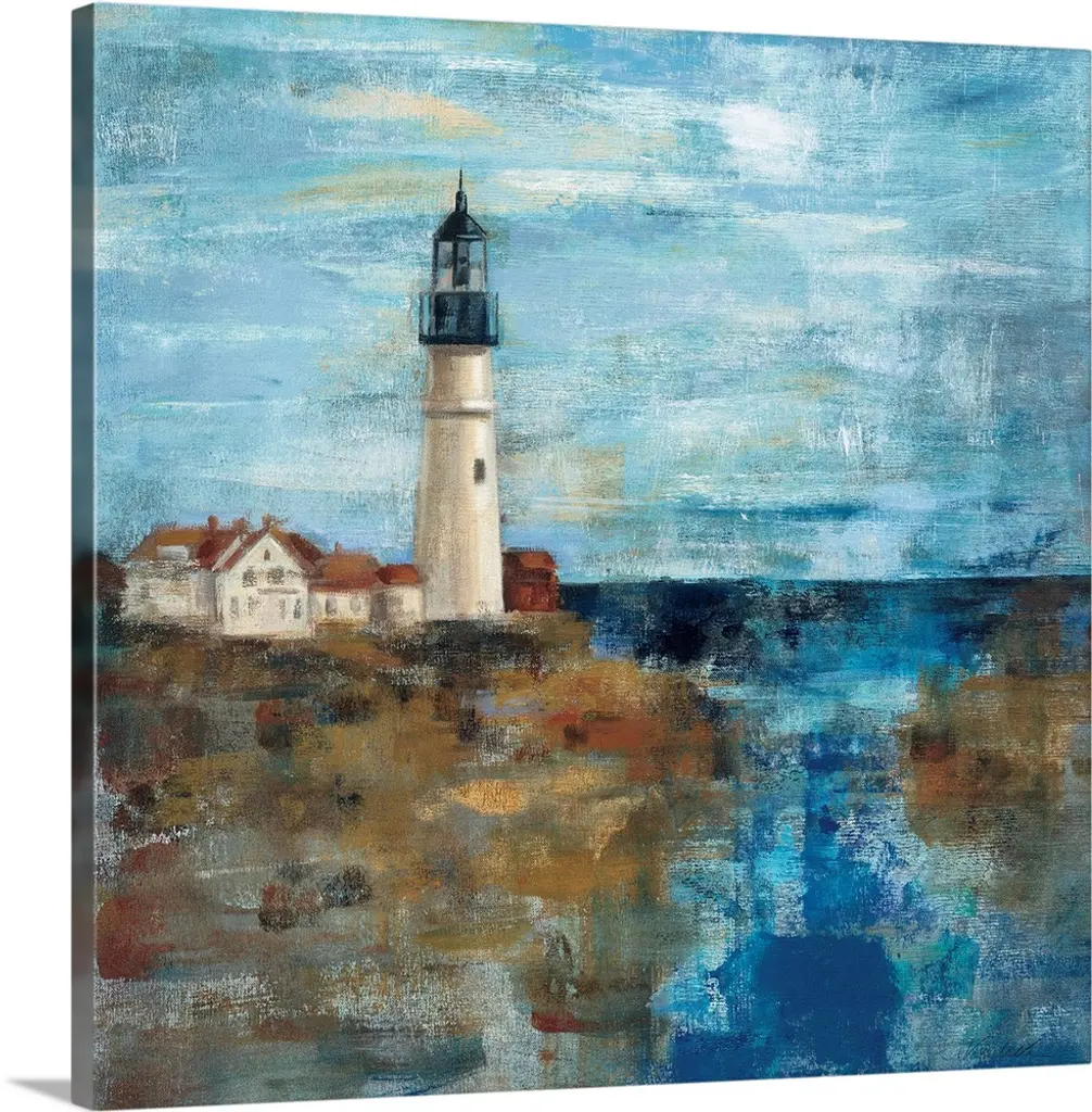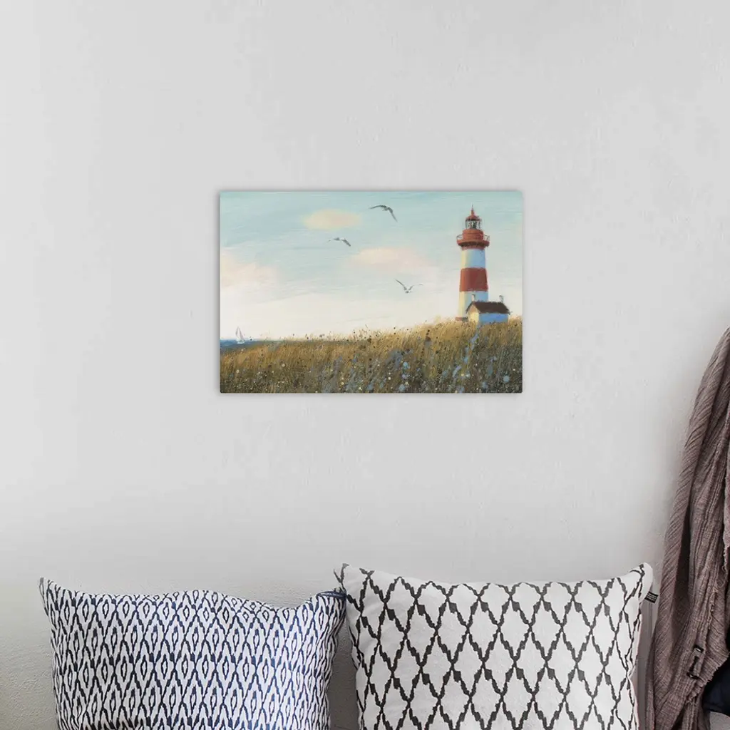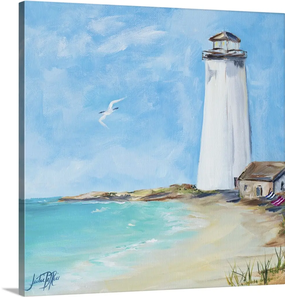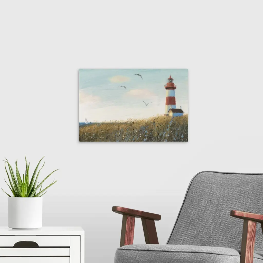 Contemporary painting of a lighthouse overlooking the ocean with three seagulls flying by.