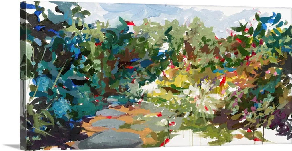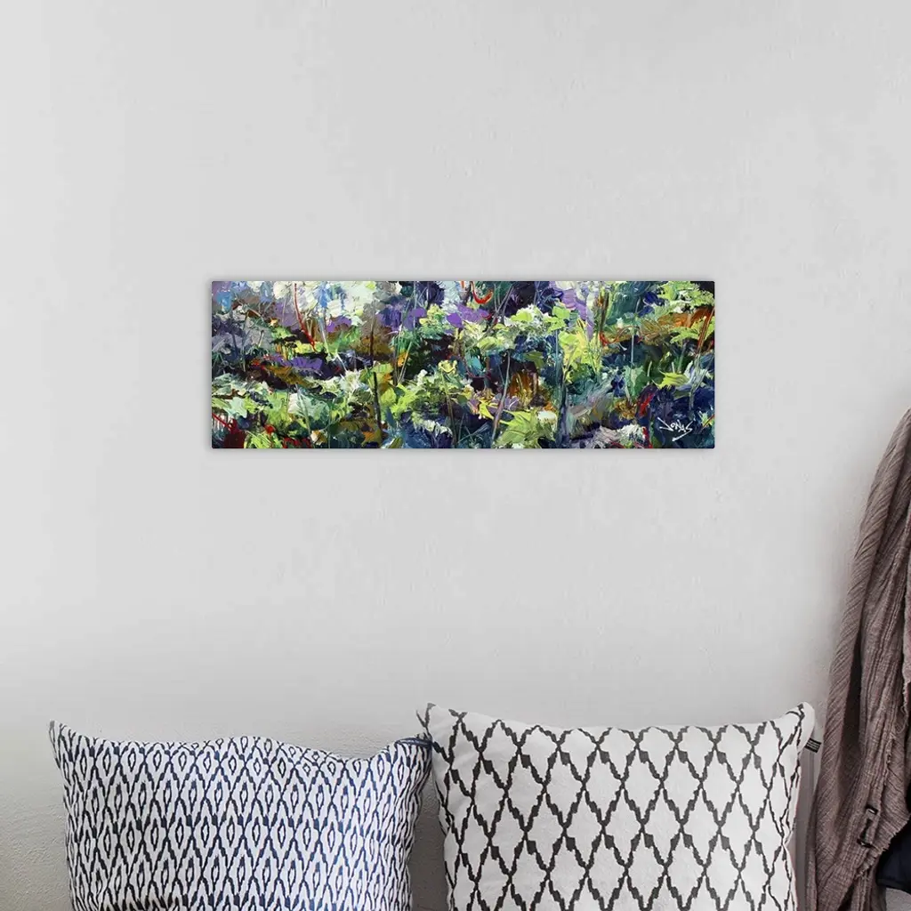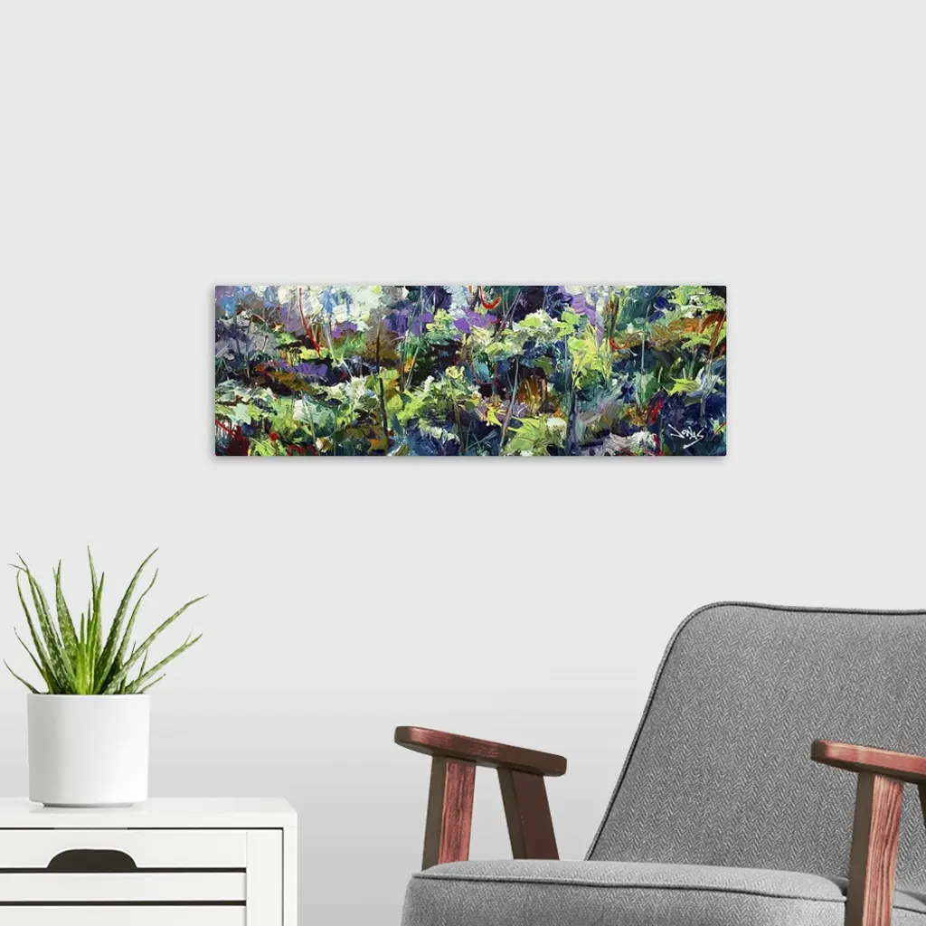 A contemporary abstract painting of a forest scene in vibrant green and purple tones.