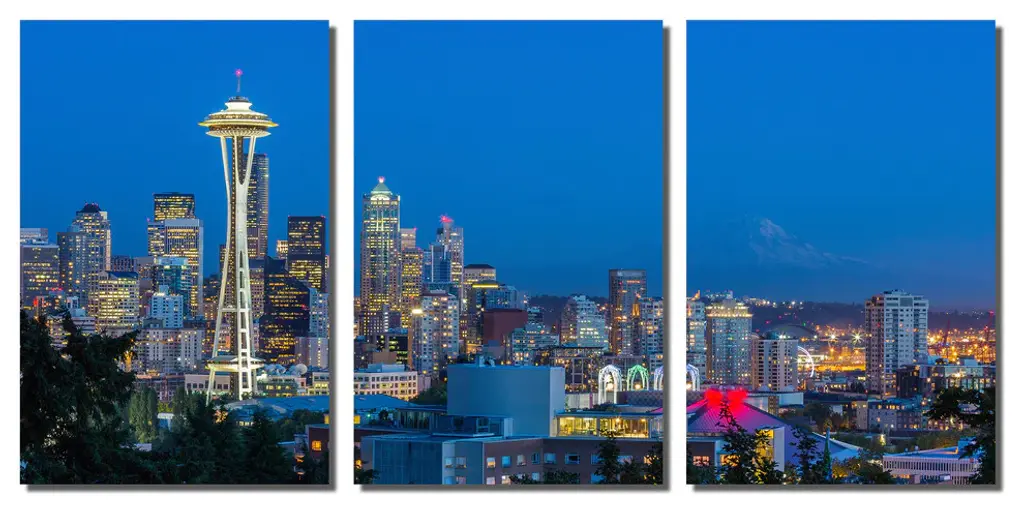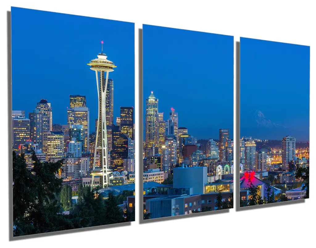 60"œ x 30"œ total size. Ready To Hang! (3 pieces - 20"œ x 30"œ each). 3 Panel Split (Triptych) Metal Print ft. evening view of Seattle, Washington Skyline & Mt. Rainier in the background. Modern metal wall art for home or office wall decor & interior design. Printed on Luxurious, HD aluminum glossy metal panels. Multi Panel. HD aluminum panels. Metal print wall art. Includes Shadow Wall Mount on the back.• Aluminum Metal Wall Art• Made in USA• Ready to hang - No assembly required• Shadow mount hardware on the back• 0.045"œ thick HD Aluminum Panels• Scratch resistant, glossy finish• Superb color clarity, luxurious prints• Epson printing process• For indoor or moisture rich environment use• Easy to clean. Gently wipe with microfiber cloth.