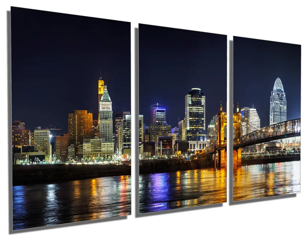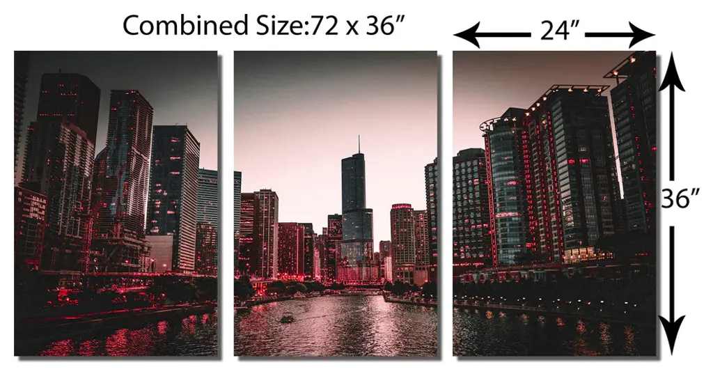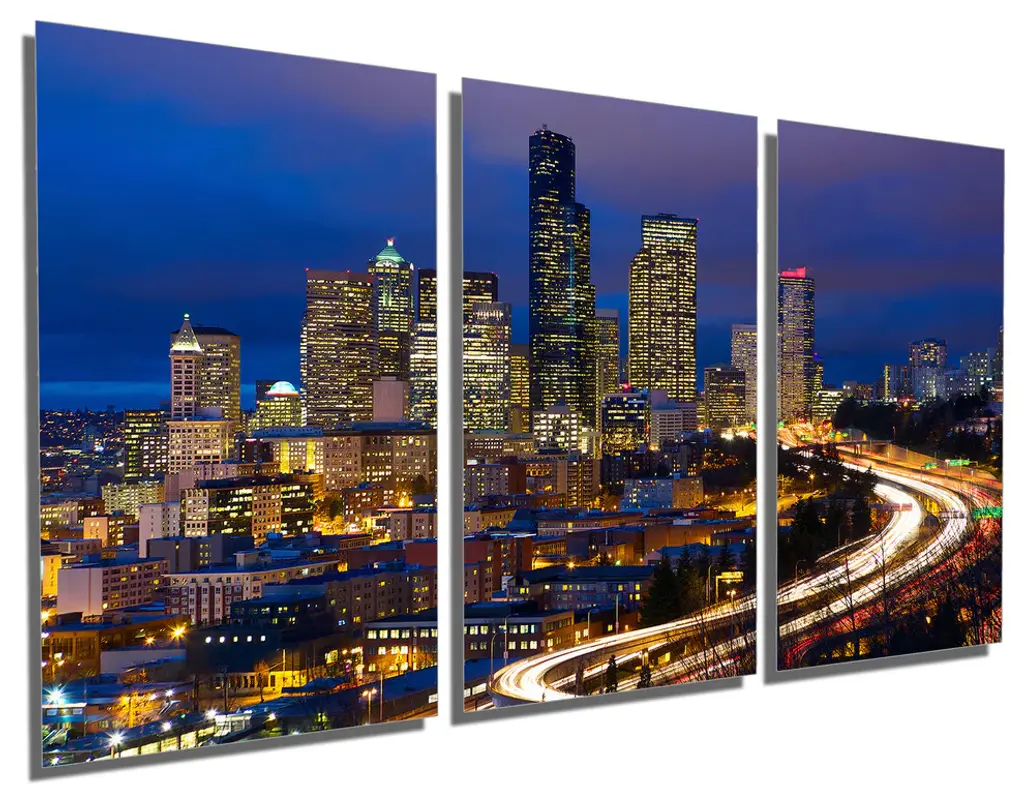 72"œ x 36"œ total size. Ready To Hang! (3 pieces - 24"œ x 36"œ each). 3 Panel Split (Triptych) Metal Print of Seattle, WA skyline at dusk. Modern metal wall art for home or office wall decor & interior design. Printed on Luxurious, HD aluminum glossy metal panels. Multi panel art.. HD aluminum panels. Metal print wall art. Includes Shadow Wall Mount on the back.• Aluminum Metal Wall Art• Made in USA• Ready to hang - No assembly required• Shadow mount hardware on the back• 0.045"œ thick HD Aluminum Panels• Scratch resistant, glossy finish• Superb color clarity, luxurious prints• Epson printing process• For indoor or moisture rich environment use• Easy to clean. Gently wipe with microfiber cloth.
