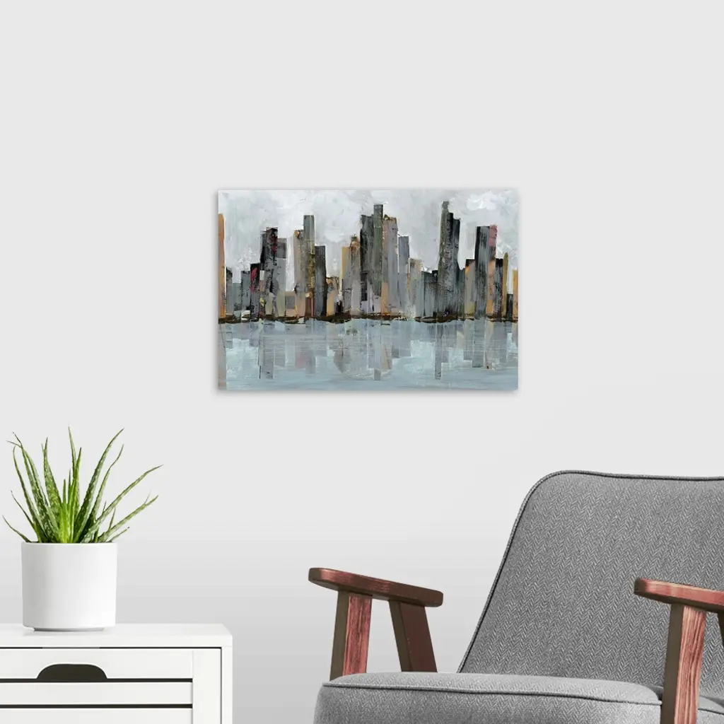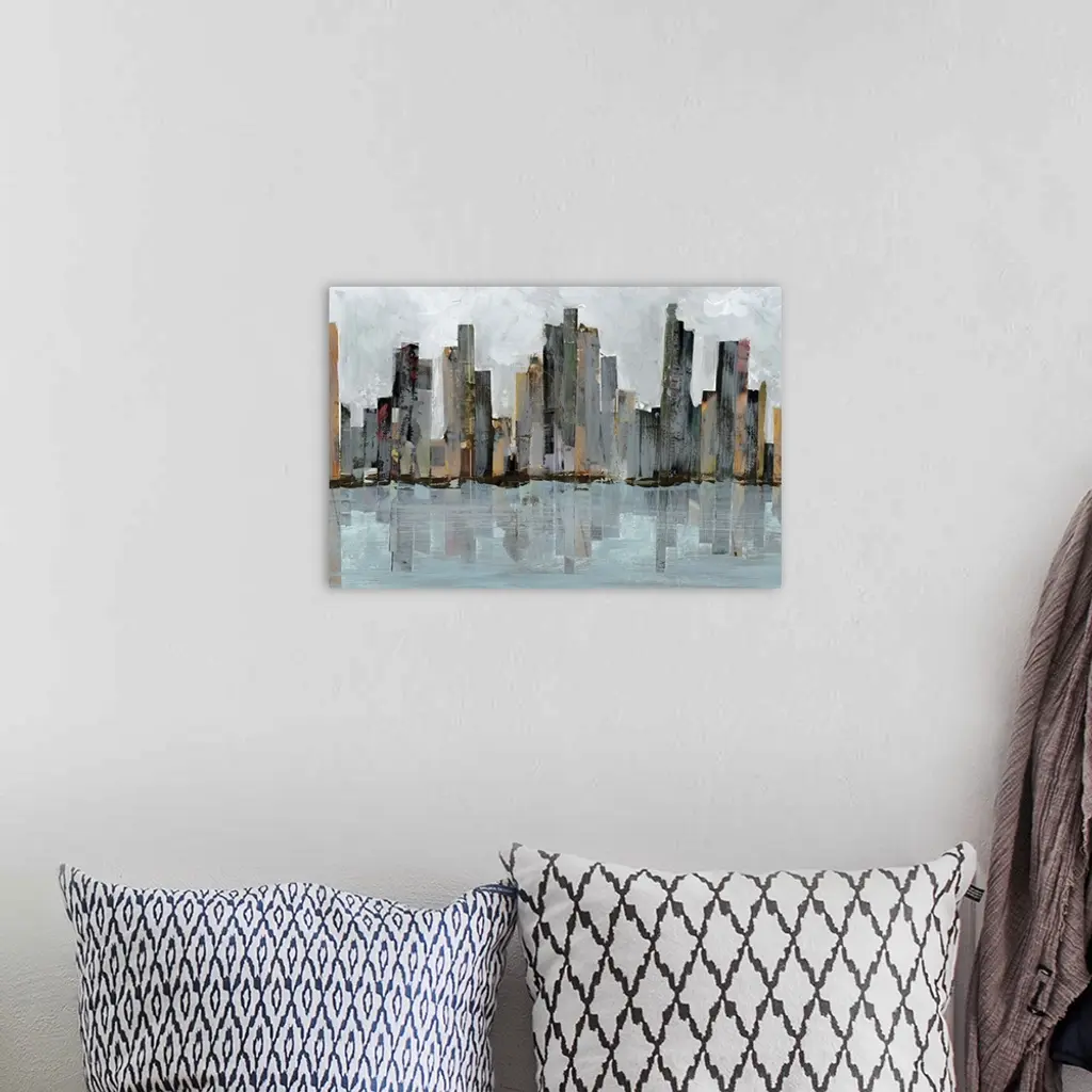 Contemporary abstract painting of a city skyline seen from across a river while casting a reflection on the water below.