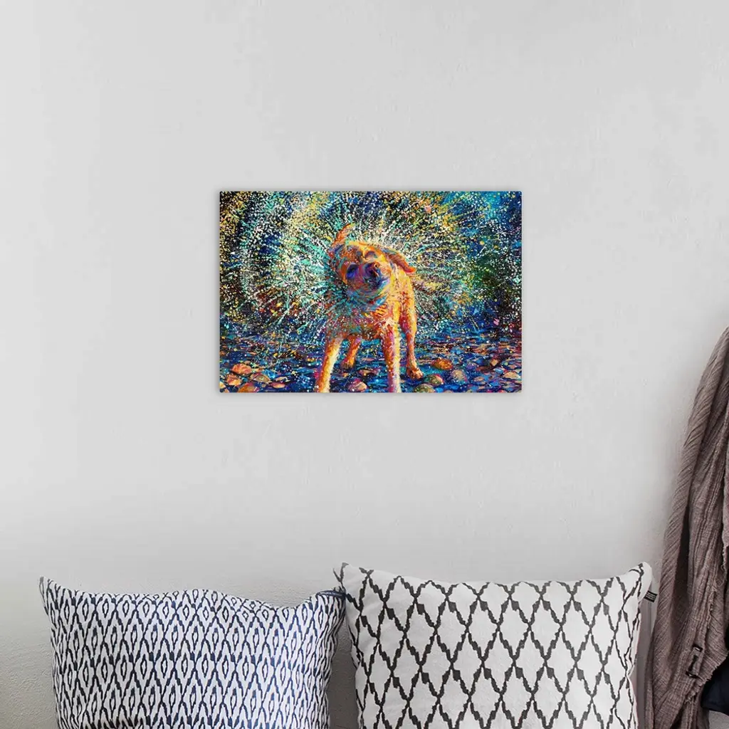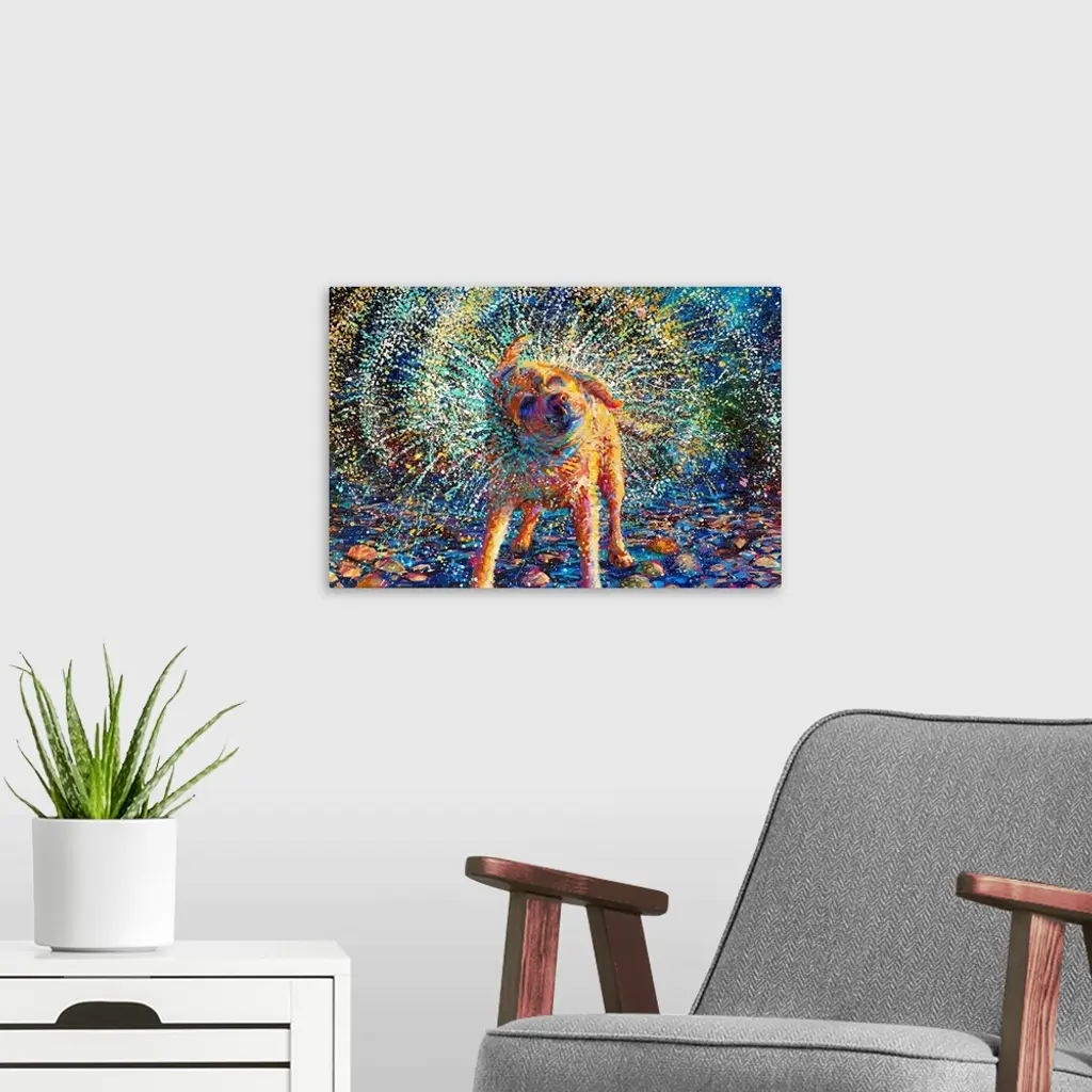 Brightly colored contemporary artwork of a tan dog shaking off water.