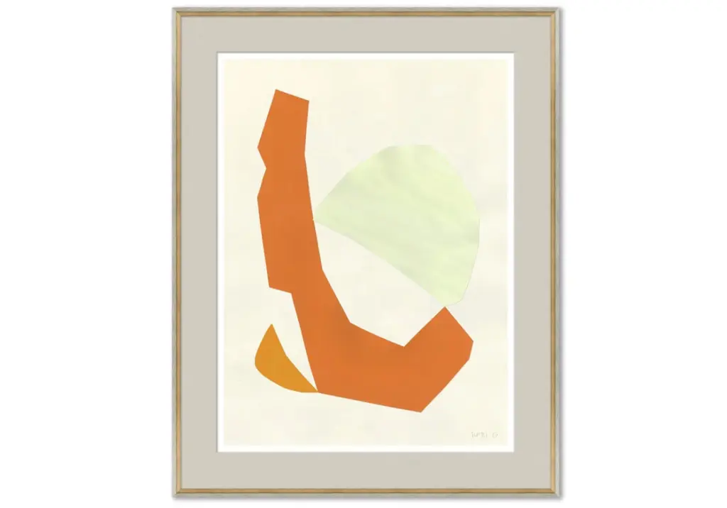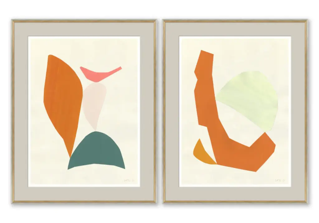 This artwork lends an interesting, abstract look with its orange geometric shapes set on a neutral background. Its natural wood frame complements its versatile look, styling well into living rooms, bedrooms, and hallways. Style one alone or pair both together as a set.