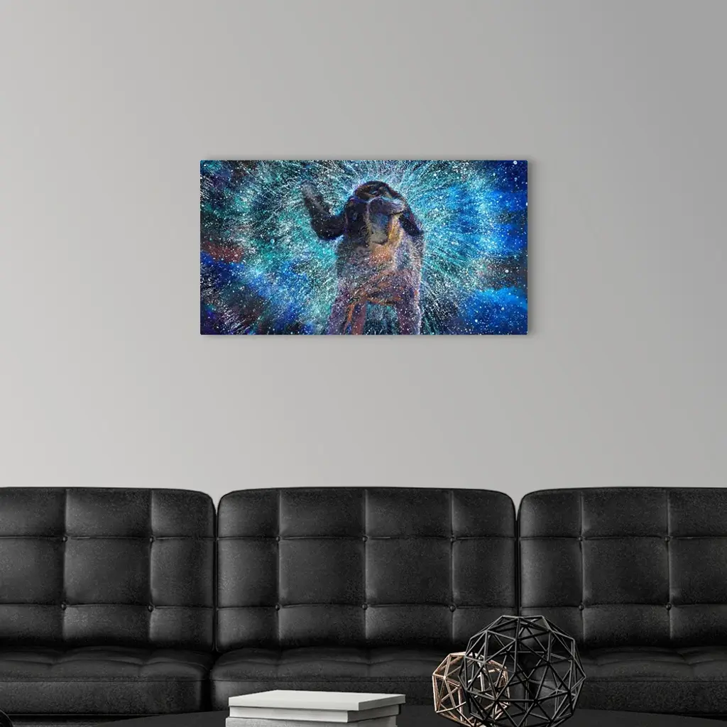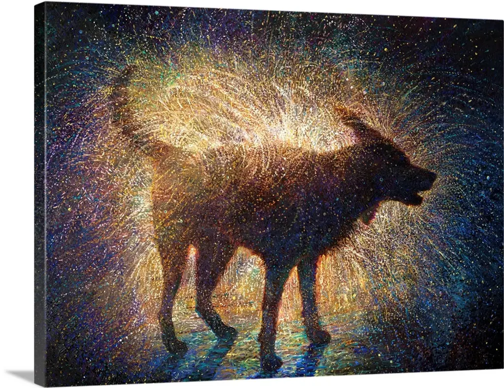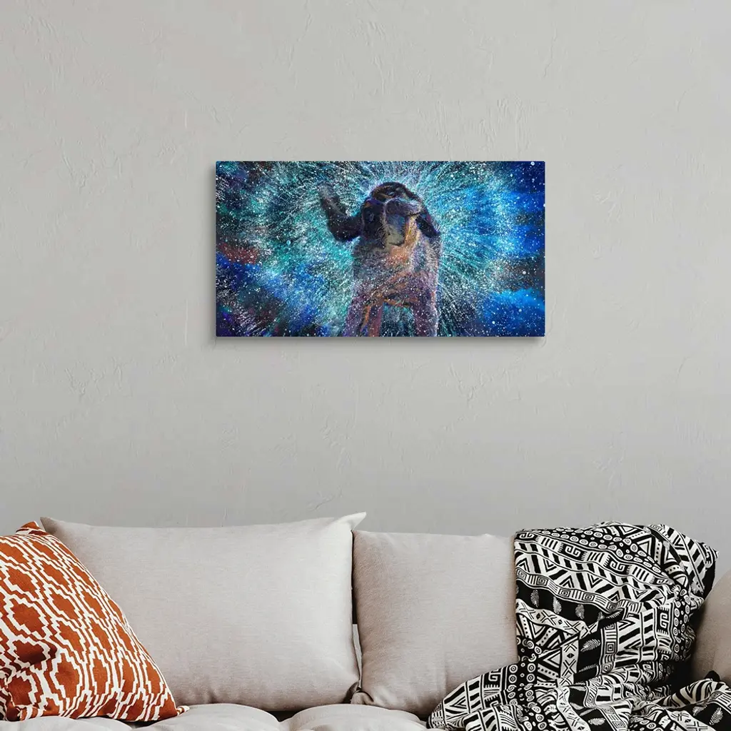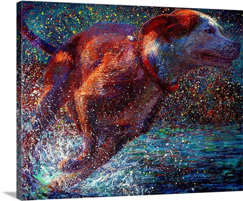 Brightly colored contemporary artwork of a black and white dog shaking off water.